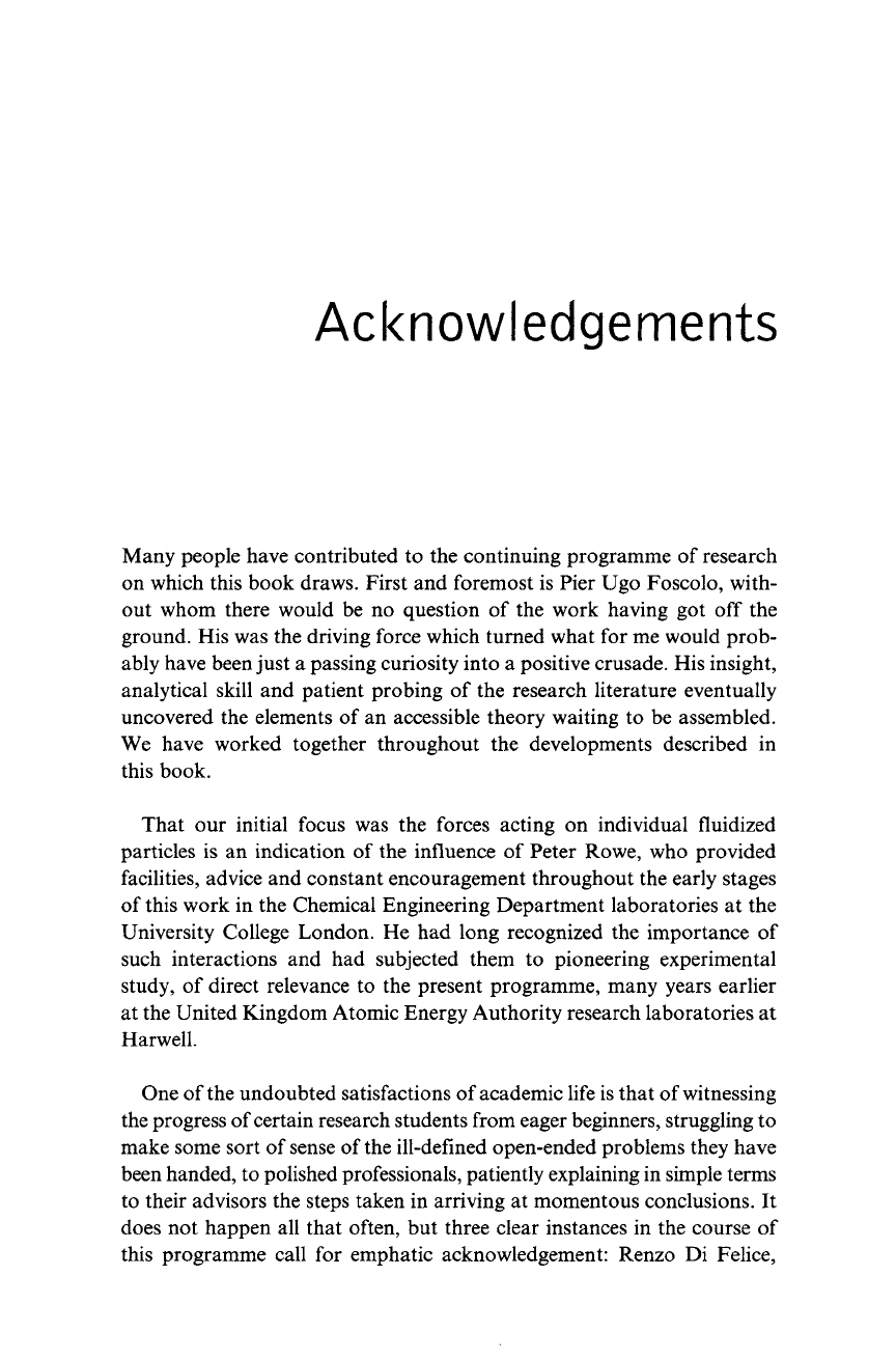 Ac I<n owl edge me nts Many people have contributed to the continuing programme of research on which this book draws. First and foremost is Pier Ugo Foscolo, with- out whom there would be no question of the work having got off the ground. His was the driving force which turned what for me would prob- ably have been just a passing curiosity into a positive crusade. His insight, analytical skill and patient probing of the research literature eventually uncovered the elements of an accessible theory waiting to be assembled. We have worked together throughout the developments described in this book. That our initial focus was the forces acting on individual fluidized particles is an indication of the influence of Peter Rowe, who provided facilities, advice and constant encouragement throughout the early stages of this work in the Chemical Engineering Department laboratories at the University College London. He had long recognized the importance of such interactions and had subjected them to pioneering experimental study, of direct relevance to the present programme, many years earlier at the United Kingdom Atomic Energy Authority research laboratories at Harwell. One of the undoubted satisfactions of academic life is that of witnessing the progress of certain research students from eager beginners, struggling to make some sort of sense of the ill-defined open-ended problems they have been handed, to polished professionals, patiently explaining in simple terms to their advisors the steps taken in arriving at momentous conclusions. It does not happen all that often, but three clear instances in the course of this programme call for emphatic acknowledgement: Renzo Di Felice, Acknowledgements now Professor of Chemical Engineering at the University of Genova, and an established international authority on liquid fluidization, for his continuing active participation in experimental and theoretical aspects of the work too numerous to individualize; Stefano Brandani, formerly of the University of L'Aquila, now Reader in Chemical Engineering at University College London, for initiating the 'jump condition' analysis reported in Chapter 14 (his doctoral research was supervised by the late Gianni Astarita, whose inspired contributions to this and other areas of the work are also gratefully acknowledged); and Zumao Chen, who as my doctoral student at L'Aquila worked on aspects of slugging fluidization described in Chapter 15, and who subsequently, on his own initiative, embarked on the two-dimensional numerical simulation studies reported in Chapter 16, which have now come to represent the starting point for new programmes of computational research. From its inception, the work has involved close collaboration between the fluidization research teams of L'Aquila and UCL, accompanied by shuffling of staff and exchange of students. This remains as strong as ever thanks to the active participation of John Yates, who heads the UCL team. Past members of that group who deserve special mention for their contributions to the initial stages of the work are Simon Waldram and Ijaz Hossain; a more recent addition to the team is Paola Lettieri, who maintains strong connections with L'Aquila; David Cheeseman provides continuity and experimental expertise. Major contributors from L'Aquila include Sergio RapagnS., now Professor of Chemical Engineering at the University of Teramo, Nader Jand and Paolo Antonelli. I am especially grateful to Yuri Sergeev, Professor of Engineering Mathematics at the University of Newcastle, for his contribution to the 'jump condition' studies, and also for his frequently solicited advice on technical problems encountered along the way. His careful reading of the original draft manuscript resulted in many suggestions for improvement, all of which have been adopted. Finally, the man who laid the foundation from which we were able to build: Graham Wallis. His unpublished 1962 paper, which he sent me following the appearance of our early applications of his stability criter- ion, contains a wealth of insight and analysis that, together with his book One-Dimensional Two-Phase Flow, we have drawn on repeatedly through- out the course of this work. His direct participation in the programme, at UCL in 1990, provided an invaluable opportunity to clarify aspects of the theory, and to repeat the key 'raining-down' experiments for measuring xii Acknowledgements dynamic wave speed, which he devised and first performed in Peter Rowe's laboratory in Harwell, and only reported in the unpublished 1962 paper; the method is described in Chapter 9, along with his original results and our more recent ones. xiii