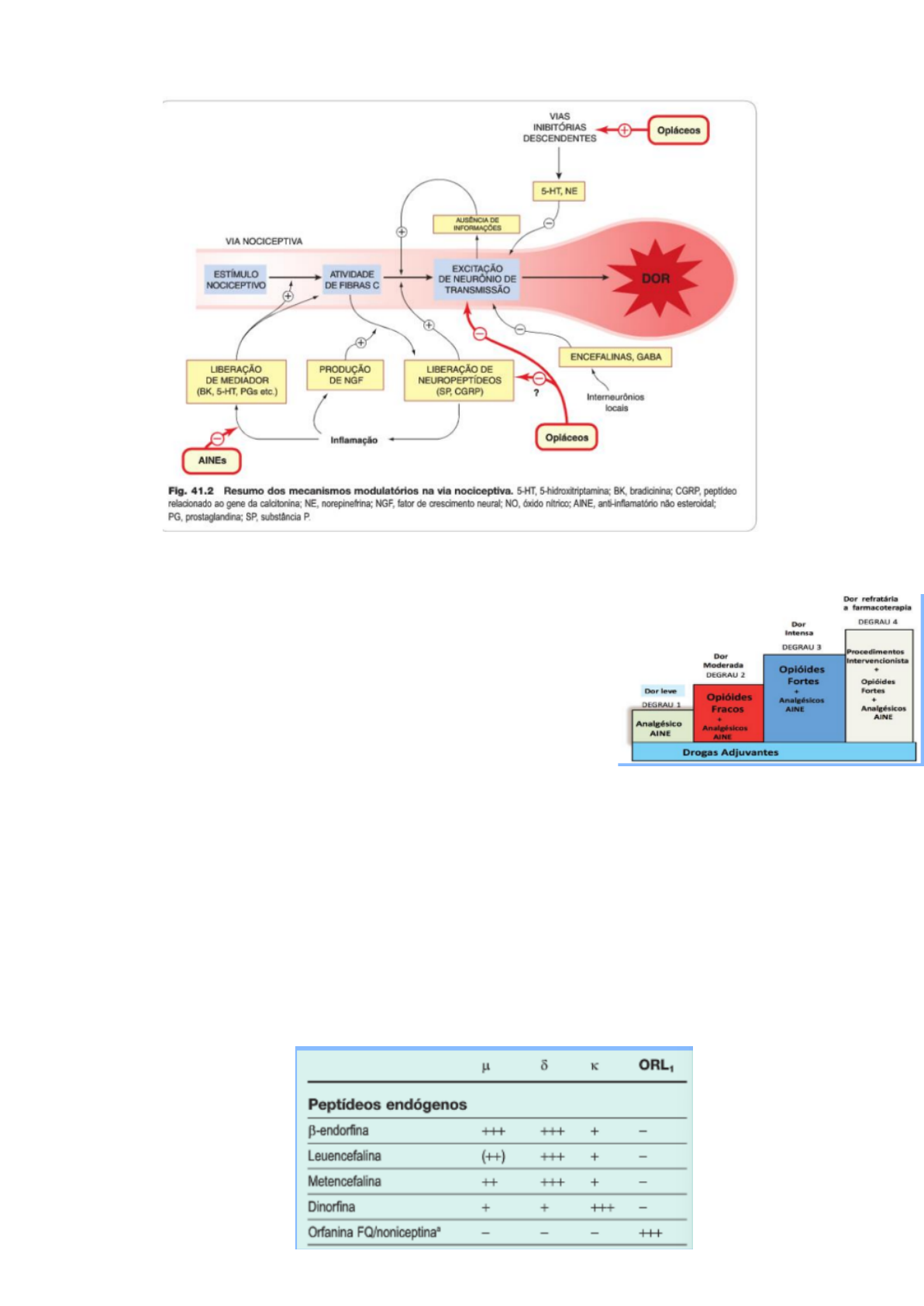 Mecanismo de ação dos medicamentos dos analgésicos Opioides ● agonistas dos receptores opioides: principal classe de fármacos empregada no controle agudo da dor moderada a intensa (progem traumática e inflamatória) ○ outras indicações: dores crônicas, dor aguda relacionada ao câncer ● morfina: principal que interage com os receptores alcaloides→ estrutura natural (ópio, extraída da papoula - Papaver somniferum) ● em geral: sem boa resposta a dor neuropática ● análogos da morfina: principais ○ diacetilmorfina, codeína, oxicodona, naloxona ● derivados sintéticos ○ fenilpiperidinas: petidina; fentanila; alfentanila; sufentanila; tramadol; remifentanila ○ metadona ○ benzomorfano: pentazocina; ciclazocina ○ tebaína: buprenorfina; etorfina ● ligantes naturais (endógenos) dos receptores opioides: encefalina, endorfinas (B-endorfina); dinorfica, neoendorfinas; nociceptinas/ orfaninas ● diferentes receptores possuem mais ou menos afinidade com determinados opioides ● fármacos opioides usados como analgésicos interagem principalmente com o receptores M, que também são os principais envolvidos com a dependência física ● distribuição dos receptores: córtex cerebral, amígdala, tálamo, hipotálamo, mesencéfalo, medula espinhal e periferia nervosa ● agonistas puros: acentuada atividade pelos receptores μ (ex.: etorfina, metadona) ● agonistas parciais (ex.: morfina (forte), codeína, dextropropoxifeno, tramadol (fracos)) ● mistos: grau de atividade agonista k; antagonista μ (ex.: nalorfina e pentazocina) ● antagonistas: ex.: naloxona e naltrexona ● mecanismo de ação analgésica dos agentes opióides ● efeitos adversos: qualitativamente semelhantes entre os opioides, porém podem variar em intensidade ○ sistema cardiovascular: reduzir o tônus simpático→ hipotensão ortostática ○ subgrupo de opioides (esp. morfina) → liberação de histamina → pode contribuir para a hipotensão ortostática por meio de vasodilatação; também causam bradicardia ○ efeitos respiratórios: principais → diminuem a resposta respiratória ao dióxido de carbono e podem causar períodos de apneia + estímulos dolorosos ou outros estímulos de reatividade podem promover a ventilação + sono natural atua de modo sinérgico com os opioides, suprimindo a ventilação ○ náuseas, vômitos e constipação intestinal ○ sistema geniturinário: urgência e retenção urinárias ○ SNC: sedação, confusão, tontura, euforia e mioclonia ○ uso excessivo de opioides→ hiperalgesia paradoxal ● frequentemente associado ao desenvolvimento de tolerância (uso repetido de uma dose constante do fármaco resulta em diminuição do efeito terapêutico) ● mecanismo de ação: receptores de opoioides → fechamento dos canais de cálcio + estímulo ao efluxo de K+→ inibição de neurotransmissores + hiperpolarização celular, respectivamente Agentes anti-inflamatórios não esteroides (AINES) e analgésicos não opioides ● alívio sintomático da dor: fraturas, dores de origem vascular/muscular, lesões teciduais, dores pós-operatória, odontológicas, menstruais, metástases ósseas, cefaleias e enxaquecas, etc. ● podem causar efeitos indesejáveis principalmente em idosos ● inibem a oxidação do ácido araquidônico através da sua atuação nas enzimas ácidos graxos ciclooxigenases (COX) ● prostaglandinas reduzem o limiar de ativação nas terminações periféricas ● atravessam a barreira hematoencefálica e impedem a geração de prostaglandinas neuromoduladores do SNC ● mecanismos (3): (1) prostaglandinas reduzem o limiar de ativação nas terminações periféricas dos neurônios nociceptores aferentes primários + (2) diminuem o recrutamento dos leucócitos → diminuem produção de mediadores inflamatórios derivados dos leucócito + (3) atravessam a barreira hematoencefálica impedem a produção de prostaglandinas que atuam como neuromoduladores produtores de dor no corno dorsal da medula espinal ● associações de AINE-opioides ou de paracetamol-opioides podem atuar de modo sinérgico para reduzir a dor Principais isoformas das enzimas ciclooxigenases ● COX-1 (constitutiva): estômago, rim, plaquetas, SNC, útero ○ citoproteção do TGI (PGE2): aumento da secreção de muco + diminuição de ácido gástrico ○ agregação de plaquetas (TxA2) e anti-agregação (PGI2) ○ dor e inflamação ○ função renal ○ contração uterina ● COX-2 (induzida): macrófago, linfócitos, endótelio ○ dor e inflamação ● COX-2 (constitutiva): RIM e SNC ○ função renal ○ transmissão nervosa ● maioria dos AINES “tradicionais”→ inibem a COX-1 e a COX-2→ variação no grau de inibição ● ação anti-inflamatória e analgésica→ COX-2 (principalmente) ● efeitos adversos gastrointestinais (COX-1), demais efeitos (COX-1 e COX-2) ● compostos seletivos COX-2→ riscos cardiovasculares a longo prazo→medicamentos retirados de circulação ● maioria dos AINES: possui mais seletividade pela COX-2 porém não muito para evitar os efeitos adversos ● agente tanto na via aferente primária quanto nos cornos dorsais da medula espinhal ● COX-1 pode ser usado como agente modulador excitatório ● celecoxibe é um fármaco mais seletivo para COX-2 quando comparado com outros ● AINE e os inibidores da COX-2 atuam tanto na periferia quanto centralmente ● paracetamol não pertence aos AINES em algumas publicações→ analgésico não opioide ○ não interage com COX-2→ sem ação antiinflamatória ○ alguns estudos sugerem que possui ação na COX-3 ○ atua apenas em nível central ● AINE inibidores não seletivos da COX: efeitos adversos deletérios, particularmente de mucosa gástrica e rins ● fenamatos: associados à cólicas menstruais Classificação quanto à seletividade pela COX Antidepressivos ● dor neuropática/ tratamento adjuvante da dor (esp. dor crônica) ○ dor neuropá