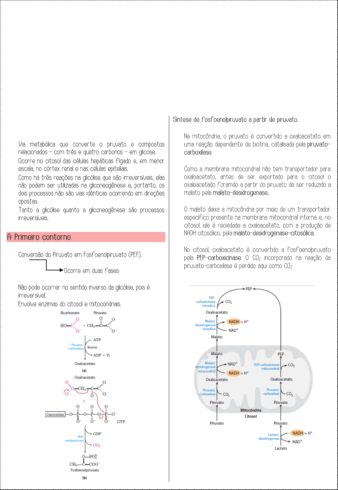 Gliconeogênese Capítulo 14 e Lehninger 01- Características Gerais o o 02- Ciclo de Cori Após exercícios vigorosos, o lactato produzido pela glicólise anaeróbia no músculo esquelético retorna para o fígado e é convertido a glicose, que volta para os músculos e é convertido a glicogênio. 03- Resumo Para cada molécula de glicose formada a partir do piruvato são consumidos: 4 ATP 2 GTP 2 NADH 04- Regulação Piruvato Carboxilase o Acetil CoA (estimulador alostérico) PEP carboxinese o Glucagon (ativa) Frutose 1,6 bifosfatase o AMP (inibidor alostérico) o Frutose 2,6 P (inibidor alostérico) – mais forte! Glicose 6 fosfatase: localizada no RE dos hepatócitos. o O jejum aumenta a expressão (assim como a liberação de glucagon). o O transporte de glicose para dentro do RE é o que regula a gliconeogênese.