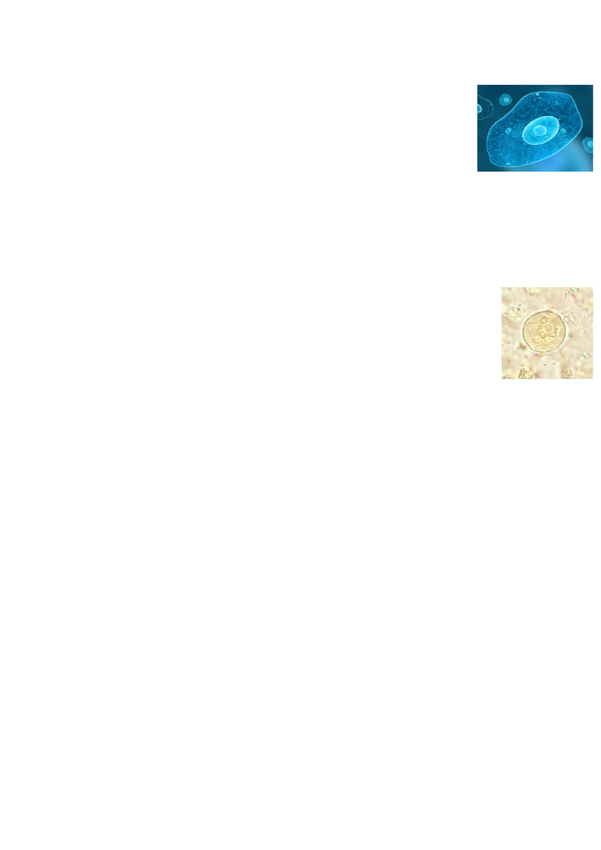 Parasitoses causadas por helmintos e protozoários ● eosinofilia pode estar presente em infecções por protozoários Parasitoses causadas por protozoários Amebíase ● doença infecciosa que atinge o trato gastrointestinal humano causada pelo patógeno E. histolytica (EH) ● agente etiológico: Entamoeba histolytica ○ parasita o cólon humano→ alimenta-se de bactérias e partículas de alimento ○ um dos mais potentes matadores de células, entre os agentes infecciosos ○ capaz de aderir e ingerir bactérias não opsonizadas, contendo galactose (ou NacGlc) na sua superfície ● formas ○ trofozoíto: pleomórfico, ativo, alongado, com emissão contínua e rápida de pseudópodes, parecendo deslizar + normalmente vivem na luz no intestino grosso podendo, ocasionalmente, penetrar na mucosa e produzir ulcerações intestinais ou em outras regiões do organismo, como fígado, pulmão, rim e, mais raramente, no cérebro + essencialmente anaeróbios ○ pré-cisto: fase intermediária entre o trofozoíto e o cisto ○ metacisto: forma multinucleada que emerge do cisto no intestino delgado, onde sofre divisões, dando origem aos trofozoítos ○ cisto: forma infectante + indivíduos infectados excretam até 45 milhões de cistos por dia ● maioria das infecções ocorre pela ingestão de alimentos ou água contaminados com fezes, contendo os cistos da E. histolytica ○ vias de infecção menos comuns: sexo oral e anal; uso de aparelhos de enema contaminados Ciclo monoxênico Biológico ● (1) ingestão de cistos maduros (alimentos ou água contaminados) ● (2) desencistamento no intestino delgado: saída do metacisto através de uma fenda na parede cística. ● (3) metacisto sofre diversas divisões nucleares/citoplasmáticas, , dando origem a quatro ou oito trofozoítos, chamados trofozoítos metacísticos. ● (4) trofozoítos migram para o intestino grosso onde se colonizam, aderidos à mucosa, vivendo como um comensal, alimentando-se de detritos e de bactérias. ● (5) podem desprender da parede e, na luz do intestino grosso, principalmente no cólon, desidratarem e eliminar substâncias nutritivas presentes no citoplasma, transformando-se em pré-cistos; em seguida, secretam uma membrana cística e se transformam em cistos, inicialmente mononucleados → divisões nucleares sucessivas, se transformam em cistos tetranucleados→ eliminados com as fezes normais ou formadas Patogênico ● resulta na amebíase extraintestinal ● (1) trofozoítos invadem a submucosa intestinal ● (2) na submucosa, as amebas podem progredir em todas as direções, determinando inicialmente a típica ulceração chamada “botão de camisa” ou “colo de garrafa”, resultado da necrose liquefativa produzida inicialmente pelas amebas, podendo haver invasão bacteriana secundária, agravando a lesão. ● (3) multiplicam-se ativamente no interior das úlceras e podem, através da circulação porta, atingir outros órgãos, como o fígado e, posteriormente, o pulmão, o rim, o cérebro ou a pele, causando amebíase extraintestinal. O trofozoíto presente nestas úlceras é denominado forma invasiva ou virulenta. Na intimidade tissular, não forma cistos, são hematófagos e muito ativos ● (4) as lesões amebianas são mais frequentes no ceco e na região retossigmoidiana. Quadro clínico Amebíase intestinal ● assintomática: 80 a 90% das infecções; cistos presentes no exame de fezes ● forma diarreica: uma das formas clínicas mais frequentes ○ 2-4 evacuações, diarreicas ou não, por dia, com fezes moles ou pastosas, às vezes contendo muco + desconforto abdominal ou cólicas podem ocorrer + raramente há manifestação febril + alternância entre a manifestação clínica e períodos silenciosos, com funcionamento normal do intestino ● forma disentérica ○ período de incubação: média de um mês ○ mais frequentemente de modo agudo, acompanhada de muco ou de sangue, cólicas intensas, tenesmo (espasmo doloroso do esfíncter anal ou vesical com desejo urgente de defecar ou urinar, e com eliminação de quantidade mínima de fezes ou urina), náuseas, vômitos, podendo haver calafrio e febre + usualmente ocorrem 8-10, ou mais evacuações por dia ○ casos mais graves: inúmeras evacuações mucosanguinolentas, febre elevada e persistente, prostração, dor abdominal e grave desidratação + distensão abdominal e hepatomegalia, sinais de irritação peritoneal (abdome agudo), que pode ser devido à perfuração intestinal + pacientes podem estar com sepse ○ grupos mais vulneráveis para a evolução de formas graves: crianças de baixa idade, grávidas, indivíduos em terapia com corticoides e desnutridos ● colite necrosante ○ invasão do protozoário se estende para camadas mais profundas da parede do cólon, principalmente no hemi-cólon direito, ocorrendo úlceras profundas, isquemia, hemorragia, megacólon tóxico, colite fulminante e às vezes perfuração ○ mortalidade elevada ○ quadro fulminante: febre alta, fácies toxêmica, sinais de choque hipovolêmico, sinais de peritonite, diarreia profusa sanguinolenta e com odor de ovo podre, mais de 20.000 leucócitos no hemograma e distúrbios metabólicos ● ameboma do cólon ○ formação de granuloma na mucosa no ceco, cólon ascendente ou anorretal, com edema e estreitamento do lúmen ○ alternam momentos de diarréia e constipação intestinal ● complicações: até 40% dos casos ○ mais comuns: perfurações e peritonite, hemorragias, colites pós-disentéricas e, mais raramente, estenose, apendicite e ameboma ○ raramente: romper para dentro dos espaços pleural ou pericárdico (geralmente fatais) Amebíase extraintestinal ● qualquer parte do corpo: pulmões, cérebro, trato geniturinário e fígado (mais frequente) ● abscesso amebiano do fígado (forma mais comum) ○ ocorre após a invasão intestinal com quadro de disenteria grave, quando os organismos atingem o fígado pela veia porta, p