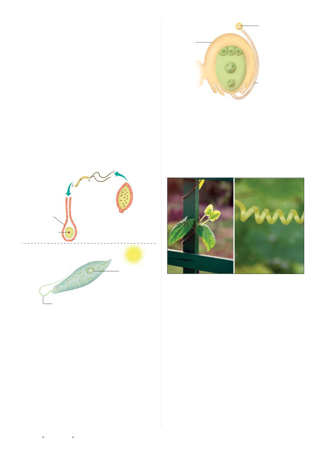 BIOLOGIA Capítulo 20 Movimentos vegetais e fotoperiodismo130 Movimentos vegetais Plantas e algas apresentam movimentos em algumas de suas estruturas. Esses movimentos podem ser desencadea- dos por estímulos ambientais e permitem que o organismo se adapte de acordo com determinada situação. Dentre os movimentos vegetais, podem ser citadas a natação do antero- zoide de uma samambaia em direção à oosfera – relacionada ao processo de reprodução, que assegura a continuidade da espécie – e a inclinação de uma planta em direção à luz – que possibilita maior eficácia na realização de fotossíntese. Há três tipos fundamentais de movimentos vegetais: tac- tismo, tropismo e nastismo. Tactismo Tactismo corresponde ao deslocamento do organismo (ou de alguma estrutura) em meio líquido. É o caso do anterozoide, que nada orientado por substâncias químicas desprendidas pela oosfera; é o que se denomina quimio- tactismo. Já quando uma alga unicelular nada em direção à luz, ocorre o chamado fototactismo (Fig. 1). Arquegônio Anterozoide Oosfera Núcleo Flagelo Luz Fig. 1 Tactismos. No alto, quimiotactismo: anterozoide deslocando-se em direção à oosfera. Embaixo, fototactismo: alga deslocando-se em direção à luz. Tropismo Tropismo é um movimento irreversível que depende da origem do estímulo e que envolve o crescimento de uma estrutura. Há quatro tipos principais de tropismos, classifica- dos em função do estímulo que desencadeia sua ocorrência. • Quimiotropismo É desencadeado por estímulo químico, como o que ocorre quando raízes crescem em busca de água ou de nutrientes minerais no solo. Também ocorre quando o tubo polínico cresce até o óvulo Ele alonga-se em direção ao óvulo, estimulado por substâncias químicas, sem sofrer re- tração posteriormente (Fig. 2) Óvulo Tubo polínico Grão de pólen Fig. 2 Quimiotropismo: tubo polínico crescendo em direção ao óvulo. • Tigmotropismo É determinado por estímulos mecânicos, como o que ocor- re em uma trepadeira, estimulada pelo contato com um suporte no qual enrola seu caule. Algumas plantas têm também gavi- nhas, como o maracujazeiro, a videira e o chuchuzeiro (Fig. 3); essas estruturas provenientes de folhas modificadas enrolam-se em um suporte, o que permite a sustentação da planta nele. Fig. 3 Tigmotropismo: trepadeiras e gavinhas se enroscando em suportes. • Gravitropismo Esse movimento também é conhecido como geotro- pismo e se relaciona com o estímulo da gravidade sobre as plantas. Uma planta jovem, colocada horizontalmente em um ambiente escuro, apresentará curvatura da raiz para baixo e do caule para cima A raiz tem gravitropismo posi- tivo, isto é, cresce no mesmo sentido da gravidade; o caule apresenta gravitropismo negativo, tendo crescimento em sentido contrário ao da gravidade. O gravitropismo é determinado pela distribuição de auxina, transportada do ápice do caule em direção ao ápice da raiz. No entanto, quando a planta é mantida em posição horizontal, ocorre acúmulo de auxina em sua face inferior. No caule, a elevada concentração de auxina estimula o cresci mento, fazendo com que o caule apresente curvatura para cima.Na raiz, a concentração alta de auxina provoca inibição do crescimento; assim, é a face oposta (superior) que apresenta maior crescimento, fazendo com que a raiz cresça para baixo (Fig. 4). M ik e fo to D re a m s ti m e .c o m F ra n k V in c e n tz /W ik im e d ia C o m m o n s F R E N T E 2 131 Se uma planta for colocada horizontalmente, mas sendo mantida em rotação, não apresentará curvatura para cima nem para baixo A rotação não permite que ocorra distribuição desigual de auxina, não se observando nenhum gravitropismo. Fig. 4 Geotropismo ou gravitropismo. Uma planta na posição horizontal tem auxina acumulada em sua face inferior; o caule volta-se para cima (gravitropismo negativo), e a raiz volta-se para baixo (gravitropismo positivo). • Fototropismo Quando o caule e a raiz são expostos à iluminação em uma das faces, há crescimento do caule em direção à luz (fototropismo positivo) e da raiz na direção oposta (fototropismo negativo). No caso do caule, a curvatura é de terminada pelo maior crescimento da parte não iluminada; na raiz, é a parte iluminada que cresce mais O movimento desses órgãos envolve o fluxo de auxina, que é sintetizada na extremidade do caule. Com a exposição do ápice do caule à luz, ocorre desvio de auxina para a face não ilu minada, e o hormônio permanece nessa face até atingir a extremidade da raiz No caule, a elevada concentração de auxina estimula o crescimento, e ele tem curvatura em di reção à luz Na raiz, a concentração alta de auxina provoca inibição; é a face oposta (iluminada) que apresenta maior crescimento, e a raiz cresce com afastamento da luz (Fig 5) O ápice do caule é a região que apresenta sensibili dade à luz e na qual se dá o desvio de auxina; caules cuja ponta foi encoberta ou removida não têm desvio de auxina e não apresentam curvatura Fig. 5 Fototropismo. Em uma planta iluminada em uma das faces, a luz promove deslocamento de auxina para o lado não iluminado. O caule inclina-se para a luz (fototropismo positivo), e a raiz afasta-se da luz (fototropismo negativo). Crescimento normal Crescimento inibido Lado iluminado Lado não iluminado (acúmulo de auxina) Vale salientar o exemplo de movimentação do girassol (Helianthus sp.). Essa planta tem um movimento muito com- plexo, denominado heliotropismo, um tipo de fototropismo, no qual ela movimenta sua inflorescência acompanhando a movimentação do Sol. Nastismo Nastismo, também denominado nastia, é um movi- mento reversível que não envolve deslocamento e que não depende da origem do estímulo. A abertura e o fechamento dos estômatos ilustram bem esse tipo de mo- vimento. A abertura da estrutura ocorre quando uma planta tem boa disponibilidade de água no solo e há presen