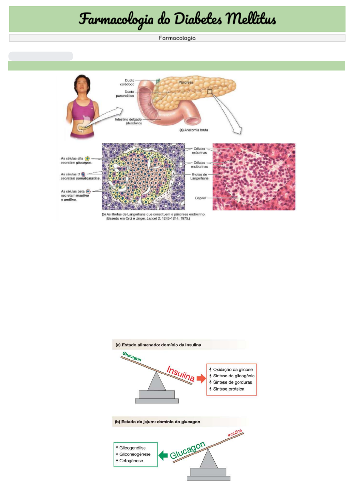 Medicina - 5º Semestre - Ana Paula Cuchera 16 de mar. de 2023 O pâncreas endócrinos - Pós alimentado: ● Predomínio do insulina ● Insulina sinaliza para ter diminuição da glicose plasmática ● Atividade anabólica ● Aumento de Oxidação da glicose, glicogênio, gorduras e proteína - Jejum: ● Predomínio de contrarreguladores - glucagon ● Predomínio de glicogenólise, gliconeogênese (síntese de glicose) e cetogênese ○ Glicogenólise → quebra do estoque de glicogênio ○ Gliconeogênese → faz novas glicoses ● Célula beta pancreática é estimulada a liberar insulina Ometabolismo é controlado pela razão insulina/glucagon 1 Insulina no estado alimentado ● Estimulação parassimpática: estimula secreções digestivas ● Alimento gera distensão na parede ● Presença de carboidratos liberam as incretinas: GLP-1 e GIP, para estimular as células betas pancreáticas a liberarem de insulina = efeito antecipatório Secreção de insulina ● Canal de potássio regulado pelos níveis de ATP intracelular → repouso fica na conformação mais aberta = potássio sai (K+ maior concentração no intracelular) ○ Deixa a célula mais negativa ● Canal de cálcio dependente de voltagem → só abre quando despolariza ○ Com saída de potássio no relaxamento ele não abre - Célula em repouso: 1. Baixa glicose no sangue 2. O metabolismo diminui 3. O ATP diminui 4. O canal de k ATP abre 5. Célula em potencial de repouso → sem liberação de insulina - Células Betas secretam insulina 1. Níveis altos de glicose no sangue 2. O metabolismo aumenta 2 3. O ATP aumenta 4. O canal de k ATP fecha 5. A célula despolariza e o canal de cálcio abre 6. A entrada de cálcio atua como um sinal intracelular 7. O sinal de cálcio desencadeia a exocitose, e a insulina é secretada Receptor de insulina no estado ativado - Efeitos: ● Translocação de transportadores da glicose (particularmente GLUT4) → aumento da captação de glicose ● Aumento da atividade da glicogênio-sintase e da formação de glicogênio ○ A glicose que não foi usada vai virar glicogênio ● Lipogênese ● Múltiplos efeitos sobre a síntese de proteínas ● Ativação de fatores de transcrição que aumentam a síntese de DNA, crescimento e a divisão celular 3 - Receptor de insulina: ● 2 subunidades ○ 2 Alfas: sítio de ligação da insulina ■ A partir da interação da insulina com o ligante terá alteração na conformação do receptor (aproxima) ■ Porção citosólica precisa ser ativada por processo de fosforilação (ricos em tirosina) ○ 2 Betas ■ Quando a insulina liga, as duas alças se aproximam e uma subunidade fosforila a outra → ficará fosforilado OBS! Existem 5 tipos de GLUTs: ● GLUT2 → fígado ● GLUT4 → não fica com o GLUT expresso o tempo todo ○ Eles ficam armazenados em vesícula e precisa da sinalização da insulina para eles saírem e ficarem expostos para captar glicose Diabetes - Consiste em um distúrbio metabólico caracterizado por hiperglicemia persistente, decorrente de deficiência na produção de insulina ou na sua ação, ou em ambos os mecanismos (Diretrizes SBD, 2022). 4 - NORMAL: ● Aumento da absorção de glicose ● Chegam nas célula beta pancreáticas ● Estas liberam insulina que vão até os receptores ● Translocação do GLUT para a membrana ● Diminui glicose plasmática - DIABETES MELLITUS 1: https://www.youtube.com/watch?v=b7mLEE2iFsI ● Deficiência na produção do pâncreas ● Precisa de insulina exógena → insulinoterapia plena - DIABETES MELLITUS 2: https://www.youtube.com/watch?v=pO6PWTOchtA&feature=youtu.be ● Resistência à insulina ● Os motivos podem ser variáveis: ○ Receptor ○ Na cascata ○ Na sinalização → inadequada ● Com o tempo, ele vai tendo problema na produção, por isso precisa da insulina exógena ● Fator ambiental temmuita influência 5 https://www.youtube.com/watch?v=b7mLEE2iFsI https://www.youtube.com/watch?v=pO6PWTOchtA&feature=youtu.be Gerenciamento do DM - Objetivo: deixar o paciente normoglicêmico ● Monitorar pois as flutuações leva a doenças coronariana, neuropatia, problemas no rim, olhos, vascular, etc Intervenções farmacológicas - Objetivos: ● Normalizar glicemia ● Prevenir e diminuir as complicações, a longo prazo Antidiabéticos -Metas para o tratamento do DM: - Hemoglobina glicada não reflete as variações que ele tem no dia - Foi criado o TIR → tempo no alvo (no receptor) ● Se o tempo for mais de 70% é porque está bom 6 A tabela representa conceitos genéricos. Nem todo o paciente pode estar claramente inserido em uma categoria. *As comorbidades crônicas consideradas incluem: câncer, artrite reumatóide. insuficiência cardíaca congestiva, depressão grave, enfisema, doença de Parkinson, infarto do miocárdio, acidente vascular cerebral, insuficiência renal crônica classe Ill ou pior. **Doença terminal entende-se por câncer metastático, insuficiência cardíaca classes 4-5, doença pulmonar crónica demandando oxigenioterapia, pacientes em diálise. - Algoritmo para o tratamento do DM2: - Considerar os parâmetros, tendo como ponto central a hemoglobina glicada ● Direciona as classes de fármacos a ser usada ● Varia de acordo com o estado do paciente - Uso de fármacos: ● Pré-diabetes:Metformina ● Tratamento inicial: Terapia duplas, triplas ou até quádruplas ○ Metformina + antidiabéticos (até 3 antidiabéticos) ○ Não usa metformina quando tem alguma resistência ● Paciente sintomático: terapia baseada em insulina - Prevenção cardiovascular com antidiabéticos em pacientes com DM2 que apresentam doença aterosclerótica: 7 - A escolha do medicamento deve levar em consideração: ● Estado geral e idade do paciente; ● Obesidade; ● Comorbidades presentes (principalmente doença renal crônica diabética e doença cardiovascular); ● Valores das glicemias de jejum e pós-prandial, bem como HbA1c e TIR 