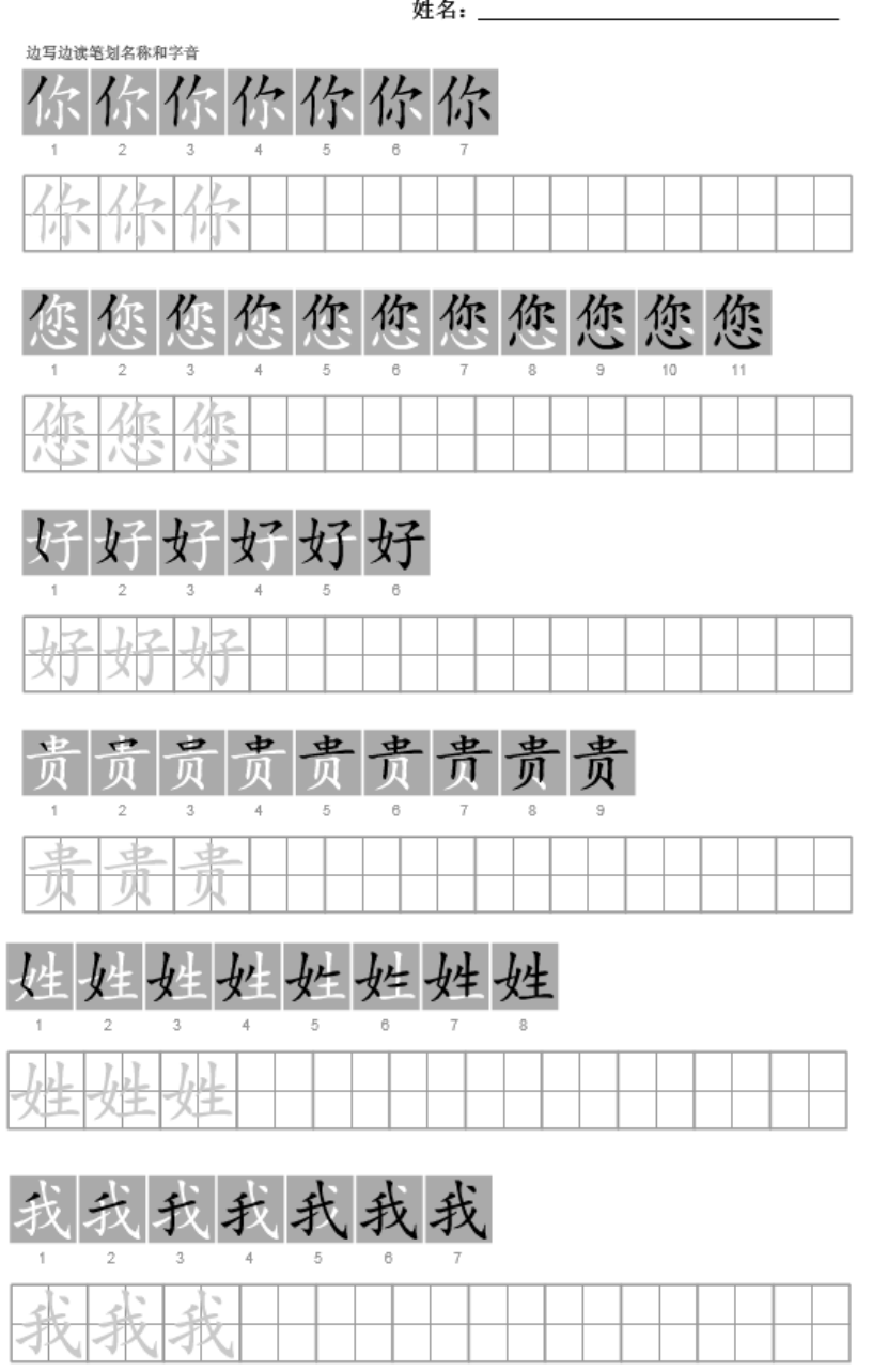 TAREFA 1: Lição1(1) Traduzir(por favou,escrever com pinyin e hanzi junto): 1.olá! 2. Tudo bem? 3.①Estou muito bem ②mais ou menos ③ nao estou muito bem . 4.Olá, colegas! 5.Olá,professora! 6.——Qual é o seu sobrenome? ——Eu chamo... (mais formal) 7.Qual é o seu sobrenome? ——Eu chamo... (mais informal)