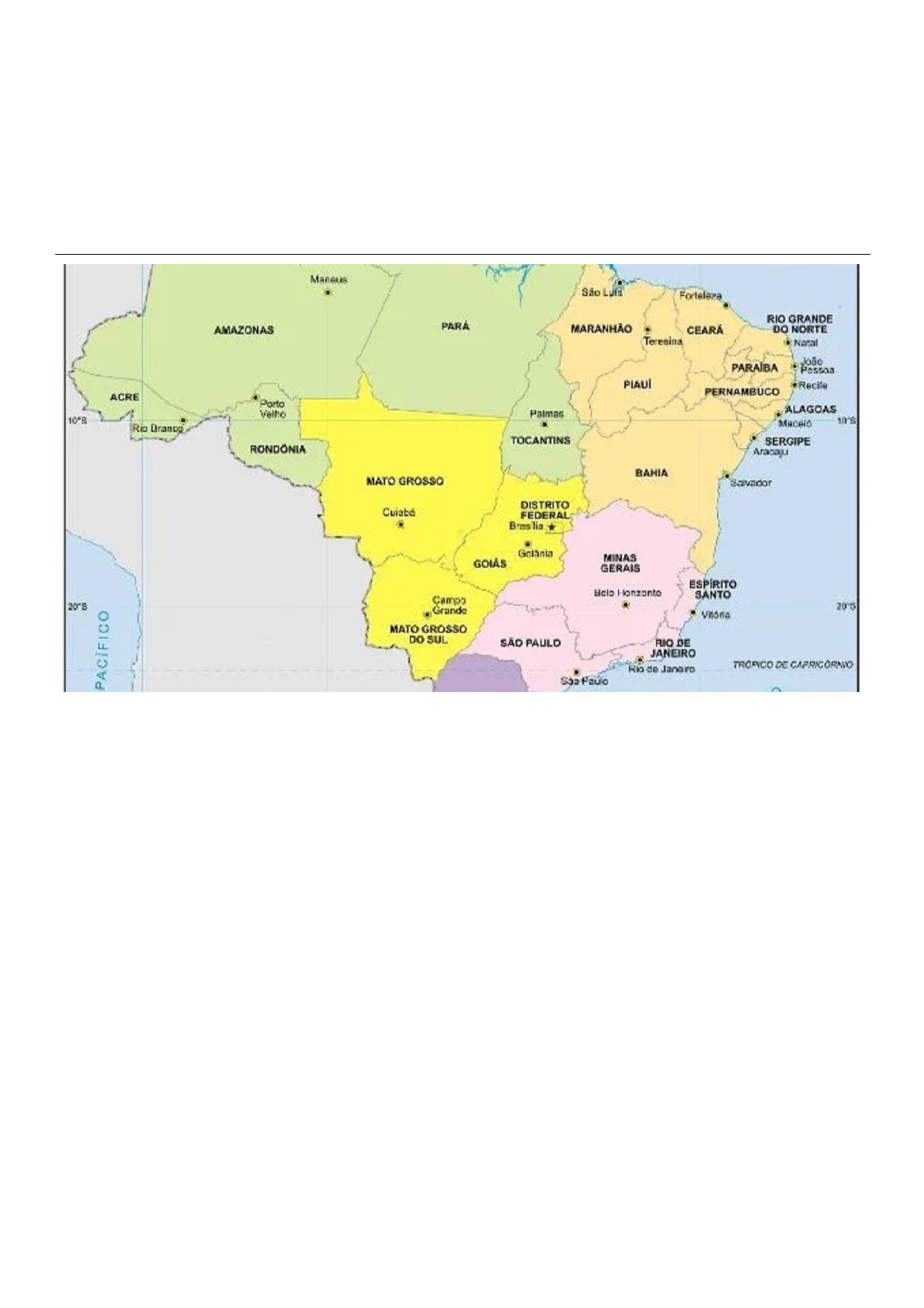 1/10 Capitais do Brasil ⋮ O Brasil possui 27 capitais que estão espalhadas pelas 5 regiões do País: norte, nordeste, sul, sudeste e centro-oeste. No total, o País é composto por 26 estados e 1 Distrito Federal. A capital do Brasil é Brasília. Cada Estado brasileiro possui uma capital. Geralmente, as capitais são consideradas as maiores cidades, as mais desenvolvidas, com mais ofertas de trabalho e que recebem mais recursos públicos. Confira abaixo a tabela das capitais do Brasil com os estados, as respectivas siglas e as regiões: Capitais Estados Siglas dos Estados Regiões Rio Branco Acre AC Norte Maceió Alagoas AL Nordeste Macapá Amapá AP Norte Manaus Amazonas AM Norte Salvador Bahia BA Nordeste Fortaleza Ceará CE Nordeste Brasília* Distrito Federal DF Centro-Oeste Vitória Espírito Santo ES Sudeste Goiânia Goiás GO Centro-Oeste São Luís Maranhão MA Nordeste Cuiabá Mato Grosso MT Centro-Oeste https://www.todamateria.com.br/capitais-do-brasil/ 2/10 Capitais Estados Siglas dos Estados Regiões Campo Grande Mato Grosso do Sul MS Centro-Oeste Belo Horizonte Minas Gerais MG Sudeste Belém Pará PA Norte João Pessoa Paraíba PB Nordeste Curitiba Paraná PR Sul Recife Pernambuco PE Nordeste Teresina Piauí PI Nordeste Rio de Janeiro Rio de Janeiro RJ Sudeste Natal Rio Grande do Norte RN Nordeste Porto Alegre Rio Grande do Sul RS Sul Porto Velho Rondônia RO Norte Boa Vista Roraima RR Norte Florianópolis Santa Catarina SC Sul São Paulo São Paulo SP Sudeste Aracaju Sergipe SE Nordeste Palmas Tocantins TO Norte *a rigor, Brasília não é uma cidade, portanto, não é capital do DF. A Constituição Federal proíbe a divisão de Brasília em cidades, o que pode ser observado pela inexistência de um prefeito municipal. Brasília é, na realidade, sede do Governo do Distrito Federal e também sede do Governo Federal. 3/10 Mapa político-territorial do Brasil com as capitais brasileiras A capital do Brasil A primeira capital do Brasil foi Salvador, na Bahia, de 1549 a 1763, pois o nordeste foi a primeira região a ser colonizada, e também devido ao sucesso do ciclo da cana-de-açúcar na região nordeste. Em 1763, a capital passou a ser o Rio de Janeiro, pois a cana já não apresentava tantos ganhos, e a descoberta do ouro em Minas Gerais fez com que fosse necessário investir no litoral da região sudeste. Em 1960, tivemos uma nova mudança: a capital passou a ser Brasília. O presidente da época, Juscelino Kubitschek, tinha a ideia de povoar a região central do Brasil, e, para isso, planejou a construção de Brasília. Além disso, ter uma capital exposta no litoral era perigoso em caso de possíveis invasões. Capitais da Região Norte 4/10 Estado e Sigla População CapitalEstado e Sigla População Capital Acre (AC) 803,5 mil Rio Branco Amapá (AP) 776,6 mil Macapá Amazonas (AM) 3,9 milhões Manaus Pará (PA) 8,1 milhões Belém Rondônia (RO) 1,7 milhão Porto Velho Roraima (RR) 505,6 mil Boa Vista Tocantins (TO) 1,5 milhão Palmas População segundo estimativa do IBGE (Instituto Brasileiro de Geografia e Estatística) para 2015. Rio Branco, capital do Acre Capital do Acre (AC), Rio Branco, é conhecida por seus atributos naturais. Por isso, é chamada de ‘Cidade Verde’ ou ‘Capital da Natureza’. Localiza-se nas margens do Rio Acre e possui uma população de aproximadamente 350 mil habitantes. Macapá, capital do Amapá Capital do Amapá (AP), Macapá é a maior cidade do Estado. Está localizada às margens do Rio Amazonas e apresenta uma população de aproximadamente 420 mil habitantes. Manaus, capital do Amazonas Capital do maior Estado do Brasil, o Amazonas (AM), Manaus está localizada no centro da Floresta Amazônica e possui aproximadamente 2 milhões de habitantes. Além disso, é considerado o maior centro econômico e financeiro da região norte. Belém, capital do Pará Capital do Estado do Pará (PA), Belém é considerada a capital com maior qualidade de vida da região norte. Conta com uma população de aproximadamente 1,5 milhões de habitantes. Porto Velho, capital de Rondônia Capital de Rondônia (RO), Porto Velho está localizada às margens do rio Madeira, fazendo fronteira com a Bolívia e cidades de outros estados do Brasil. Considerada a cidade mais populosa do Estado, Porto Velho possui uma população de aproximadamente 450 mil habitantes. Boa Vista, capital de Roraima Capital de Roraima (RR), Boa vista está localizada às margens do rio Branco, sendo o município mais populoso do Estado. Apresenta uma população de 300 mil habitantes aproximadamente. 5/10 Palmas, capital de Tocantis Capital do Tocantins (TO), Palmas é conhecida como a “Caçula das Capitais” ou a “Princesinha do Brasil”, uma vez que esse Estado é o mais novo do Brasil. Além disso, Palmas é o maior município do Estado e possui uma população de 250 mil habitantes aproximadamente. Quer saber mais? Leia os artigos: Capitais da Região Nordeste Estado e Sigla População Capital Maranhão (MA) 6,9 milhões São Luís Piauí (PI) 3,2 milhões Teresina Ceará (CE) 8,4 milhões Fortaleza Rio Grande do Norte (RN) 3,4 milhões Natal Paraíba (PB) 3,9 milhões João Pessoa Pernambuco (PE) 9,3 milhões Recife Alagoas (AL) 3,3 milhões Maceió Sergipe (SE) 2,3 milhões Aracaju Bahia (BA) 15,2 milhões Salvador População segundo estimativa do IBGE (Instituto Brasileiro de Geografia e Estatística) para 2015. São Luís, capital do Maranhão Capital do Maranhão (MA), São Luís, é a única cidade brasileira que foi fundada por franceses. Está localizada na ilha de Upaon-Açu, entre as Baías de São Marcos e de São José do Ribamar, sendo banhada pelo Oceano Atlântico. Possui uma população de aproximadamente 1 milhão de habitantes, o que confere o atributo de ser a cidade mais populosa do Estado. Teresina, capital do Piauí Capital do Piauí (PI), Teresina é chamada de ‘Cidade Verde’ por ser bastante arborizada. É o município mais populo