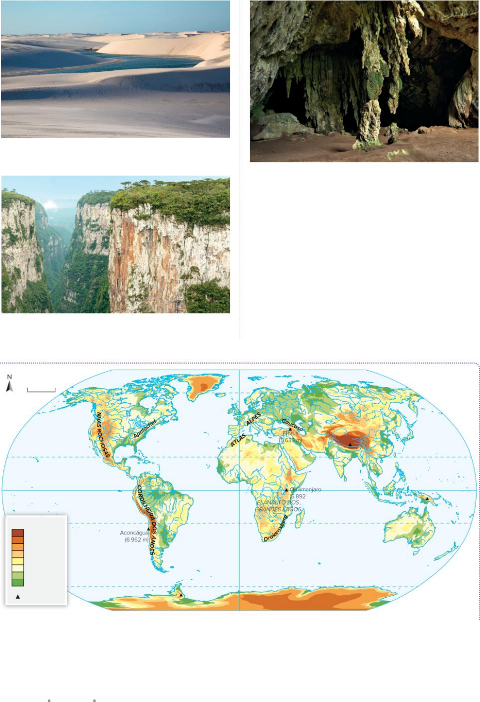 GEOGRAFIA Capítulo 2 Geomorfologia58 Fig. 28 A presença de rochas carbonáticas (calcários e dolomitos) dissolvidas pela água (intemperismo químico) resulta em um ambiente cárstico, que cria condições para formações de cavernas com grande presença de estalactites, estalagmites e colunas. Relevo mundial O relevo mundial é formado por uma grande variedade de formas e altitudes. Essa característica resulta da inte- ração do conjunto de forças endógenas e exógenas do planeta, responsáveis por criar e modelar a superfície terrestre ao longo do seus 4,5 bilhões de anos. O resfriamento do magma, a constituição da litosfera, a formação de rochas, a tectônica de placas e os paleoclimas, tomados em conjunto, explicam as diferenças de altitude e feições do modelado da Terra. Fig. 26 As dunas são montes de areia depositados pela ação dos ventos. Suas feições se alteram constantemente. Fig. 27 Os canyons são vales profundos e escavados que deram origem a pare- dões ao longo da calha de um rio. R o m a n R a h m /i S to c k p h o to .c o m S ie b o ld ia n u s /i S to c k p h o to .c o m N e a n d ro C a rv a lh o /S h u tt e rs to c k .c o m Mundo: relevo Equador Trópico de Câncer Trópico de Capricórnio Círculo Polar Antártico Círculo Polar Ártico 0° 0° M e ri d ia n o d e G re e n w ic h M O N T A M O N T E S U R A IS Vinson (5 140 m) m) Jaya (5 030 m) Everest (8 848 m) HIMALAIA Montes Maoke Montes Ellsworth OCEANO GLACIAL ÁRTICO OCEANO GLACIAL ANTÁRTICO OCEANO ATLÂNTICO OCEANO ÍNDICO OCEANO PACÍFICO OCEANO PACÍFICO N Ob 4 800 3 000 1 800 1 200 600 300 150 0 Altitudes (em m) Picos 0 ESCALA 2 340 km Fonte: elaborado com base em IBGE. Atlas geográco escolar. 8. ed. Rio de Janeiro: IBGE, 2018. p. 33. Ao sobrepormos os mapas hipsométrico (de altitudes), geológico e das placas tectônicas, é possível estabelecer a correlação entre as mais elevadas altitudes com os dobramentos modernos, que, por sua vez, estão associados às regiões de encontro de placas; entre os planaltos e os escudos cristalinos bastante desgastados ao longo dos milhões de anos; e entre essas duas grandes formações com as bacias sedimentares, que apresentam menores altitudes e foram formadas pela lenta deposição de sedimentos. F R E N T E 1 59 Relevo da África África: físico Golf o de Áde n M ar V erm elho Estreito de Gibraltar Trópico de Câncer Mar Mediterrâneo CAD EIA DO AT LAS DEPRESSÃO DE QATTARA DESERTO DO SAARA Mtes. Tibesti C A D EIA A R Á B IC A PLANALTO DA ETIÓPIA PLANALTO DE TADEMAIT PLANALTO DE DJADO PLANALTO DE BAUCHI PLANALTO DE DARFUR Ras Dashen (4 620 m) Cameroon (4 100 m) Tbukal (4 167 m) Emi Koussi (3 415 m) Is. Canárias I. Madeira I. Soco tra Cabo das Palmas Cabo Verde DESERTO DA NÚBIA 0 ESCALA 800 km Canal de Suez Fonte: elaborado com base em IBGE. Atlas geográco escolar. 8. ed. Rio de Janeiro: IBGE, 2018. p. 44. O litoral africano é o menos recortado entre todos os continentes da Terra. Nesse continente predominam os maci- ços antigos que sustentam planaltos bastante desgastados, entre eles o Planalto da Etiópia e o de Bié. Três importantes exceções que se destacam nesse relevo são: y Cadeia do Atlas: dobramentos modernos, com montanhas com mais de 3 mil metros de altitude e outras com mais de 4 mil metros, localizados no noroeste do continente, estendendo-se pelos territórios do Marrocos, Argélia e Tunísia, a oeste da região conhecida como Magreb ("poente" ou "ocidente" em árabe); y Bacia do Congo: bacia sedimentar localizada no centro-oeste do continente africano, que compreende República Democrática do Congo, República do Congo, Gabão, Camarões, República Centro-Africana e Guiné Equatorial. Sobre ela existe uma importante bacia hidrográfica que recebe o mesmo nome, derivado de seu principal rio, o segundo maior do mundo em volume de água (perdendo apenas para o Amazonas), e também a segunda maior floresta do mundo; y Planalto dos Grandes Lagos e o Rift Valley: localizado na região centro-leste do continente africano, esse planalto destaca-se pela formação de altas cadeias de origem vulcânica (Monte Quênia, com 5 199 m, e Monte Quilimanjaro, com 5 892 m), com uma vasta área de falhamentos em seu interior. Esses falhamentos provocaram o rebaixamen- to dos terrenos, formando a região denominada Rift Valley, na qual surgiram grandes lagos como o Tanganica, na Tanzânia, e o Niassa, no Malawi. Rift Valley O rifteamento é o processo de formação de bacias oceânicas por meio da fragmentação dos continentes. O Rift Valley (Vale do Rift, ou Vale da Grande Fenda) é um vale de grandes dimensões que resultou da distensão da crosta terrestre. Originou-se de um complexo de falhas tectônicas formado há 35 milhões de anos pela separação das placas Africana e Arábica e estende-se por cerca de 5 000 km de norte a sul, com largura entre 30 e 100 km. Saiba mais O continente africano é rico em recursos minerais e combustíveis fósseis. Nos escudos cristalinos concentrados mais ao sul do continente, são explorados ouro e diamante (destaque para a África do Sul). Já nas bacias sedimentares, comuns na porção centro-norte do continente, é extraído o petróleo, principalmente em Angola, Nigéria, Argélia e Líbia. GEOGRAFIA Capítulo 2 Geomorfologia60 Relevo da América As Américas do Norte e do Sul têm um relevo bastante parecido. Na costa oeste de cada uma delas, encontramos dobramentos modernos sustentando amplas cordilheiras de montanhas. A estrutura recentemente dobrada (período Terciário ou Paleógeno) confere aos dobramentos modernos uma altitude bastante elevada. Na costa leste, há dobramentos antigos (do Pré-Cambriano), formando planaltos bastante desgastados, com altitudes mais modestas. Na região central, entre essas duas estruturas de formas mais elevadas, há uma grande bacia sedimentar, por onde se estendem grandes planícies ou depressões e planaltos de baixa altitude. América do Sul: