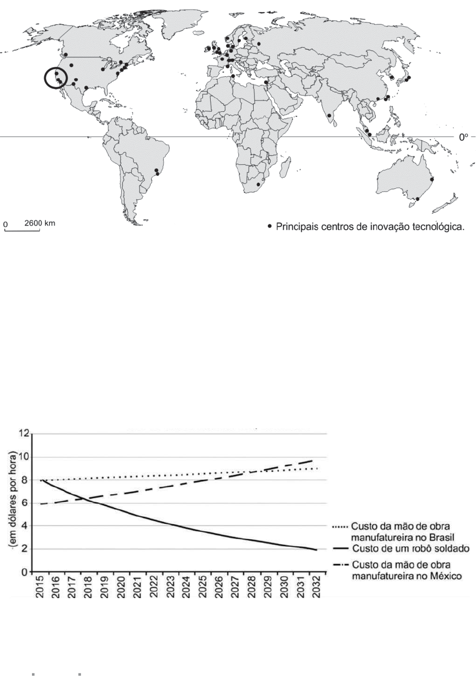 GEOGRAFIA Capítulo 3 Indústria262 18 Fuvest 2013 Os centros de inovação tecnológica são exemplos de transformações espaciais originados da chamada Terceira Revolução Industrial. centros de inovação tenológia PNUD, 2001. (Adapt.). Com base no mapa e em seus conhecimentos: a) aponte duas características da Terceira Revolução Industrial que favoreceram o aparecimento dos centros de inovação tecnológica. Explique. b) identifique e caracterize o conjunto de centros de inovação tecnológica destacado na porção sudoeste dos Estados Unidos. 19 Unicamp 2020 O atual avanço tecnológico permite produzir robôs de tamanho manejável e facilmente incorporados às estruturas produtivas ou à prestação de serviços. Em 2015, o custo de um robô soldador era de 8 dólares por hora, o equi- valente ao custo da mão de obra para o mesmo trabalho no Brasil. (Adaptado de CEPAL, La ineficiencia de la desigualdad, Santiago, 2018. p. 148. Disponível https://repositorio.cepal.org/bitstream/handle/11362/43442/6/S1800059_es.pdf. Acessado em 15/09/2019.) Brasil e Méxio: evolução do usto médio de um robô soldador e da mão de obra manufatureira, 2015-2032 a) Qual era relação entre o custo da mão de obra e a localização das indústrias transnacionais na segunda metade do século XX? Como a robótica poderá alterar essa relação? b) Considerando a atual situação de desigualdade social do México e do Brasil, indique duas possíveis consequên- cias do uso intensivo dessa nova tecnologia. F R E N T E 2 263 20 Unesp 2018 Considere a imagem e o excerto (Renato Cruz. http://link.estadao.com.br, 04.09.2011. Adaptado.) Após décadas de perplexidade e frustração, o mundo ainda está tentando descobrir o segredo do sucesso dessa região. Países de todo o mundo estão fazendo o melhor que podem para copiar sua magia. Na China, por exemplo, empresas de vários ramos da indústria aumentaram seus investimentos em setores considerados cruciais para o sucesso observado em aproximadamente 64% ao ano, durante os últimos cinco anos. (Barry Jaruzelski. www2.uol.com.br. Adaptado.) a) O excerto e a imagem dialogam ao retratarem uma importante região. Identifique que região é essa e cite uma de suas características. b) Cite dois setores considerados cruciais, nos quais se deveria investir, para tentar copiar a “magia” dessa região. 21 UFV O complexo siderúrgico de grande porte no país originou-se, principalmente, de vultosos investimentos estatais. Produzindo e vendendo aço a custos subsidia- dos, o Estado financiava a implantação das indústrias de bens de consumo duráveis. Em relação ao complexo si- derúrgico, qual das afirmações a seguir está incorreta? A A criação da CSN obedeceu a prioridades estraté- gicas do Governo Vargas, que pretendia utilizá-la como estímulo à industrialização. B A Cosipa, em Cubatão, foi criada para receber car- vão vindo do porto de Santos e minério de ferro proveniente de Carajás. C A Usiminas nasceu como uma reação dos políticos e empresários mineiros à opção federal de criação da CSN no Rio de Janeiro. D O Quadrilátero Ferrífero foi, durante muitos anos, a principal área produtora de minério de ferro do país. E A concentração da siderurgia e da metalurgia trans- formou Minas Gerais em um dos grandes polos metalúrgicos do país. 22 UCS 2015 O processo de industrialização brasileiro pode ser dividido em quatro fases, sendo a primei- ra, entre 1808 a 1929, caracterizada como pequena e insuficiente; a segunda, entre 1930 a 1955, carac- terizada pela industrialização nacionalista; a terceira, entre 1956 a 1990, caracterizada pela industrialização impulsionada por capitais estatais, nacional e transna- cionais e a quarta fase, a partir dos anos 1990. Sobre esta quarta fase, assinale a alternativa correta. A Consequência de uma realocação geográfica do capitalismo mundial, típica do processo de globa- lização, que culminou em significativo crescimento das trocas comerciais entre os países, conduzindo a um importante incremento dos investimentos das empresas transnacionais nos países subdesenvol- vidos emergentes, como o Brasil. B Caracterizada pelas atividades econômicas dispersas pelo territrio nacional, voltadas quase que integral- mente para o mercado externo, com eliminação das barreiras alfandegárias, importação de máquinas e equipamentos, comprados principalmente da Ingla- terra, culminando numa dependência externa, que se expressa na formação dos blocos econômicos. C Acelerado ritmo de industrialização em virtude da crise cafeeira, baseia-se no capital nacional de diversos setores, cuja força de trabalho é oriunda principalmente do campo, promovendo o aumento das cidades e metrpoles, bem como do mercado consumidor, em parte, subsidiado pelo capital esta- tal, que modernizou a infraestrutura e multiplicou as indústrias de base. D Caracterizada, como o que inegavelmente alguns autores denominam de industrialização tardia, se comparada àquela verificada em fins do século XVIII, no Reino Unido, que liderou a Revolução Industrial. Apesar da diferença no tempo e espaço, essa fase em nada perde para o processo de industrialização verificado nos países mais industrializados. E Fase da construção das grandes usinas hidrelétricas que impulsionam e abastecem a energia motora da indústria brasileira. marcada pelo grande estímulo às indústrias pesadas, como naval e mecânica. Para atrair investimentos estrangeiros e dinamizar a indús- tria, promoveu-se a abertura das fronteiras ao capital internacional mediante incentivos fiscais e tarifários. GEOGRAFIA Capítulo 3 Indústria264 23 Unesp 2012 Entre o final da década de 1960 e o início da década de 1970, a economia brasileira obteve altos índices de crescimento. O fenômeno se tornou conhe- cido como milagre econômico e derivou da aplicação de uma política que provocou, entre outros efeitos: A êxodo rural e increme