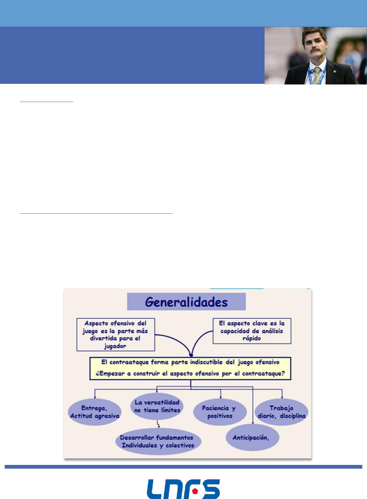 LA PIZARRA DE JESUS CANDELAS LECCIÓN: CONTRAATAQUE EN FÚTBOL SALA 1 Introducción En el momento en que un equipo ha entrado en posesión del balón trata de trasladar el balón hacia la portería contraria, con la máxima rapidez y seguridad posible, tratando de conseguir bien una situación de superioridad numérica ofensiva, o bien una situación de igualdad numérica reducida, o bien una situación de ventaja táctica (atacando sobre jugador con problemas de faltas o sobre emparejamientos defensivos con desventaja física) para obtener un chut con alto porcentaje de acierto antes de que la defensa se organice. Principios básicos del contraataque: 1. Amplitud: aprovechamiento del espacio socio motriz. 2. Apoyos: creación y mantenimiento de líneas de pase. 3. Profundidad: separar líneas defensivas. 4. Pases: oportunidad en el pase 5. Continuidad LA PIZARRA DE JESUS CANDELAS LECCIÓN: CONTRAATAQUE EN FÚTBOL SALA 2 ¿Por qué utilizar el contraataque? Permite finalizar con relativa facilidad, aún en situaciones de igualdad numérica por razones de espacio. Genera las posesiones más eficaces (duración, nº elementos utilizados). Acostumbra a los jugadores a tomar decisiones más rápidas. La capacidad de análisis rápido es la clave para tener éxito en cuantos movimientos podamos realizar. Desarrolla la versatilidad de los jugadores. Inculca ser agresivo en ataque. Permite obtener faltas, bien por situaciones de ventaja o por situaciones de superioridad numérica. Determina claramente el ritmo del partido. Obliga al contrario a tener preparado y anticipar el balance defensivo. Suma jugadores en el ataque, jugadores no habilidosos en el ataque estático. Combate los cambios defensivos y las defensas alternativas. Es el mejor concepto ofensivo contra defensas presionantes, zonas y macht-up. Genera importantes ventajas en las anticipaciones. Aumenta la concentración del jugador. Como metodología de entrenamiento, obliga a los jugadores a trabajar a mayor velocidad, divierte a los jugadores y ayuda a mejorar el trabajo del aspecto defensivo. Entre los factores psicológicos a favor podemos señalar el hecho de que genera finalizaciones fáciles; ayuda a mejorar aspectos defensivos; contribuye a aumentar la agresividad de los jugadores y su espíritu de lucha; así como mejora la cohesión de grupo. LA PIZARRA DE JESUS CANDELAS LECCIÓN: CONTRAATAQUE EN FÚTBOL SALA 3 Entre los factores psicológicos en contra del equipo contrario señalamos el recibir contras fáciles, afecta a su tiempo de juego y genera preocupación en el balance defensivo. ¿Qué desventajas puede conllevar el contraataque? En algunas circunstancias genera problemas defensivos, especialmente en la 2ª defensa después del chut (rechace) y en el balance defensivo, por estar más pendiente de salir corriendo. Puede provocar un individualismo excesivo Aumenta el número de errores y pérdidas de balón por exceso de velocidad y precipitación Mayor dificultad en el control del ritmo de juego. El jugador da poco valor a la posesión del balón. LA PIZARRA DE JESUS CANDELAS LECCIÓN: CONTRAATAQUE EN FÚTBOL SALA 4 Recomendaciones metodológicas para efectuar el contraataque El contraataque procurará explotar al máximo la disminución de las posibilidades contrarías como son: no asegurar el equilibrio defensivo y el repliegue, aprovechando los errores que cometan en sus desplazamientos y marcajes y haciendo que el equipo adversario tenga una menor resistencia específica, tanto por los jugadores más retrasados, como por el resto. El desarrollo y perfeccionamiento del contraataque se hace mediante la utilización sistemática en el contexto del entrenamiento de ejercicios específicos, donde para obtener un incremento de rendimiento progresivo es necesario un tiempo prolongado de preparación. En general, el entrenador conciencia en defensa al jugador que actuara de punta por la parte opuesta de la acción de finalización. En la preparación del contraataque aparecen dificultades provenientes de encontrar el momento de puesta en acción y chut a portería, así como el recibir el balón. El entrenador debe constatar mediante la observación cuales son las mas débiles y actuar en consecuencia. Para incrementar las exigencias de los atacantes y del portero, en los ejercicios se introducirán defensores que determinaran el grado de oposición. En cada actuación el jugador que determina el contraataque será doblado por un compañero, que deberá sincronizar las acciones con este, finalizando cuando finalice el contraataque o continuando con la segunda fase del ataque. El concepto del jugador que actúa como punta, desde el punto de vista de juego especifico es una necesidad. Por ejemplo: La recepción del balón conlleva dificultades. El balón que es pasado va demasiado adelantado o retrasado, demasiado fuerte, demasiado alto o bajo. LA PIZARRA DE JESUS CANDELAS LECCIÓN: CONTRAATAQUE EN FÚTBOL SALA 5 Igualmente aparecen errores al realizar la conducción del balón. Superficie inestable, agua en pista, etc. Con frecuencia sucede que después de recibir el balón intervenga el portero contrario. Errores más frecuentes efectuados en el contraataque: No anticipar el momento de salida. Velocidad de desplazamiento no correspondiente. Desplazamiento de los jugadores que balón como puntas por espacios no útiles. No realizar el desmarque del defensor. Chut erróneo del contraataque. No sincronizar los jugadores que actúan como puntas con el pase. Criterio limitado de la situación táctica existente. No finalizar en un porcentaje correcto 60%. Falta de preparación de los jugadores como puntas. Modelos y estructuración de las tareas de entrenamiento del contraataque: Todos los ejercicios presentados se pueden unir a la 2ª fase del ataque (CONTRAATAQUE SOSTENIDO – Esta se continua por la preocupación del ataque rápido) a) EMPLAZAMIENTO: Los jugadores especializados como puntas del ataque se situarán en el c