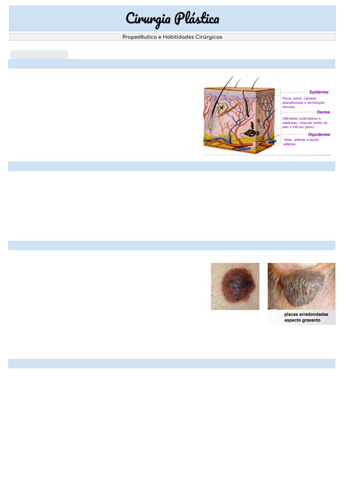 Medicina - 5º Semestre - Ana Paula Cuchera 17 de fev. de 2023 Superfície corpórea - Pele → temas importantes ● Maior e mais pesado órgão corpo (8% peso) - Anatomia: 3 camadas ● Epiderme → externa ● Derme → intermediária ● Hipoderme → profunda OBS! Anexo → relacionado a derme - Quanto mais profundo o dano menos chance de recuperação, uma vez que pega as células tronco Tumores cutâneos - NEOPLASIAS BENIGNAS - Neoplasias Epiteliais Benignos: “potencial de malignidade” ● São comuns ● Crescimento lento, limitado e local ● Não produz metástase ● Geralmente não sofrem transformação maligna 1- Queratose Seborreica 2- Queratose Actínica 1- Queratose Seborreica - Maior que 40 anos - Lesão castanho claro, escuro ou enegrecido - Face, tronco e couro cabeludo (não mucosas) - Aspecto rugoso e superfície irregular - Importância clínica → estética - Clínica: ● Cor escura ● Aspecto assimétrico - não é liso e um lado é diferente do outro ● Crescimento rápido - Diagnóstico diferencial:melanoma (pode confundir) 2- Queratose Actínica - Grande associação lesão DNA → luz UV ● Pele clara ● Exposição solar crônica ● Incidência: idade e exposição solar OBS! Passar protetor solar para evitar, pois ela tem capacidade de diferencial e virar maligno. - Características: ● Pequenas ● Coloração vermelha ou marrom-acastanhada ● Ásperas ao toque ● Áreas expostas sol ○ Rosto, braços, dorso mãos, ombro, couro cabeludo, etc. ○ Usar boné e passar protetor solar 1 OBS! Geralmente idoso tira a casca - Evolução: ● Regridem ● Permanecem estáveis ● Podem se tornar malignas Tumores cutâneos - NEOPLASIAS MALIGNAS - Neoplasias Epiteliais Malignas: "Câncer de pele” CBC → Carcinoma Basocelular CEC → Carcinoma Espinocelular - Dentro dos outros (1-5%), vem o melanoma: ● 75% mortalidade (grave) incidência crescente alta risco metástase OBS! É o mais grave de todos, muitas vezes as pessoas não cuidam por pensarem que é uma pinta - Ele não cresce na superfície, ele cresce para dentro e da metástase. - Fatores predisponentes: ● Pele clara sardas ● Ruivos ● Albinos ● Fototerapia → aumenta 270 vezes a chance de ter câncer (câmaras de bronzeamento) ● Hereditariedade ● Radiação - Pele: ● Epiderme ○ Células basais ○ Melanócitos ● Derme ○ Derme papilar (onde preenche as papilas dérmicas) ○ Derme reticular (tem colágeno) ● Hipoderme OBS! Quando as células basais se diferenciam até chegar em cima Células basais → célula escamosa → célula granulosa → Estrato lúcido → estrato córneo - CEC → vem da célula escamosa - CBC → vem das células basais - Melanoma → vem dos melanócitos 2 - Coloração de pele: ● É dada de acordo com a distância dos melanócitos ● Quanto mais distante → mais claro ● Quanto mais perto → mais escuro ● Semmelanócito → albino OBS! Os melanócitos produzemmelanina, quanto mais melanina maior a proteção solar - Fitzpatrick → quanto maior o grau, maior a quantidade de melanócito ● Grau 6 → negro ● Grau 7 → negro zulu - Neoplasia Epiteliais Malignas: 1. CBC - Carcinoma Basocelular 2. CEC - Carcinoma Espinocelular 3. Melanoma - Células basais → totipotentes - Células espinhosas (camada escamosa) - Célula granulosa (camada granular) - Células queratina (Estrato córneo) - Focar na epiderme: ● Melanócitos ● Célula basal ● Células escamosas 1- CBC → Carcinoma Basocelular - Mais frequente (70 - 80%) - Idade > 30 anos. (85% entre 40-79 anos) - Fatores predisponentes: exposição solar, pele caucasiana - Localização mais comum: face (95% cabeça e pescoço e 25- 30% nariz) - Crescimento lento e localizado; raro metástase; Tumor “pouco agressivo” ● Ele é “benigno”, então respeita a barreira da derme → fica só na epiderme ● Cresce para lateral e para cima ● É uma lesão nodular → cresce para fora 3 - Clínica: ● Bordas nítidas ● Elevada ● Rósea ● Aspecto perolado ● Liso ● Brilhante ● Telangiectasia → vasos em volta ● Eventualmente prurido ● Sangramento e ulceração. OBS! Pelo tumor ser benigno, às vezes as pessoas não fazem a cirurgia com borda de segurança - Fica um resto perto da cicatriz - As células restantes começam a crescer, mas ela não consegue passar o tecido cicatricial - Ele vai crescendo para todos os lados e com a cirurgia há dano na barreira da derme - Ela então consegue passar e vai invadindo a derme - O crescimento é lento, mas depois ele encontra tecido amolecido, como cartilagem e gordura (orelha, olho, etc) e invade - Essa invasão é grave e a pessoa acaba perdendo nariz, orelha, olho, etc. - Leva anos o crescimento 2- CEC → Carcinoma Espinocelular - 2º prevalente - Comum áreas expostas sol (orelhas, rosto, couro cabeludo, pescoço, etc) - Lesões precursoras - 19% metástases linfáticas - Clínica: (Fase avançada) ● Lesão eritematosa ● Circundada - halo inflamatório ○ Como cresce rápido o organismo manda sangue para o local e com isso forma o halo ○ A partir do halo marca a margem para cirurgia ● Ulcerada ○ pelo crescimento rápido, não consegue seguir o crescimento ● Crosta friável ○ Solta descamações ● Sangra ● Examinar linfonodos ○ Pois 19% atinge os linfonodos 4 OBS! Pode confundir com queratose actínica → faz biópsia para diferenciar - Geralmente é mais elevado o CEC - Lesões precursoras: “qualquer lesão estiver crescendo, coçando, sangrando ou mudando característica > 4 sem → sugestivo câncer pele.” - Pode ser: 1. Queratose actínica: ○ Lesão avermelhada ○ Áspera 2. Úlceras cicatriz crônica – Úlcera Marjolain - CEC ○ Diagnóstico geralmente é tardio e prognóstico pior OBS! Qualquer anomalia no meio da úlcera que demora para fechar é preciso fazer biópsia, pois há chance de ser carcinoma espinocelular (CEC) 3. Úlceras de áreas irradiadas ○ Onde tomamos sol