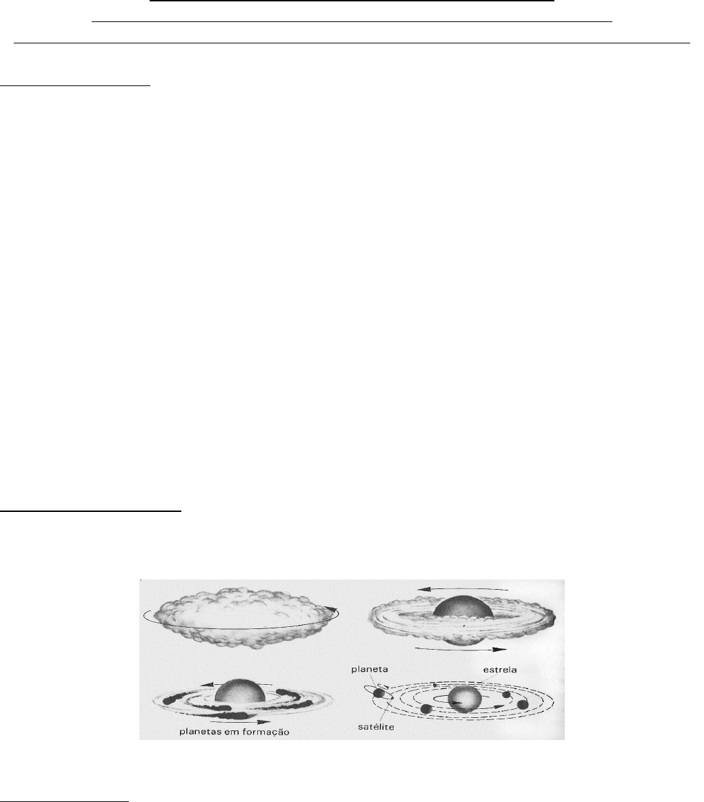 COLÉGIO PEDRO II – CAMPUS SÃO TIJUCA II - CIÊNCIAS – 6º ANO ATIVIDADE COMPLEMENTAR 1: A FORMAÇÃO DO UNIVERSO e DO SISTEMA SOLAR NOME: _______________________________________________Nº: _______________ TURMA: __________ A formação do universo A teoria científica que explica a origem do Universo mais aceita atualmente é a Teoria do Big Bang. Segundo esta teoria, toda a matéria que existe estaria, há cerca de 15 bilhões de anos atrás, extraordinariamente concentrada em um só ponto. Repentinamente, toda a matéria contida neste ponto foi se expandindo e se fragmentando dando origem a imensas nuvens de gás e poeira. Essas nuvens, chamadas nebulosas, são grandes massas de matéria e, dentro delas, os gases foram se concentrando em determinadas regiões. Nos pontos onde a quantidade de matéria era suficientemente grande para que a temperatura alcançasse cerca de 15 milhões de graus Celsius, começaram as reações nucleares, ou seja, os núcleos dos átomos (partículas infinitamente pequenas que formam a matéria) se fundiram. Átomos de hidrogênio se transformaram em hélio, liberando enormes quantidades de energia na forma de luz e calor. Nasciam as estrelas. Devido à força gravitacional, os gases e as estrelas recém-formadas foram atraídos formando áreas de material mais denso, os agrupamentos galácticos ou galáxias que podem apresentar bilhões de estrelas. Nossa galáxia é a Via Láctea. Nossa estrela é o Sol. Ele transforma toneladas de hidrogênio em hélio a cada segundo. O Sol possui combustível suficiente para produzir energia e sustentar a vida na Terra por mais 5 bilhões de anos aproximadamente. A formação do Sistema Solar Nosso Sistema Solar começou a se formar a mais ou menos 5 bilhões de anos. O que sobrou da matéria que formou o Sol, foi se agrupando, dando origem aos planetas e seus satélites. (Fig. 1) Fig. 1: Hipótese para os estágios de formação de uma estrela e seus planetas. A formação da Terra A Terra é um dos planetas que giram em torno do Sol. É o nosso lar e, devido à sua distância do Sol, ela recebe a quantidade certa de luz e calor para permitir que a água se apresente no estado líquido, ao contrário dos demais planetas do sistema solar. Sua atmosfera atual é composta, principalmente, de nitrogênio e oxigênio. Além disso, apresenta uma camada de um gás protetor, o ozônio. Essa camada permitiu que animais e vegetais se desenvolvessem fora da água e conquistassem o ambiente terrestre. Mas a Terra nem sempre foi assim. Ela também se formou da matéria que sobrou da formação do Sol. De início a temperatura era muito elevada. Tão elevada que não existiam rochas. Tudo era pastoso, derretido pelo imenso calor. Aos poucos o planeta foi esfriando e a crosta terrestre se solidificou. A atmosfera encheu-se de vapor d’água trazida por meteoritos que caíram na Terra. O vapor se condensou, formaram-se as nuvens e as http://pt.wikipedia.org/w/index.php?title=Agrupamentos_gal%C3%A1cticos&action=edit&redlink=1 http://pt.wikipedia.org/wiki/Gal%C3%A1xias chuvas desabaram sobre a crosta terrestre durante milhares de anos formando os rios, mares e oceanos. Não havia aqui uma única planta, um único animal. Nem mesmo micróbios aqui viviam. Os primeiros seres vivos que surgiram eram bem simples e evoluíram ao longo da história da Terra por seleção natural. A partir do que você leu no texto e a partir do que você aprendeu em aula, marque a resposta correta: 1) O nome dado à teoria mais aceita pelos cientistas para a formação do Universo é: a) Via Láctea b) Big Bang c) Pequena explosão d) Ovo cósmico 2) Imensas nuvens de gás e poeira, resultantes do Big Bang e berço das estrelas, são chamadas de: a) Galáxias b) Nebulosas c) Ovo cósmico d) Via Láctea 3) Aglomerados de estrelas, nuvens de gás e outros corpos celestes são chamados: a) Galáxias b) Nebulosas c) Ovo cósmico d) Via Láctea 4) Os nomes da nossa galáxia e da nossa estrela são respectivamente: a) Sol e Big bang b) Andrômeda e Sol c) Via Láctea e Sol d) Via Láctea e Lua 5) O calor e a luz irradiados pelo Sol resultam de contínuas reações nucleares que ocorrem no interior dessa estrela, a altíssimas temperaturas. Os gases envolvidos nessas reações são: a) Oxigênio e hidrogênio b) Oxigênio e hélio c) Hidrogênio e hélio d) Metano e amônia 6) Cite três características que permitem a vida na Terra.