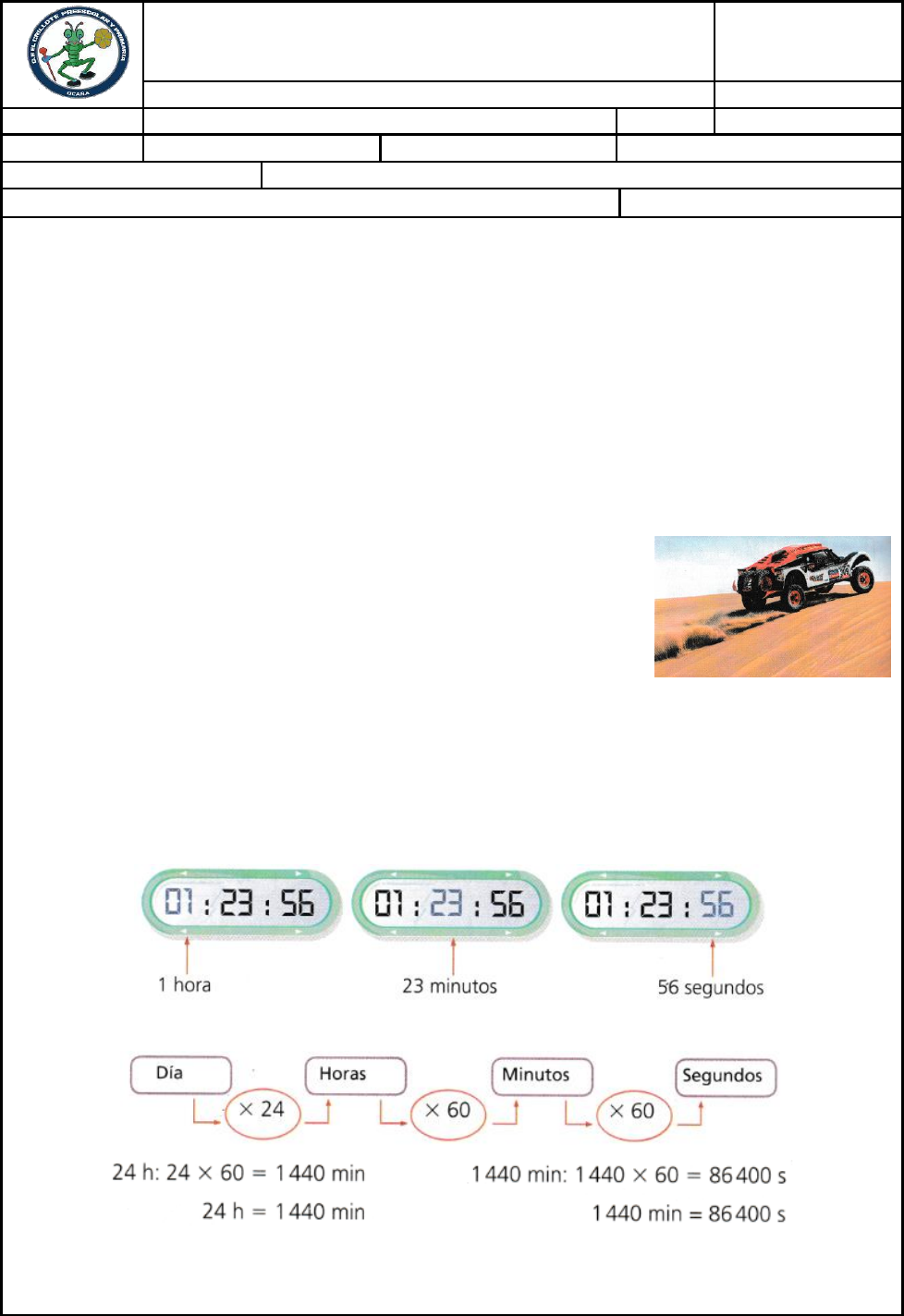 CENTRO EDUCATIVO "EL GRILLOTE" PREESCOLAR Y PRIMARIA Formato: Guías y/o talleres Resolución No. 004954 del 24 de noviembre del 2009 Versión 27.03.20 Área: Geometría Grado: 3 Fecha inicio: Septiembre 22 Fecha de entrega: Septiembre 29 Nombre del estudiante: Guía 9: Horas, minutos y segundos Período: 3 Guía 9: Horas, minutos y segundos Se conoce como tiempo a la duración de las cosas sujetas a cambios, que determinan los periodos, meses, años, semanas, días entre otras. El tiempo lo podemos calcular gracias a las unidades que a el lo componen. Unidades del tiempo: Un día: un día tiene 24 hora. El símbolo de la hora es h. Una hora: una hora tiene 60 minutos. El símbolo del minuto es min. Un minuto: un minuto tiene 60 segundos. El símbolo del segundo es s. Ejemplo: Ximena participo en un rally. En el primer circuito el cronometro registro 01:23:56 y en el segundo 24:00:00. ¿Cuántas horas, minutos y segundos tardó Ximena en realizar el segundo circuito? Para responder la pregunta es necesario comprender como se lee la información en un cronometro y como establecer equivalencias entre las unidades de tiempo. El cronometro indica las horas (h), los minutos (min) y los segundos (s). Para convertir unidades de tiempo se tiene en cuenta las siguientes equivalencias. Ximena tardo 24 horas en realizar el segundo circuito, este tiempo equivale a 1.440 minutos y 86.400 segundos. Actividad 1. Completa para que se cumpla cada igualdad: a. 4 h ………………………………………. min b. 30 min ………………………………… s c. 8 días ……………………………………. h d. 19 min …………………………………… s 2. Expresa el periodo de gestación de cada animal en la unidad de tiempo que se solicita. 3. Estima el tiempo que tardas en realizar las siguientes actividades. Utiliza las unidades de tiempo más adecuadas. ……………………………… ……………………………. ……………………………... ………………………………. 4. Lee y resuelva las situaciones que se plantean a continuación. a. En la tabla se registra el tiempo que gasta Juan en realizar cuatro actividades. ¿Cuántos minutos más gasta en la actividad que mayor tiempo necesita respecto a la de menor tiempo? b. El ciclista colombiano Javier Zapata Cuartas subió 1.318 escalones en una hora y 35 minutos. ¿Cuántos segundos tarde en total?