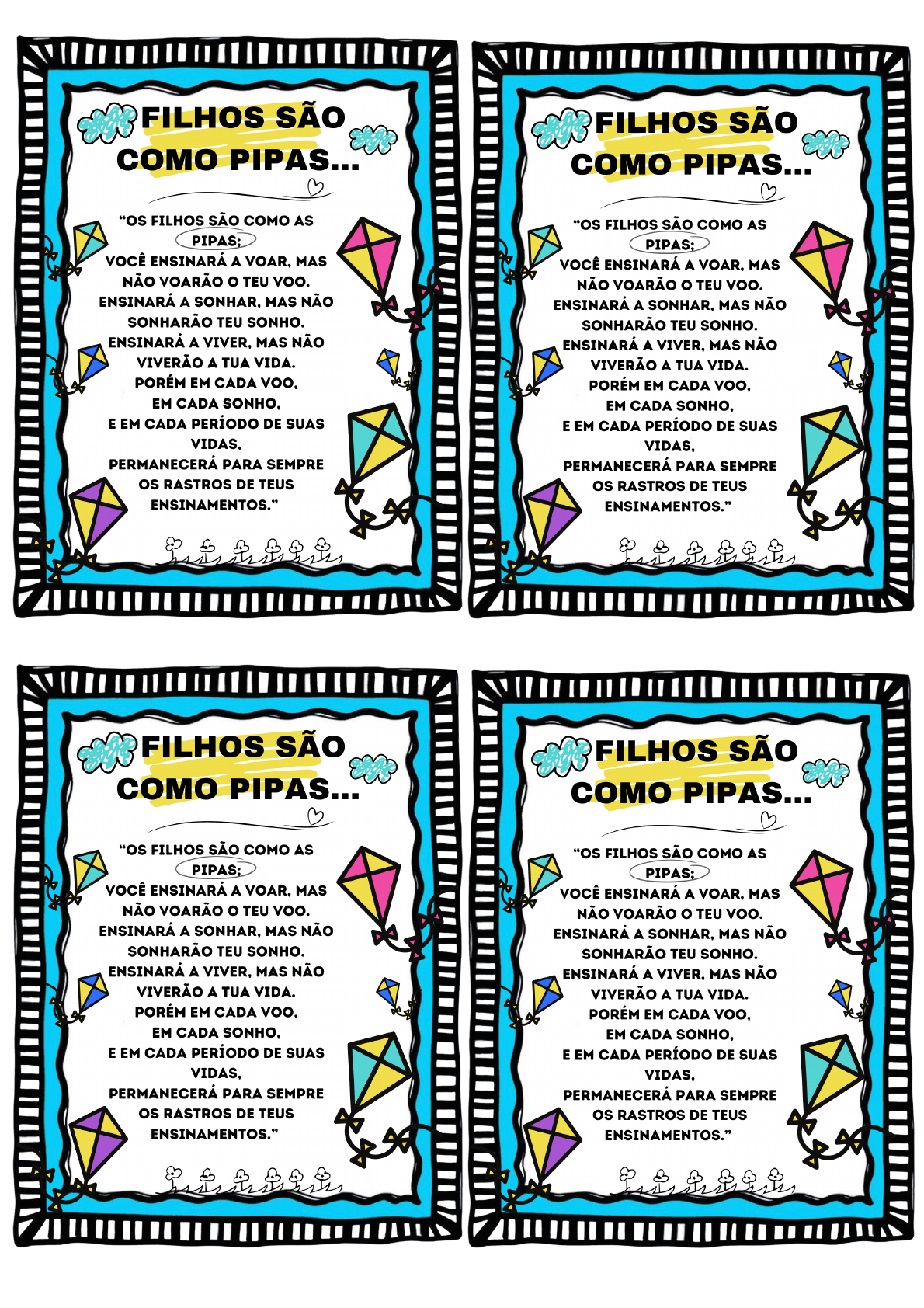 @pedagogia.brincante FILHOS SÃO COMO PIPAS… “Os filhos são como as pipas; Você ensinará a voar, mas não voarão o teu voo. Ensinará a sonhar, mas não sonharão teu sonho. Ensinará a viver, mas não viverão a tua vida. Porém em cada voo, em cada sonho, e em cada período de suas vidas, permanecerá para sempre os rastros de teus ensinamentos.”