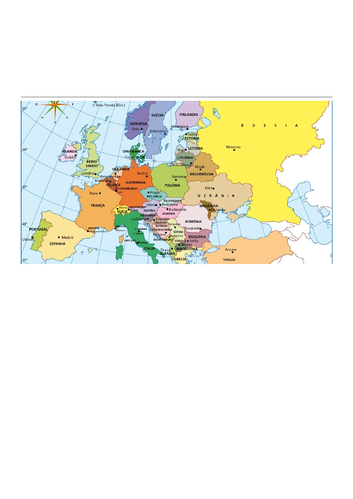 1/7 Mapa da Europa ⋮ 1. A Europa é um dos seis continentes existentes no planeta, sendo o segundo menor em superfície terrestre, estando atrás apenas da Oceania. Com uma área de 10.498.000 km2 e uma população de 746.467.358 habitantes, o continente europeu possui 50 países independentes. Mapa político da Europa https://www.todamateria.com.br/mapa-da-europa/ 2/7 Mapa político da Europa A Rússia é o maior país da Europa e do mundo. Com um território de 17 098 242 km2, ela localiza-se em dois continentes, no leste europeu e na Ásia (onde se concentra maior parte de suas terras), sendo que sua capital Moscou fica na parte europeia. O menor território da Europa é o Vaticano, com uma área de 0,44 km2. Apesar de se localizar dentro de Roma, a capital da Itália, ele é um Estado independente. Mapa físico da Europa Localizado no Hemisfério norte (acima da linha do Equador), o continente europeu faz limites com as seguintes áreas: Norte: Oceano Glacial Ártico e Mar do Norte Sul: Mar Mediterrâneo Leste: Montes Urais, fronteira natural com a Ásia Sudeste: Mar Negro Oeste: Oceano Atlântico 3/7 Mapa físico da Europa Divisão socioeconômica da Europa Baseada nas características econômicas, políticas e humanas, classificamos a Europa em: Europa Ocidental e Europa Oriental (também chamada de Europa do Leste ou Leste Europeu). Europa Ocidental Onde se concentra os países desenvolvidos como, por exemplo, Alemanha, França e Reino Unido. 4/7 Europa Ocidental Europa Oriental, Europa do Leste ou Leste Europeu Onde se concentra países menos desenvolvidos como, por exemplo, Polônia, Ucrânia e Croácia. 5/7 Leste Europeu Países da Europa e suas capitais Europa Ocidental Alemanha: Berlim Áustria: Viena Andorra: Andorra-a-Velha Bélgica: Bruxelas Dinamarca: Copenhague Espanha: Madri Finlândia: Helsinque França: Paris Grécia: Atenas Holanda (Países Baixos): Amsterdã Irlanda: Dublin Islândia: Reykjavik Itália: Roma Liechtenstein: Vaduz Luxemburgo: Luxemburgo Mônaco: Cidade de Mônaco Noruega: Oslo Portugal: Lisboa Reino Unido: Londres San Marino: San Marino Suíça: Berna Suécia: Estocolmo 6/7 Europa Oriental Albânia: Tirana Belarus (Bielorrússia): Minsk Bósnia-Herzegovina: Sarajevo Bulgária: Sofia Croácia: Zagreb Eslováquia: Bratislava Eslovênia: Liubliana Estônia: Talliin Geórgia: Tibilisi Hungria: Budapeste Kosovo: Pristina Letônia: Riga Lituânia: Vilnius Macedônia do Norte: Escopia Moldávia: Chisinau Montenegro: Podgórica Polônia: Varsóvia República Tcheca: Praga Romênia: Bucareste Rússia: Moscou Sérvia: Belgrado Turquia: Ancara Ucrânia: Kiev Alguns países que se encontram na Ásia estão listados como pertencentes ao leste europeu devido às suas ligações socioculturais com a Europa. Esses países são: Armênia: Ierivan Azerbaidjão: Baku Curiosidades sobre a Europa Você sabia que alguns países da Europa cabem dentro de alguns dos nossos estados brasileiros? Veja abaixo alguns exemplos: A Alemanha, com uma área de 357 022 km2, cabe no estado do Mato Grosso do Sul que possui 357 145 km2. A Dinamarca, com uma área de 43 094 km2, cabe no estado do Rio de Janeiro que possui 43 781 km2. A França, com uma área de 549 190 km², cabe no estado de Minas Gerais que possui 586 520 km2. A Itália, com área de 301 340 km2, cabe no estado do Maranhão que possui 331 936 km2. 7/7 O Reino Unido, com área de 243 610 km2, cabe no estado de São Paulo que possui 248 219 km2. Portugal, com área de 92 090 km2, cabe no estado de Santa Catarina que possui 95 737 km2. Mapa com as bandeiras dos países europeus que cabem dentro dos estados brasileiros