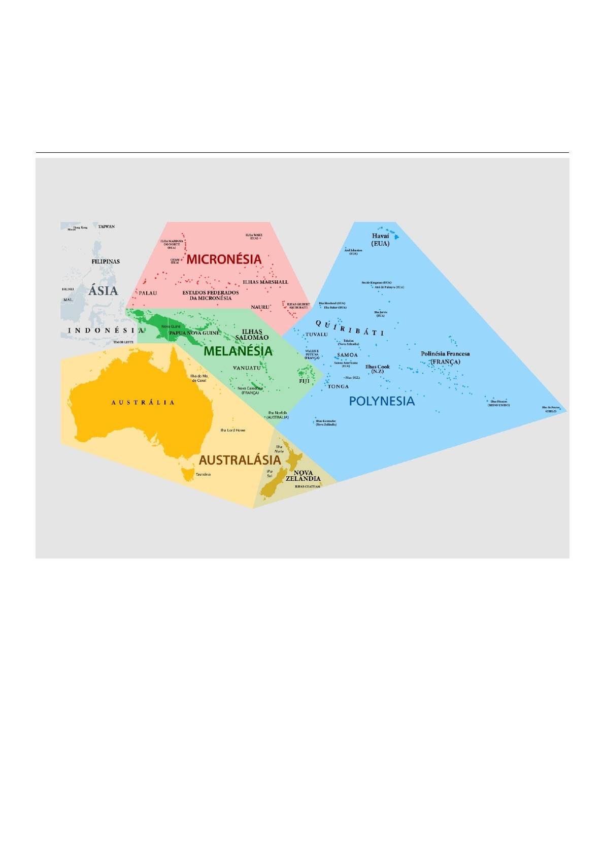 1/7 Oceania 1. Toda Matéria 2. Geografia A Oceania é o menor continente do mundo, situado no hemisfério sul. Compreende a Austrália e as Ilhas do Pacífico, subdivididas em três regiões principais: Polinésia, Melanésia e Micronésia. Em termos operacionais, a prática de dividir o planeta em agrupamentos continentais muitas vezes resulta na associação de todas as ilhas à Austrália ou à Australásia (região que abrange a Austrália). https://undefined/ https://undefined/geografia/ 2/7 Clique para ampliar a imagem. Mapa da Oceania Países que formam a Oceania A Oceania é maior agrupamento de ilhas do planeta, com mais de 10 mil ilhas e 14 países. Os países da Oceania são: 1. Austrália 2. Estados Federados da Micronésia 3. Fiji 4. Ilhas Salomão 5. Indonésia* 6. Kiribati 7. Nauru 8. Nova Zelândia 9. Palau 10. Papua-Nova Guiné 11. Samoa Ocidental 12. Tonga 13. Tuvalu 14. Vanuatu * A Indonésia é um país transcontinental, pois pertence à Oceania e à Ásia. https://todamateria.com.br/upload/ma/pa/mapaoceania.jpg 3/7 A Austrália ocupa 90% do território total do continente. Além dos países, são territórios ultramarinos: Ilhas Marianas (dominadas pelos EUA) Ilhas Carolinas (dominadas pela Micronésia) Nova Caledônia (dominada pela França) Território Antártico Australiano (dominada pela Austrália) Dependência de Ross (dominada pela Nova Zelândia) Terra Adélia (dominada pela França) Samoa Americana (dominada pelos EUA) Saiba mais sobre todos os países da Oceania. Foto de paisagem da Austrália Divisão Regional da Oceania https://undefined/paises-da-oceania/ 4/7 Mapa das Regiões da Oceania. Clique para ampliar a imagem. Australásia Compreende principalmente a Austrália e a Nova Zelândia. A Austrália, dominante na região, é o maior país, ocupando cerca de 90% da área da Oceania. Essa região é conhecida por sua geologia predominantemente antiga e estabilidade tectônica. A população é majoritariamente urbana, com cidades significativas como Sydney, Melbourne e Auckland. Micronésia Abrange uma vasta área de ilhas dispersas pelo Oceano Pacífico. São pequenas nações insulares independentes, como Estados Federados da Micronésia, Palau, Kiribati e Nauru. A economia é frequentemente baseada na pesca e no turismo, sendo vulnerável aos desafios climáticos. Melanésia É caracterizada por suas ilhas maiores e pela diversidade étnica. Inclui Papua-Nova Guiné, Ilhas Salomão, Vanuatu, Fiji e outras. A região tem uma rica cultura indígena e, em alguns lugares, a população ainda pratica tradições ancestrais. A agricultura e a pesca são importantes para a economia. Polinésia https://todamateria.com.br/upload/ma/pa/maparegioesdaoceania.jpg 5/7 Se estende por uma vasta área central do Pacífico e inclui nações como Samoa, Tonga, Tuvalu e as ilhas do Havaí e da Nova Zelândia. As ilhas polinésias são frequentemente associadas a praias paradisíacas e são destinos turísticos populares. A economia muitas vezes se apoia no turismo e na agricultura. Características da Oceania 1. Composição geográfica A Oceania é predominantemente formada por terrenos de origem vulcânica, conferindo à região uma notável atividade tectônica e vulcânica. 2. Área Com uma extensão territorial de 8.480.355 km², a densidade demográfica varia significativamente: Austrália possui 2,2 hab/km²; Papua-Nova Guiné, 7,7 hab/km²; Nauru, 380 hab/km². A Austrália abrange a maior parte da Oceania, representando cerca de 90% do continente. As principais cidades da região estão na Austrália, incluindo Sydney, Melbourne, Brisbane e Perth. Cidades importantes também estão na Nova Zelândia, como Auckland e Wellington, e em Papua-Nova Guiné, com destaque para Port Moresby. 3. População Todas as ilhas da Oceania têm a população composta por indígenas. No entanto, na Austrália e na Nova Zelândia os brancos europeus constituem a maioria dos habitantes, especialmente de origem britânica. Com uma população de cerca de 32 milhões de habitantes, a Oceania é uma região predominantemente urbana. Enquanto 75% da população vive em cidades, 25% dos oceânicos vivem no campo. Na Austrália e na Nova Zelândia, 85% da população reside em áreas urbanas, enquanto nas ilhas a maior parte dos habitantes estão nas áreas rurais. 4. Economia Os países mais desenvolvidos, como Austrália e Nova Zelândia, destacam-se pela produção de bens industrializados e tecnologia avançada. Nas ilhas, as atividades econômicas incluem extrativismo, agricultura e turismo. 6/7 Foto de paisagem da Nova Zelândia 5. Fauna, Vegetação e Clima A fauna da Oceania possui muitos animais, entretanto, sua posição isolada levou ao surgimento de algumas espécies exóticas encontradas somente naquela região. Dessas, se destacam os cangurus. Outros animais típicos da Oceania são: coala, dingo, cacatua, diabo da tasmânia, ornitorrinco, quivi, cisne negro, elefante-marinho, kaluta e kowari. Sua flora é predominantemente composta por florestas tropicais, as quais convivem com o clima desértico na parte interior da Austrália e clima tropical nas ilhas. Canguru Cultura da Oceania Na Oceania, o inglês é o idioma mais falado, mas essa não é a única língua do continente. Lá também há espaço para língua francesa e para os dialetos nativos. Em termos religiosos, predomina o cristianismo, sendo liderado por 27% de católicos e 24% de protestantes. Em decorrência do calor, é costume usar roupas leves e confortáveis. https://undefined/diabo-da-tasmania/ 7/7 As típicas tatuagens maoris são conhecidas em todo o mundo e têm origem com os povos indígenas da Nova Zelândia. Para os índios, as mokas - como são chamadas - tem caráter sagrado. Colonização e História da Oceania Chamada de Novíssimo Mundo, a Oceania foi o último continente a ser encontrado pelos europeus. O termo Oceania é usado em vários idiomas para indicar um continente que abrange a Austr