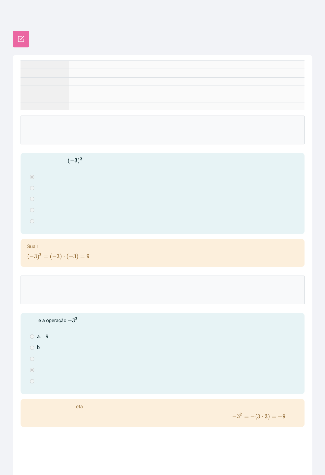 Iniciado em sábado, 2 mar. 2024, 19:20 Estado Finalizada Concluída em sábado, 2 mar. 2024, 21:49 Tempo empregado 2 horas 29 minutos Notas 4,00/13,00 Avaliar 3,08 de um máximo de 10,00(30,77%) Questão 1 Completo Atingiu 0,00 de 1,00 Questão 2 Completo Atingiu 1,00 de 1,00 QUESTIONÁRIO Efetue a operação a. -6 b. 1/6 c. -9 d. 6 e. 9 (−3)2 Sua resposta está incorreta. (−3 = (−3) ⋅ (−3) = 9)2 Efetue a operação a. 9 b. 1/9 c. -6 d. -9 e. 6 −32 Sua resposta está correta. Escrito desta forma, apenas 3 está elevado ao quadrado, o sinal de menos, não está. Portanto, − = −(3 ⋅ 3) = −932 Questão 3 Completo Atingiu 0,00 de 1,00 Questão 4 Completo Atingiu 1,00 de 1,00 Efetue a operação a. b. 0 c. - d. - e. ( 4 5 )−3 125 64 125 64 64 125 64 125 Sua resposta está incorreta. Quando temos expoente negativo devemos inverter a fração da base e trocar o sinal do expoente. Assim, ( 4 5 ) −3 = ( 5 4 ) 3 = 5 4 ⋅ 5 4 ⋅ 5 4 = 125 64 Efetue a operação . Lembre-se a. -25 b. 125 c. -5 d. 5 e. 25 Sua resposta está correta. Podemos cancelar o índice e simpli�car o expoente obtendo: https://ead.slt.ifsp.edu.br/filter/tex/displaytex.php?texexp=%20%20%5Csqrt%7B625%7D%20%20 https://ead.slt.ifsp.edu.br/filter/tex/displaytex.php?texexp=%20%20%5Csqrt%7B625%7D%20%20 https://ead.slt.ifsp.edu.br/filter/tex/displaytex.php?texexp=%20625%20%3D%205%5E4%20 https://ead.slt.ifsp.edu.br/filter/tex/displaytex.php?texexp=%20625%20%3D%205%5E4%20 https://ead.slt.ifsp.edu.br/filter/tex/displaytex.php?texexp=%20%5Csqrt%7B625%7D%3D%5Csqrt%7B5%5E4%7D%20 https://ead.slt.ifsp.edu.br/filter/tex/displaytex.php?texexp=%20%5Csqrt%7B625%7D%3D%5Csqrt%7B5%5E4%7D%20 https://ead.slt.ifsp.edu.br/filter/tex/displaytex.php?texexp=%20%5Csqrt%5B2%5D%7B5%5E4%7D%3D5%5E2%3D25%20 https://ead.slt.ifsp.edu.br/filter/tex/displaytex.php?texexp=%20%5Csqrt%5B2%5D%7B5%5E4%7D%3D5%5E2%3D25%20 Questão 5 Completo Atingiu 0,00 de 1,00 Questão 6 Completo Atingiu 0,00 de 1,00 Efetue a operação a. Impossível resolver b. 4 c. -16 d. -4 e. 16 Sua resposta está incorreta. De fato, Efetue a operação a. b. c. d. 8 e. 4 Sua resposta está incorreta. https://ead.slt.ifsp.edu.br/filter/tex/displaytex.php?texexp=%20%5Csqrt%5B3%5D%7B-64%7D%20 https://ead.slt.ifsp.edu.br/filter/tex/displaytex.php?texexp=%20%5Csqrt%5B3%5D%7B-64%7D%20 https://ead.slt.ifsp.edu.br/filter/tex/displaytex.php?texexp=%20%5Csqrt%5B3%5D%7B-64%7D%3D-4%20 https://ead.slt.ifsp.edu.br/filter/tex/displaytex.php?texexp=%20%5Csqrt%5B3%5D%7B-64%7D%3D-4%20 https://ead.slt.ifsp.edu.br/filter/tex/displaytex.php?texexp=%20%28-4%29%5E3%20%3D%20-64%20 https://ead.slt.ifsp.edu.br/filter/tex/displaytex.php?texexp=%20%28-4%29%5E3%20%3D%20-64%20 https://ead.slt.ifsp.edu.br/filter/tex/displaytex.php?texexp=2%5E%7B%5Cfrac%7B3%7D%7B2%7D%7D https://ead.slt.ifsp.edu.br/filter/tex/displaytex.php?texexp=2%5E%7B%5Cfrac%7B3%7D%7B2%7D%7D https://ead.slt.ifsp.edu.br/filter/tex/displaytex.php?texexp=%5Cfrac%7B3%7D%7B2%7D https://ead.slt.ifsp.edu.br/filter/tex/displaytex.php?texexp=%5Cfrac%7B3%7D%7B2%7D https://ead.slt.ifsp.edu.br/filter/tex/displaytex.php?texexp=%5Cfrac%7B1%7D%7B8%7D https://ead.slt.ifsp.edu.br/filter/tex/displaytex.php?texexp=%5Cfrac%7B1%7D%7B8%7D https://ead.slt.ifsp.edu.br/filter/tex/displaytex.php?texexp=%5Csqrt%7B8%7D https://ead.slt.ifsp.edu.br/filter/tex/displaytex.php?texexp=%5Csqrt%7B8%7D https://ead.slt.ifsp.edu.br/filter/tex/displaytex.php?texexp=2%5E%7B%5Cfrac%7B3%7D%7B2%7D%7D%20%3D%20%5Csqrt%7B2%5E3%7D%20%3D%20%5Csqrt%7B8%7D https://ead.slt.ifsp.edu.br/filter/tex/displaytex.php?texexp=2%5E%7B%5Cfrac%7B3%7D%7B2%7D%7D%20%3D%20%5Csqrt%7B2%5E3%7D%20%3D%20%5Csqrt%7B8%7D Questão 7 Completo Atingiu 1,00 de 1,00 Questão 8 Completo Atingiu 0,00 de 1,00 Resolva a equação exponencial a. b. c. d. e. Sua resposta está correta. Se as base são iguais a 2 basta perceber que os expoentes precisam ser iguais a �m de que a expressão seja verdadeira. Neste caso temos que x = 4, pois 4 + 1 = 5. Racionalize a expressão: . a. b. c. d. e. Sua resposta está incorreta. Primeiro passo da resolução: https://ead.slt.ifsp.edu.br/filter/tex/displaytex.php?texexp=%202%5E%7Bx%2B1%7D%20%3D%202%5E5%20 https://ead.slt.ifsp.edu.br/filter/tex/displaytex.php?texexp=%202%5E%7Bx%2B1%7D%20%3D%202%5E5%20 https://ead.slt.ifsp.edu.br/filter/tex/displaytex.php?texexp=S%20%3D%7B12%7D https://ead.slt.ifsp.edu.br/filter/tex/displaytex.php?texexp=S%20%3D%7B12%7D https://ead.slt.ifsp.edu.br/filter/tex/displaytex.php?texexp=S%20%3D%20%7B4%7D https://ead.slt.ifsp.edu.br/filter/tex/displaytex.php?texexp=S%20%3D%20%7B4%7D https://ead.slt.ifsp.edu.br/filter/tex/displaytex.php?texexp=S%20%3D%7B16%7D https://ead.slt.ifsp.edu.br/filter/tex/displaytex.php?texexp=S%20%3D%7B16%7D https://ead.slt.ifsp.edu.br/filter/tex/displaytex.php?texexp=S%20%3D%7B1%2F4%7D https://ead.slt.ifsp.edu.br/filter/tex/displaytex.php?texexp=S%20%3D%7B1%2F4%7D https://ead.slt.ifsp.edu.br/filter/tex/displaytex.php?texexp=S%20%3D%20%7B2%5E5%7D https://ead.slt.ifsp.edu.br/filter/tex/displaytex.php?texexp=S%20%3D%20%7B2%5E5%7D https://ead.slt.ifsp.edu.br/filter/tex/displaytex.php?texexp=S%20%3D%20%7Bx%20%3D%204%20%7C%20%5C%282%5E%7B4%2B1%7D%20%3D%202%5E5%7D https://ead.slt.ifsp.edu.br/filter/tex/displaytex.php?texexp=S%20%3D%20%7Bx%20%3D%204%20%7C%20%5C%282%5E%7B4%2B1%7D%20%3D%202%5E5%7D https://ead.slt.ifsp.edu.br/filter/tex/displaytex.php?texexp=%20%5Cfrac%7B21%7D%7B%5Csqrt%7B7%7D%7D%20 https://ead.slt.ifsp.edu.br/filter/tex/displaytex.php?texexp=%20%5Cfrac%7B21%7D%7B%5Csqrt%7B7%7D%7D%20 https://ead.slt.ifsp.edu.br/filter/tex/displaytex.php?texexp=3%20%5Ccdot%20%5Csqrt%7B7%7D https://ead.slt.ifsp.edu.br/filter/tex/displaytex.php?texexp=3%20%5Ccdot%20%5Csqrt%7B7%7D https://ead.slt.ifsp.edu.br/filter/tex/displaytex.php?texexp=%5Csqrt%7B7%7D https://ead.slt.ifsp.edu.br/filter/tex/displaytex.php?texexp=%5Csqrt%7B7%7D https://ead.slt.ifsp.edu.br/filter/tex/displaytex.php?texexp=%5Csqrt%7B3%7D https://ead.slt.ifsp.edu.br/filter/te