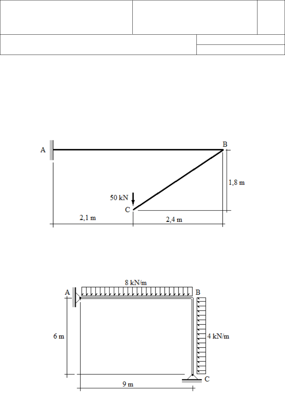 Universidade Federal de Campina Grande Centro Tecnologia e Recursos Naturais Unidade Acadêmica de Engenharia Civil Área de Sist. Estrut. e Construção Civil Disciplina: Teoria das Estruturas Prof. Marco A. T. Lima Período 2020.3 Turma 01 3º EXERCÍCIO ESCOLAR NOTA ALUNO (A) Data: 26/11/20 Obs.: Início: 10h Término: 13h Valor das questões entre colchetes. Manter a câmera do computador ligada durante a realização da prova. A prova é individual. 1) [2,5] Determinar, através do Teorema de Castigliano, o deslocamento vertical do ponto B da estrutura abaixo. Considere E = 200 GPa e J = 150 x 10 6 mm 4 . 2) [2,5] Confira o valor do deslocamento vertical do ponto B da questão acima, calculando-o pelo PTV. 3) [5] Levantar a hiperestaticidade do quadro abaixo através do Teorema do Trabalho Mínimo (Menabrea). Considere EJ constante e esboce seu diagrama de momentos fletores.