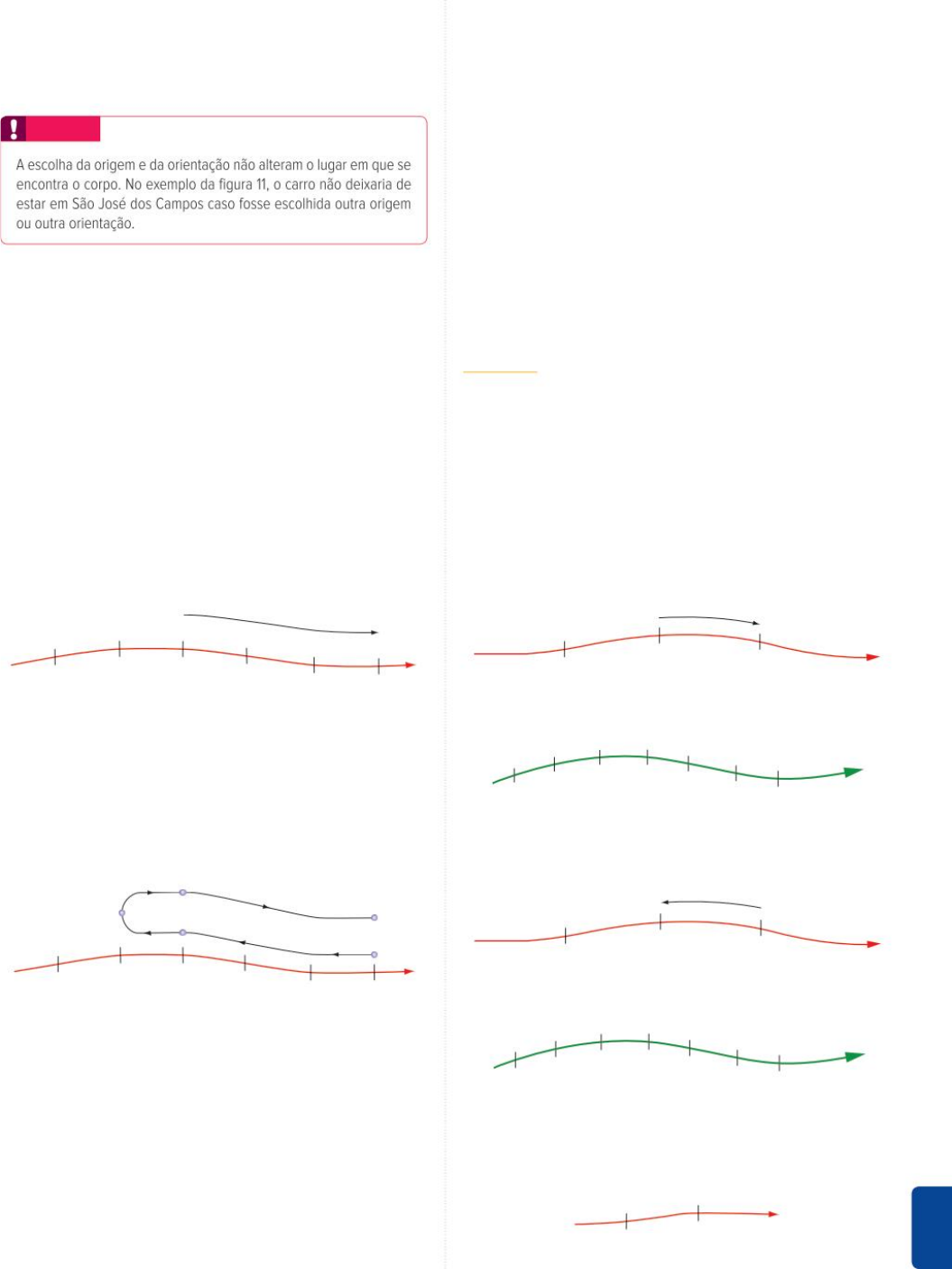 F R E N T E 1 9 Na figura 12, com a origem em O: • A posição de A é +1 m: A está a 1 m de O (origem dos espaços) e na região positiva. • A posição de B é −2 m: B está a 2 m de O (origem dos espaços) e na região negativa. Atenção Função horária do espaço Se um corpo está em movimento em relação a um refe- rencial, à medida que varia o tempo, também varia o valor do espaço do corpo. A função horária do espaço é a função que relaciona os espaços s de um móvel com os correspondentes instantes t. Se conhecemos a função horária, podemos determinar o espaço do móvel para cada instante de tempo. Tomemos as seguintes funções horárias, com t em se- gundos e s em metros. I. s = 4 + 2t t = 0: s = 4 + 2 · 0 ⇒ s = 4 m t = 1 s: s = 4 + 2 · 1 ⇒ s = 6 m t = 2 s: s = 4 + 2 · 2 ⇒ s = 8 m t = 3 s: s = 4 + 2 · 3 ⇒ s = 10 m 0 2 4 6 8 10 t = 0 t = 1 s t = 2 s t = 3 s Fig. 13 Espaços para a função s = 4 + 2t. II. s = 5 − 4t + t 2 t = 0: s = 5 − 4 · 0 + 0 2 ⇒ s = 5 m t = 1 s: s = 5 − 4 · 1 + 1 2 ⇒ s = 2 m t = 2 s: s = 5 − 4 · 2 + 2 2 ⇒ s = 1 m t = 3 s: s = 5 − 4 · 3 + 3 2 ⇒ s = 2 m t = 4 s: s = 5 − 4 · 4 + 4 2 ⇒ s = 5 m 0 1 2 3 4 5 t = 2 s t = 3 s t = 1 s t = 4 s t = 0 Fig. 14 Espaços para a função s = 5 – 4t + t 2 . O instante t = 0 é chamado de origem dos tempos, representando o instante do disparo do cronômetro do ob- servador. O espaço do móvel no instante t = 0 é chamado de espaço inicial (s0). No exemplo I, s0 = 4 m e, no exemplo II, s0 = 5 m. Por outro lado, se conhecemos o espaço do móvel para cada instante de tempo, podemos determinar a função horária do espaço. Tomemos os seguintes pares de espaço-tempo: III. t = 0: s = 5 m t = 1 s: s = 4 m t = 2 s: s = 3 m t = 3 s: s = 2 m Dos dados fornecidos, podemos deduzir que: s = 5 − t Com base na função horária, podemos também calcular em que instante o espaço assume certo valor. No exemplo III, se quisermos saber em que instante s = 1 m, basta tomarmos: 5 − t = 1 ⇒ t = 4 s Variação de espaço Se um corpo, em um instante t1, possui espaço s1 e, em um instante t2, possui espaço s2, temos: ∆t = t2 − t1 é a variação de tempo e ∆s = s2 − s1 é a variação de espaço. Observação: A letra grega maiúscula delta (∆), quando acompanhada de uma grandeza, indica a variação desta, ou seja, a diferença de valores dessa grandeza entre um instante inicial e um instante final. Por exemplo, se a posição inicial de um corpo é 5 m e a sua posição final é 8 m, então: ∆s = sfinal – sinicial = 8 m – 5 m ⇒ ∆s = 3 m Da definição de variação de espaço, podemos concluir: • Se s2 > s1, então ∆s > 0 e o corpo se move aumentando seu espaço, portanto no sentido positivo da trajetória. 0 s 1 s 2 Fig. 15 s2 > s1. 0 1 m 2 m 3 m 4 m 5 m 6 m s 1 s 2 Fig. 16 s1 = 2 m e s2 = 4 m, com ∆s = 2 m. • Se s2 < s1, então ∆s < 0 e o corpo se move diminuindo seu espaço, portanto no sentido negativo da trajetória. 0 s 2 s 1 Fig. 17 s2 < s1. 0 1 m 2 m 3 m 4 m 5 m 6 m s 2 s 1 Fig. 18 s1 = 4 m e s2 = 2 m, com ∆s = –2 m. • Se s2 = s1, então ∆s = 0, e não houve deslocamento ao longo da trajetória. s 1 s 2 0 Fig. 19 s2 = s1, com ∆s = 0. FÍSICA Capítulo 1 Introdução à Cinemática10 Distância percorrida Se um corpo vai de s1 = 10 km até s2 = 70 km e depois retorna a s3 = 30 km, temos: t 1 t 3 t 2 0 30 7010 Fig. 20 Movimento de s1 = 10 km a s3 = 30 km. • de t1 a t2: ∆s12 = 70 km − 10 km = 60 km • de t2 a t3: ∆s23 = 30 km − 70 km = −40 km • de t1 a t3: ∆s13 = 30 km − 10 km = 20 km ou: ∆s13 = ∆s12 + ∆s23 = (60 km) + (−40 km) = 20 km Temos acima os cálculos das variações de espaço para os três casos. Porém, se desejarmos saber a distância efetivamente percorrida pelo corpo entre t1 e t3, temos: d = |∆s12| + |∆s23| = 60 km + 40 km ⇒ d = 100 km Dessa forma, a distância efetivamente percorrida é a soma dos módulos das variações de espaço em cada sen- tido do movimento. A distância d coincide com o módulo da variação de espaço ∆s quando o corpo se move em um único sentido entre os intervalos de tempo considerados: t 1 t 2 70 1000 Fig. 21 Movimento de s1 = 70 km a s2 = 100 km. Temos ∆s = 30 km e d = 30 km. t 2 t 1 0 50 90 Fig. 22 Movimento de s1 = 90 km a s2 = 50 km. Temos ∆s = −40 km ⇒ |∆s| = 40 km e d = 40 km. Atenção Velocidade Velocidade escalar média Vamos começar analisando um exemplo. Se um automóvel, em uma viagem, percorrer 200 km em 2 horas, podemos dizer que o carro percorreu, em média, 100 km a cada hora. Daí afirmamos que a velocidade escalar média do au- tomóvel foi de 100 km/h. É importante observar que o automóvel não percorreu necessariamente 100 km a cada hora. Ele pode ter percorrido 120 km na 1a hora e 80 km na 2a hora, ou ainda, 50 km na 1a hora e 150 km na 2a hora. De um modo geral, se um corpo está em s1 no instante t1 e em s2 no instante t2, a velocidade média (vm) é definida como sendo a razão entre a variação de espaço (∆s) e a variação de tempo (∆t): = ∆ ∆ v s t m onde ∆s = s2 s1 e ∆t = t2 t1. Daí vem que a unidade de medida de velocidade é a razão entre a unidade de medida de espaço e a unidade de medida de tempo: u(v) u(s) u(t) = No Sistema Internacional de Unidades (SI): u(v) = m/s Atenção Velocidade escalar instantânea No caso do automóvel que percorreu 200 km em 2 h, a velocidade média foi de 100 km/h. Porém, isso não significa que em todo instante a velocidade foi de 100 km/h. O automóvel pode ter até parado no caminho para fazer um abastecimento. Para sabermos a velocidade do móvel em todo instante, a velocidade escalar média não nos serve; precisamos co- nhecer a velocidade escalar instantânea. Ela é a velocidade indicada pelo velocímetro do carro. km/h Fig. 23 Velocímetro a 80 km/h. A velocidade escalar instantânea pode ser definida como a velocidade escalar média quando o in
