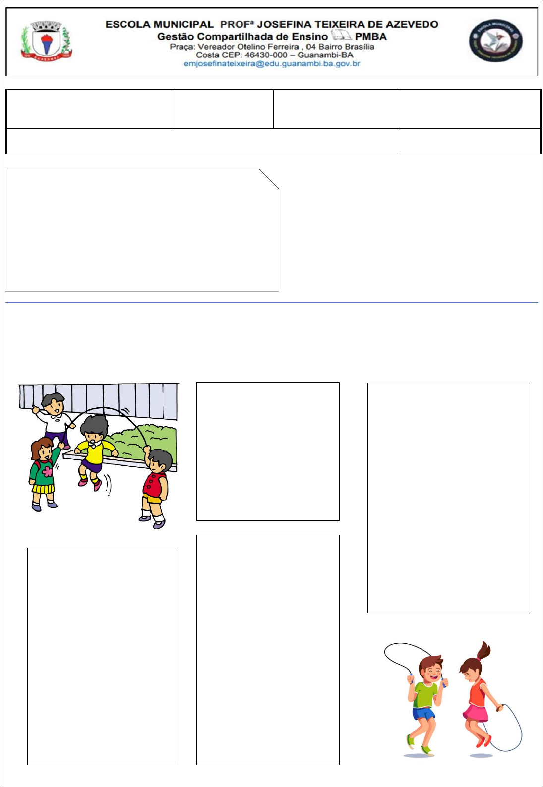 Componente Curricular: Educação Física Turno: Série/Turma Prof: Weriston Trindade Aluno(a): Data: / / A verdadeira vitória está em concluir cada desafio com um coração pleno, satisfeito pela jornada e orgulhoso da trajetória. AVALIAÇÃO DIAGNÓSTICA DE EDUCAÇÃO FÍSICA - 6° ANO. Questão 01. Algumas brincadeiras da cultura infantil são acompanhadas de música. Uma música tradicional que corresponde ao ato de pular corda é: Essa é uma avaliação diagnóstica que tem como objetivo verificar o seu nível de conhecimento e as suas dificuldades em relação aos conteúdos da disciplina de Educação Física. Essa avaliação é importante para que o seu professor possa planejar as atividades que vão ajudar você a aprender melhor ao longo do ano. A) A canoa virou Pois deixaram-na virar Foi por causa de Maria Que não soube remar Se eu fosse um peixinho E soubesse nadar Eu tirava Maria Do fundo do mar Siri pra cá, Siri pra lá Maria é bela E quer casar B) O homem bateu Em minha porta E eu abri. Senhoras e senhores Ponha a mão no chão. Senhoras e Senhores Pule de um pé só. Senhoras e senhores Dê uma rodadinha E vá pro olho da rua C) Fui no Tororó beber Água não achei, Achei a bela morena Que no Tororó deixei. Aproveita minha gente Que uma noite não é nada; Se não dormir agora Dormirá de madrugada. Oh ! Mariazinha! Oh ! Mariazinha!, Entra nesta roda Ou ficarás sozinha ! - Sozinha eu não fico, Nem hei de ficar! Por que eu tenho o Pedro Para ser o meu par. D) Teresinha de Jesus Deu a queda foi ao chão Acudiram-lhe três cavaleiros Todos três chapéu na mão. O primeiro foi seu pai O segundo seu irmão O terceiro foi aquele que a Teresa deu a mão Quanta laranja madura Quanto limão pelo chão Quanto sangue derramado Dentro do meu coração. Da laranja quero um gomo Do limão quero um pedaço Da menina mais bonita Quero um beijo e um abraço Leia o texto com atenção e responda a questão a seguir: A queimada é um jogo desportivo, muito usado em versão similar, como brincadeira infantil. Não há notícias de competições esportivas oficiais desse esporte no Brasil, porém, em escolas, é muito praticado. Nos Estados Unidos, existem ligas de queimada ou dodgeball, como a variante do esporte é conhecida por lá. É utilizada uma bola similar à de vôlei e à de handebol. Bola essa de borracha, de tamanho médio ou pequeno. O número de jogadores varia de acordo com o total de participantes. Será vencedor, o grupo que, no fim de um tempo previamente determinado, fizer maior número de prisioneiros/queimados, ou então, aquele que aprisionar todos os jogadores adversários. No Brasil, observa- se que há diversos nomes para a queimada, como: Baleado, na Bahia, Queimado, no Rio de Janeiro, Bola Queimada, no Paraná, Mata-mata, em Santa Catarina e Carimbaba, em Uberlândia. Questão 02. No jogo citado o que mais se prevalece: A) A cooperação entre os jogadores, o respeito pela vez do colega e a rapidez nos movimentos. B) A disputa entre os jogadores, agindo de forma desleal. C) A lentidão de movimentos. D) A cooperação e a lentidão dos movimentos Questão 03. Nas aulas de educação física, João tem uma deficiência visual. O que devemos fazer para ajudá-lo a participar das atividades? A) Não estender a mão para ajudar o colega a participar das atividades; B) Informar ao João os obstáculos e materiais presentes no espaço. C) Dar dicas falsas sobre a atividade. D) Deixar João fora da atividade proposta pelo professor. Questão 04. Brincar é tão importante para a criança como trabalhar é para o adulto. É o que a torna ativa, criativa, e lhe dá oportunidade de relacionar-se com os outros; também a faz feliz e, por isso, mais propensa a ser bondosa, a amar o próximo e a ser solidária. Em algumas situações precisamos criar nossos próprios brinquedos. Para produzirmos pernas de latas, necessitamos de: A) 3 pedaços de madeira, para fazermos uma base de apoio; B) 2 pedaços de madeira, produzindo um apoio para os pés do lado de cada pedaço, segurando-os firmemente com as mãos; C) 2 latinhas de leite em pó ou de massa de tomate grande, virando-as ao contrário para apoiar os pés, e fazendo um furo no fundo de cada uma delas, para passar um barbante com objetivo de segurar e dar firmeza “às pernas de lata”; D) 2 latinhas de leite em pó, um pedaço de madeira para apoio e elástico. Leia o texto com atenção e responda as questões a seguir: TEMA: BRINQUEDOS, JOGOS E BRINCADEIRAS POPULARES Os brinquedos, jogos e as brincadeiras tradicionais surgiram através dos povos que deram origem à nossa civilização. Infelizmente, devido ao crescimento da informatização, a tendência é que muitas brincadeiras tradicionais aos poucos vão perdendo espaço nas preferências das crianças, pois muitas preferem os jogos eletrônicos. Entretanto, é importante destacar que os jogos e os brinquedos possuem um valor muito grande para todos, pois atividades mais manuais são mais benéficas para o nosso corpo, e temos a certeza que o espaço destas atividades está garantido na cultura do Brasil. Vamos agora conhecer algumas brincadeiras bem legais Estátua Nesta brincadeira, as crianças dançam com uma música ou circulam pela sala e sob o comando do adulto (ao falar: ESTÁTUA!) devem ficar imóveis. Aquele que se mexer e sair da posição de “estátua” deve sair da brincadeira. Carrinho de mão Enquanto a criança coloca as mãos no chão, com os braços estendidos, o adulto (ou outra criança) levanta suas pernas e empurra, como se fosse um carrinho de mão. CONCLUSÃO Brincar é um momento importante para o desenvolvimento das pessoas. Através da brincadeira, a gente aprende e experimenta novas oportunidades para o aperfeiçoamento da linguagem e da habilidade motora. Questão 05. O estudo de hoje fala principalmente sobre: a) a cultura do Brasil. b) os jogos eletrônicos. c) os jogos e as brincadeiras. d) as habilidades motoras. Que