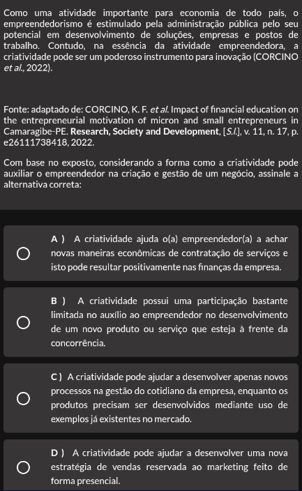 A) A criatividade ajuda o(a) empreendedor(a) a achar novas maneiras econômicas de contratação de serviços e isto pode resultar positivamente nas finanças da empresa. ) A criatividade possui uma participação bastante limitada no auxílio ao empreendedor no desenvolvimento de um novo produto ou serviço que esteja à frente da concorrência. C) A criatividade pode ajudar a desenvolver apenas novos processos na gestão do cotidiano da empresa, enquanto os produtos precisam ser desenvolvidos mediante uso de exemplos já existentes no mercado. D) A criatividade pode ajudar a desenvolver uma nova estratégia de vendas reservada ao marketing feito de forma presencial.