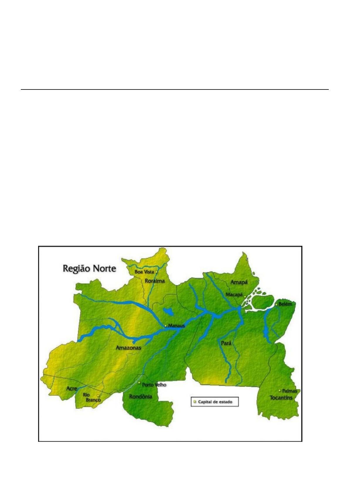 1/5 Região Norte A Região Norte do Brasil é a maior região em extensão territorial, com uma área de 3 853 676,948 km², equivalente a 42,27% do território nacional. Essa região conta com uma população de cerca de 17 231 027 de habitantes, segundo o censo de 2014. Ela é formada por sete estados: Amazonas, Pará, Acre, Rondônia, Roraima, Amapá e Tocantins. Na Região Norte, localiza-se a Floresta Amazônica, a maior floresta tropical do mundo; o rio Amazonas, o maior rio do mundo em extensão; a Bacia Amazônica, a maior bacia hidrográfica do mundo; e Pico da Neblina, o ponto mais alto do Brasil, com 2.993,78 metros de altitude. O Pico da Neblina está situado no Parque Nacional do Pico da Neblina, na serra Imeri, no município de Santa Isabel do Rio Negro, no estado do Amazonas. Mapa da Região Norte Mapa da Região Norte do Brasil Veja também: Siglas dos estados brasileiros (inclui DF) https://undefined/siglas-estados-brasileiros/ 2/5 Estados e Capitais da Região Norte Os sete estados da Região Norte e suas capitais são: Amazonas (AM) - Manaus Pará (PA) - Belém Acre (AC) - Rio Branco Rondônia (RO) - Porto Velho Roraima (RR) - Boa Vista Amapá (AP) - Macapá Tocantins (TO) - Palmas Veja também: Estados do Norte Fronteiras da Região Norte A região Norte faz fronteira com a Bolívia, Peru, Colômbia, Venezuela, Guiana, Suriname e a Guiana Francesa, e com os estados do Maranhão, Piauí, Bahia, Goiás e Mato Grosso. Clima da Região Norte O clima predominante na maior parte da Região norte do Brasil é o equatorial úmido, apresentando elevadas temperaturas, com médias acima de 25°C, chuvas abundantes durante todo o ano, superiores a 2.000 a 3.000 mm anuais, variando conforme os movimentos das massas de ar. Em todo estado do Tocantins e no sudeste do Pará predomina o clima tropical, com duas estações bem definidas, uma chuvosa e uma seca. No noroeste do Pará e leste de Roraima predomina o clima equatorial semiúmido, com curtos períodos de seca e temperaturas elevadas durante todo o ano. Veja também: Clima Equatorial Vegetação da Região Norte A vegetação da Região Norte está intimamente ligada ao clima, ao solo e ao relevo. Além da floresta, que ocupa a maior parte da região, aparecem campos úteis para a criação de gado. A Floresta Amazônica, que ocupa 40% do território brasileiro, apresenta três degraus de vegetação, tendo como base os níveis de altitude: A mata de terra firme, parte da floresta que se localiza em terrenos mais elevados, que não são atingidos pelas inundações dos rios. Nessa região se encontra o mogno, o cedro, o angelim, a andiroba, o guaraná, o caucho (planta que fornece o látex) e a castanheira, árvore nativa que pode atingir 30 metros de altura. https://undefined/estado-do-amazonas/ https://undefined/estado-do-para/ https://undefined/estado-do-acre/ https://undefined/estado-de-roraima/ https://undefined/amapa/ https://undefined/estado-do-tocantins/ https://undefined/estados-do-norte/ https://undefined/clima-tropical/ https://undefined/clima-equatorial/ https://undefined/floresta-amazonica/ 3/5 A mata de várzea, parte da floresta sujeita a inundações periódicas. Situa-se entre a mata de terra firme e a do igapó, apresentando grande diversidade de espécies, predominando árvores que fornecem o látex, a maniçoba, a maçaranduba etc. A mata de igapó é a parte da floresta que se localiza em terrenos baixos, próximo dos rios, ocupando o solo permanentemente alagado, onde predomina a vitória régia, a piaçava etc. Veja também: Clima da Região Norte Relevo da Região Norte Na Região Norte predominam três áreas de relevo: A planície amazônica que acompanha a grande bacia fluvial, com altitudes que variam de 100 a 200 metros acima do nível do mar. A região de planaltos, entre 200 a 800 metros de altitude, em áreas de chapadas e serras: a serra dos Carajás, serra Pelada, serra de Tumucumaque, a serra do Acarai e a serra do Cachimbo no estado do Pará; a serra Dourada, a chapada das Mangabeiras, no Tocantins; e a chapada dos Parecis em Rondônia. As regiões de maiores altitudes, acima de 800 metros, entre elas, a serra do Parima e do Pacaraima, no estado de Roraima, na fronteira com a Venezuela e a serra do Imeri, no estado do Amazonas, onde se localiza o Pico da Neblina e o Pico 31 de Março. Veja também: Pico da Neblina Hidrografia da Região Norte A Região Norte do Brasil possui duas grandes bacias, a Bacia Amazônica e a Bacia do Tocantins. A Bacia Amazônica, a maior bacia hidrográfica do mundo, é formada pelo rio Amazonas e seus mais de mil afluentes. Com 3.869,953 km de extensão, em território brasileiro, possui 22.000 km de rios navegáveis. A Bacia do Tocantins, a maior bacia hidrográfica totalmente brasileira, é formada pelo rio Tocantins e seus afluentes. O rio Tocantins nasce no estado de Goiás, atravessa os estados de Tocantins, do Maranhão e do Pará, até desaguar no Golfo Amazônico, próximo à cidade de Belém. Na época das cheias apresenta grande parte de seus rios navegáveis. A hidrelétrica de Tucuruí, localizada no estado do Pará, é a maior usina hidrelétrica totalmente brasileira. Veja também: Rio Amazonas Economia da Região Norte A Região Norte começou a receber grande número de migrantes, por volta de 1870, que se embrenhavam pela floresta a procura da seringueira, para extração do látex, usado na fabricação da https://undefined/clima-da-regiao-norte/ https://undefined/pico-da-neblina/ https://undefined/bacia-amazonica/ https://undefined/bacia-tocantins-araguaia/ https://undefined/rio-amazonas/ 4/5 borracha. Em 1910, metade da borracha consumida no mundo saía da Amazônia. O extrativismo do látex e da castanha-do-pará, atraiu imigrantes espanhóis, portugueses e franceses. Estimulando o crescimento da região, foram construídos os portos de Belém e Manaus, além de outros em cidades menores. O Acre foi comprado em negociações com a Bolívia. 