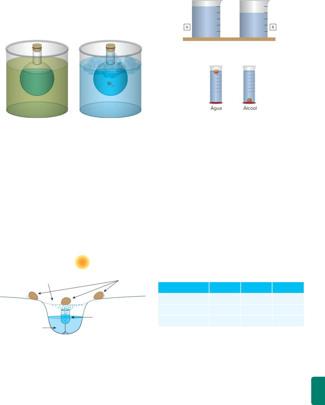 F R E N T E 2 175 3 Fuvest Ácido acético e bromo, sob pressão de 1 atm, estão em recipientes imersos em banhos, como mos- trado na figura adiante. Nessas condições, qual é o estado físico preponderante de cada uma dessas substâncias? CH 3 COOH óleo a 150°C água líquida em equilíbrio com gelo Dados: O ácido acético apresenta temperatura de fu- são igual a 17 oC e temperatura de ebulição a 1 atm igual a 118 oC. O bromo apresenta temperatura de fu- são igual a -7 oC e temperatura de ebulição a 1 atm igual a 59 oC. A Ácido acético sólido e bromo líquido. B Ácido acético líquido e bromo gasoso. C Ácido acético gasoso e bromo sólido. Ácido acético sólido e bromo gasoso. E Ácido acético gasoso e bromo líquido. 4 Unicamp A figura adiante mostra o esquema de um processo usado para a obtenção de água potável a partir de água salobra (que contém alta concentração de sais). Este “aparelho” improvisado é usado em re- giões desérticas da Austrália. solo água salobra água potável Pedras Plástico transparente Sol a) Que mudanças de estado ocorrem com a água, dentro do “aparelho”? b) Onde, dentro do “aparelho”, ocorrem estas mu- danças? c) Qual destas mudanças absorve energia e de onde esta energia provém? 5 Qual é a diferença entre vapor e gás? 6 Unicamp (Adapt.) Dois frascos idênticos estão esque- matizados a seguir. Um deles contém uma certa massa de água (H2O) e o outro, a mesma massa de álcool (CH3CH2OH). Dado: Usando-se uma bolinha de densidade adequa- da fez-se o experimento a seguir. Qual das substâncias está no frasco A e qual está no frasco B? Justique. 7 Enem Libras 2017 Alguns fenômenos observados no cotidiano estão relacionados com as mudanças ocorridas no estado físico da matéria. Por exemplo, no sistema constituído por água em um recipiente de barro, a água mantém-se fresca mesmo em dias quentes. A explicação para o fenômeno descrito é que, nas proximidades da superfície do recipiente a A condensação do líquido libera energia para o meio. B sublimação do sólido retira energia do sistema. C evaporação do líquido retira energia do sistema. solidificação do líquido libera energia para o meio. E fusão do sólido retira energia do sistema. 8 UFRGS 2019 A água é uma das raras substâncias que se pode encontrar, na natureza, em três estados de agre- gação. O quadro abaixo mostra algumas características dos diferentes estados de agregação da matéria. Propriedade Sólido Líquido Gasoso Fluidez Não fluido Fluido I Mobilidade molecular Quase nula II Grande Forças de interação Fortes III Fracas Assinale a alternativa que preenche corretamente as lacunas do quadro acima, indicadas com I, II e III, res- pectivamente. A Não fluido – Pequena – Moderadamente fortes B Não fluido – Grande – Fracas C Fluido – Pequena – Moderadamente fortes Fluido – Grande – Fracas E Fluido – Quase nula – Muito fortes 9 EsPCEx 2018 “Sempre que uma substância muda de fase de agregação, a temperatura permanece constante enquanto a mudança se processa, desde que a pressão permaneça constante”. FONSECA Martha Reis Marques da, Química Geral, São Paulo: Ed FTD, 2007, pág 41. QUÍMICA Capítulo 1 Estados físicos e suas mudanças176 O gráco a seguir representa a mudança de fase de agregação de uma substância pura com o passar do tempo, em função da variação de temperatura, obser- vada ao se aquecer uma substância X durante algum tempo, sob pressão constante. Tomando-se como base o gráco, analise as seguin- tes armativas: I. entre 0 °C e 19 °C, a substância X encontra-se na fase sólida; II. o intervalo de 2,0 min a 4,0 min corresponde à condensação da substância X; III. a temperatura de 60 °C corresponde à temperatu- ra de ebulição da substância X; IV. no intervalo de 40 °C a 50 °C, a substância X en- contra-se na fase líquida. Estão corretas apenas as armativas A I e II. b II e IV. C I, II e III. d II, III e IV. e I, III e IV. 10 Cefet-MG 2018 Um estudante recebeu uma amostra de água pura, sob pressão de 1 atm, inicialmente à 50 °C. A amostra foi submetida ao resfriamento até alcançar 0 °C, permanecendo por alguns minutos, nessa temperatura. Posteriormente, foi aquecida e mantida a 100 °C. Consi- derando-se que as temperaturas de fusão e ebulição da água pura, a 1 atm, são, respectivamente, 0 e 100 °C, o gráfico da temperatura em função do tempo que esboça essa transformação é 11 UFG Considere as seguintes propriedades de 3 subs- tâncias. Substância A: quando colocada dentro de um reci- piente, move-se sempre para o fundo. Substância B: quando colocada dentro de um reci- piente, espalha-se por todo o espaço disponível. Substância C: quando colocada dentro de um reci- piente, move-se sempre para o fundo, espalhando-se e cobrindo-o. Os estados físicos das substâncias A, B e C são, res- pectivamente: A líquido, sólido e gasoso. b gasoso, sólido e líquido. C sólido, gasoso e líquido. d sólido, líquido e gasoso. e gasoso, líquido e sólido. 12 UEPG 2019 Com base na densidade (g/cm³ a 25 °C) das substâncias e materiais apresentados abaixo, as- sinale o que for correto. Substância Densidade Substância Densidade Água 1,00 Mercúrio 13,5 Azeite 0,92 Ouro 19,3 gasolina 0,70 Quartzo 2,65 01 A água flutua sobre a gasolina. 02 O ouro afunda no mercúrio. 04 O quartzo flutua sobre o mercúrio. 08 O azeite flutua sobre a gasolina. Soma: 13 UFF São dadas as soluções: – argônio dissolvido em nitrogênio; – dióxido de carbono dissolvido em água; – etanol dissolvido em acetona; – mercúrio dissolvido em ouro. Estas soluções, à temperatura ambiente, são clas- sicadas de acordo com seu estado físico em, respectivamente: A líquida, líquida, gasosa, líquida. b gasosa, gasosa, líquida, sólida. C líquida, gasosa, líquida, líquida. d gasosa, líquida, líquida, sólida. e líquida, gasosa, líquida, só