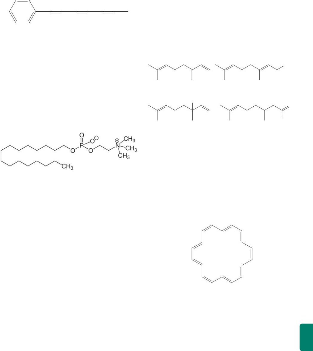 F R E N T E 1 55 14 Ufes O chá da planta Bidens pilosa, conhecida vulgar- mente pelo nome de picão, é usado para combater icterícia de recém-nascidos. Das folhas dessa planta, é extraída uma substância química, cujo nome ocial é 1-fenilepta-1,3,5-tri-ino e cuja estrutura é apresen- tada a seguir. Essa substância possui propriedades antimicrobianas e, quando irradiada com luz ultravio- leta, apresenta atividade contra larvas de mosquitos e nematoides. Sobre a estrutura dessa substância, pode-se armar que: A possui 12 átomos de carbono com hibridização sp2. b possui 12 ligações σ carbono-carbono. C não possui carbonos com hibridização sp3. d possui 3 átomos de carbono com hibridização sp. possui 9 ligações π carbono-carbono. 15 UCS 2018 A leishmaniose é uma doença muito conhecida pe- los brasilienses. Depois de 2010, quando seis casos foram detectados em humanos, e muitos cachorros tiveram o diag- nóstico confirmado só no Distrito Federal (DF), a cidade inteira aprendeu e não esqueceu mais o nome do distúrbio. Em 2016, segundo a Secretaria de Saúde do DF, 408 casos em cães foram confirmados. Nos três primeiros me- ses de 2017, 60 animais tiveram o exame positivo. Na falta de tratamento, o procedimento padrão era a eutaná- sia. Os ministérios da Agricultura e da Saúde, inclusive, proibiam o tratamento da Leishmaniose Visceral Cani- na com produtos feitos para o uso humano. Em outubro de 2016, foi aprovado o primeiro tratamento específico para cães, os quais, agora, dispõem de uma opção. O Milteforan, da Empresa Virbac, está à venda desde então. “O remédio tem como princípio ativo a miltefosina (vide estrutura química acima), que atua na membrana do pa- rasita, ocasionando sua morte e evitando sua replicação. Além disso, a substância também funciona como imu- nomodulador, proporcionando ao animal em tratamento a resposta imune desejada para o controle da doença”, explica Larissa Benetolo, veterinária e promotora técnica de prescrição da Virbac. Ela conta ainda que, além da melhora clínica dos cães doentes, a carga de parasitas dos animais é diminuída consideravelmente, bloqueando a transmissão. Disponível em: <http://www.metropoles.com/vida-e-estilo/ bem-estar/saude-bem-estar/novo remedio-para-tratamento- de-leishmaniose-ja-esta-disponivel>. Disponível em: <http://www.wikiwand.com/es/Miltefosina>. Acesso em: 23 ago. 17. (Parcial e adaptado.) Em relação à molécula da miltefosina, é correto ar- mar que A apresenta apenas átomos de carbono com hibridi- zação sp3. b apresenta apenas átomos de carbono secundários. C tem cadeia carbônica fechada e insaturada. d tem três radicais arila ligados a um átomo de nitro- gênio tetravalente. apresenta um átomo de fósforo com geometria trigonal. 16 UFSM O odor de muitos vegetais, como o de menta, louro, cedro e pinho, e a cor de outros, como a de ce- nouras, tomates e pimentões, são causados por uma grande classe de compostos naturais denominados terpenos. Observe o esquema a seguir. OH Mirceno Geraniol Linalol Citronelal OH O H Marque a alternativa que apresenta, corretamente, o número de elétrons π correspondente a cada ter- peno. A 4 – Mirceno; 2 – Geraniol; 4 – Linalol; 4 – Citronelal. b 6 – Mirceno; 4 – Geraniol; 4 – Linalol; 2 – Citronelal. C 6 – Mirceno; 4 – Geraniol; 4 – Linalol; 4 – Citronelal. d 4 – Mirceno; 2 – Geraniol; 2 – Linalol; 2 – Citronelal. 6 – Mirceno; 4 – Geraniol; 2 – Linalol; 6 – Citronelal. 17 UFU O anuleno é um hidrocarboneto aromático que apresenta a seguinte fórmula estrutural simplificada. Sobre esse composto, pode-se armar que: A tem fórmula molecular C18H20, 9 ligações pi (π) e ân- gulos de 109° entre as ligações carbono-carbono. b tem fórmula molecular C18H18, 9 ligações pi (π) e ân- gulos de 120° entre as ligações carbono-carbono. C tem fórmula molecular C18H16, 9 elétrons pi (π) e ân- gulos de 109° entre as ligações carbono-carbono. d tem fórmula molecular C18H20, 9 elétrons pi (π) e ân- gulos de 120° entre as ligações carbono-carbono. QUÍMICA Capítulo 5 Introdução à Química Orgânica56 18 UFPI A estrutura do acetaminofen, responsável pela atividade analgésica e antipirética do Tylenol, é dada a seguir. H C CH 3 H O O N Escolha a opção cujos itens relacionam-se com a es- trutura fornecida. A no de elétrons π: 6; no de elétrons não ligante: 6; no de carbonos sp2: 6; no de carbonos saturados: 2. b no de elétrons π: 8; no de elétrons não ligante: 8; no de carbonos sp2: 6; no de carbonos saturados: 2. C no de elétrons π: 8; no de elétrons não ligante: 10; no de carbonos sp2: 1; no de carbonos saturados: 7. d no de elétrons π: 6; no de elétrons não ligante: 8; no de carbonos sp2: 6; no de carbonos saturados: 2. no de elétrons π: 8; no de elétrons não ligante: 10; no de carbonos sp2: 7; no de carbonos saturados: 1. 19 Unifesp O azeite de oliva é considerado o óleo vegetal com sabor e aroma mais refinados. Acredita-se que ele diminui os níveis de colesterol no sangue, reduzin- do os riscos de doen ças cardíacas. Suspeita-se que algumas empresas misturem óleos de amendoim, mi- lho, soja e outros, mais baratos, com o azeite de oliva, para aumentar seus lucros. Os triglicerídeos diferem uns dos outros em relação aos tipos de ácidos graxos e à localização no glicerol. Quando um triglicerídeo é formado a partir de dois ácidos linoleicos e um ácido oleico, temos o triglicerídeo LLO. No azeite de oliva, há predominância do OOO e no óleo de soja, do LLL. Como os triglicerídeos são característicos de cada tipo de óleo, sua separação e identificação tornam possível a análise para detectar possíveis adultera- ções do azeite. Triglicerídeo CH CH2 CH2 O O C R1 O O C R2 O O C R3 Na tabela, são apresentados os ácidos graxos mais comuns. Ácido Número de átomos de carbono Número de ligações c = c Palmítico 1