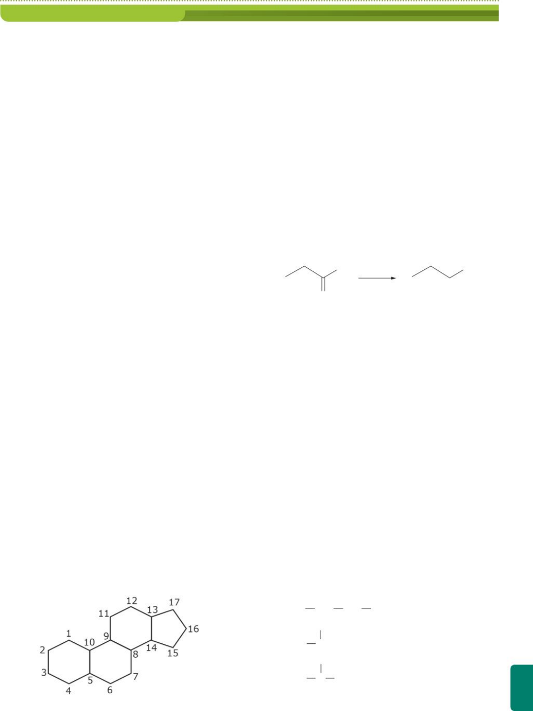 F R E N T E 1 109 Exercícios complementares 1 Uerj A análise qualitativa de uma substância orgânica desconhecida revelou a presença de carbono, oxigê- nio e hidrogênio. Podemos armar que essa substância não pertence à função denominada: A éster. b fenol. C hidrocarboneto. d ácido carboxílico. 2 Fatec O Gás Liquefeito de Petróleo, GLP, é uma mistu- ra de propano, C3H8, e butano, C4H10. Logo, esse gás é uma mistura de hidrocarbonetos da classe dos: A alcanos. b alcenos. C alcinos. d cicloalcanos. e cicloalcenos. 3 Uema 2015 Diversos produtos tão comuns em nosso dia a dia são obtidos a partir de alcenos, hidrocarbonetos de cadeia aberta que contêm uma dupla ligação com fórmula geral CnH2n, por exemplo: plásticos, tecidos sintéticos, corantes e, até mesmo, explosivos. O eteno costuma ser utilizado como anestésico em intervenções cirúrgicas e no amadurecimento de frutas, mostrando que eles têm importâncias estratégicas para diferentes atividades humanas. Fonte: Disponível em: <www.brasilescola.com/quimica/alcenos.htm>. Acesso em: 12 set. 2014. Escreva a fórmula estrutural e nomine, ocialmente, o terceiro composto da série desse hidrocarboneto. 4 Uece 2020 Presentes em quase todas as formas de vida e sintetizados pelos próprios organismos, os esteroides fazem parte de um grupo complexo de compostos que interagem para a manutenção da vida. Fazendo parte de uma classe de lipídios, quando analisados do ponto de vista químico, os esteroides são identificados como compostos lipossolúveis, deri- vados de triterpenos tetracíclicos. No corpo humano, destacam-se os esteroides colesterol, testosterona e estradiol. A classe dos esteroides deriva do anel or- gânico ciclopentanoperidrofenantreno, cuja estrutura é a seguinte: Com relação a essa estrutura, é correto armar que: A existem 24 átomos de hidrogênio ligados a todos os átomos de carbono secundário. b o total de átomos de carbonos primários e terciá- rios é 6. C o anel orgânico ciclopentanoperidrofenantreno é aromático d como essa estrutura pertence à classe dos lipídios, trata-se de um carboidrato. 5 Enem 2015 Hidrocarbonetos podem ser obtidos em laboratório por descarboxilação oxidativa anódica, processo conhecido como eletrossíntese de Kolbe. Essa reação é utilizada na síntese de hidrocarbonetos diversos, a partir de óleos vegetais, os quais podem ser empregados como fontes alternativas de energia, em substituição aos hidrocarbonetos fósseis. O es- quema ilustra simplificadamente esse processo. O eletrólise + 2 CO 2 KOH Metanol 2 OH AZEVEDO, D. C.; GOULART, M. O. F. Estereosseletividade em reações eletródicas. Química Nova, n. 2, 1997. (Adapt.) Com base nesse processo, o hidrocarboneto produ- zido na eletrólise do ácido 3,3-dimetil-butanoico é o A 2,2,7,7-tetrametil-octano. b 3,3,4,4-tetrametil-hexano. C 2,2,5,5-tetrametil-hexano. d 3,3,6,6-tetrametil-octano. e 2,2,4,4-tetrametil-hexano. 6 Mackenzie Quase nada se sabe sobre o destino do lixo industrial perigoso produzido no Brasil até meados de 1976. Como muitas substâncias do lixo perigoso são resistentes ao tempo, esse passado de poluição está começando a vir à tona. No solo de um conjunto habi- tacional da Grande São Paulo, constatou-se a presença de 44 contaminantes. Dentre eles, destacam-se o tri- metil-benzeno, o clorobenzeno, o decano, além de um de fórmula molecular C6H6, que é considerado o mais tóxico. Folha de S.Paulo, 28 ago. 2001. (Adapt.) Na substância trimetil-benzeno, o anel benzênico é ramicado por radicais: A H3C b H 3 C CH 2 CH 2 CH 2 C CH 3 CH 3 CH d H 3 C CH 3 C CH 3 e H3C CH2 QUÍMICA Capítulo 6 Nomenclatura dos compostos orgânicos110 7 UEM Assinale a(s) alternativa(s) correta(s). 01 A ligação dupla de um alceno é formada por uma ligação σ mais forte e uma ligação π mais fraca. 02 A ligação tripla de um alcino é mais longa que a ligação simples de um alcano. 04 No 2-metil-pent-2-eno, todos os carbonos apre- sentam hibridização sp3. 08 Um composto com fórmula molecular C6H12 pode ser um hidrocarboneto de cadeia cíclica e saturada. 16 O gás natural é formado principalmente por pro- pano e butano. Soma: 8 UFRRJ O isoctano e outras moléculas de hidrocarbo- netos ramificados são mais desejáveis, nas gasolinas comerciais, do que moléculas de cadeia linear, uma vez que estas sofrem ignição de forma explosiva, cau- sando até perda de potência. H 3 C C CH 3 CH 3 CH 2 CH CH 3 CH 3 Isoctano Assinale a opção que apresenta a nomenclatura cor- reta do isoctano. A 2,2,3-trimetilpentano. 2,2,4-trimetilpentano. C 2,2,4-trimetilbutano. 2,2,3-dimetilpentano. E 2,2,4-trimetil-hexano. 9 FGV A destilação de hulha produz uma série de com- postos, um dos quais é um hidrocarboneto de massa molar 78 g/mol. Considerando-se que as massas molares do carbono, hidrogênio e oxigênio são, res- pectivamente, 12, 1 e 16 g/mol, concluímos que esse hidrocarboneto é: A hexeno. benzeno. C pentano. ciclopentano. E hexano. 10 UFPE De acordo com a estrutura do composto or- gânico, cuja fórmula está esquematizada a seguir, podemos dizer que: H 3 C C H CH 3 CH CH 2 CH 3 C CH 3 H CH 2 CH 2 CH 3 o composto é um hidrocarboneto de fórmula C 11 H 24 . o composto apresenta somente carbonos sp3. o nome correto do composto, segundo a Iupac, é 2-metil-4-isopropil-heptano. o composto é um carboidrato de fórmula C 11 H 24 . o hidrocarboneto aromático possui ligações σ e π. 11 UEM Sabendo-se que um composto apresenta fórmula molecular C8H18, assinale a(s) alternativa(s) correta(s). 01 O composto pode ser o 2-octeno. 02 O composto pode ser o 2,2,4-trimetil-pentano. 04 O composto pode apresentar o radical n-butil. 08 O composto pode apresentar 3 carbonos primários, 4 secundários e 1 terciário. 16 O composto poderá apresentar 1 carbono sp2 e 7 carbonos sp3. 32 A hidrogenação desse composto poderá formar o C8H20. Soma: 12 UEL Uma alternativa para os catalisadores de célu