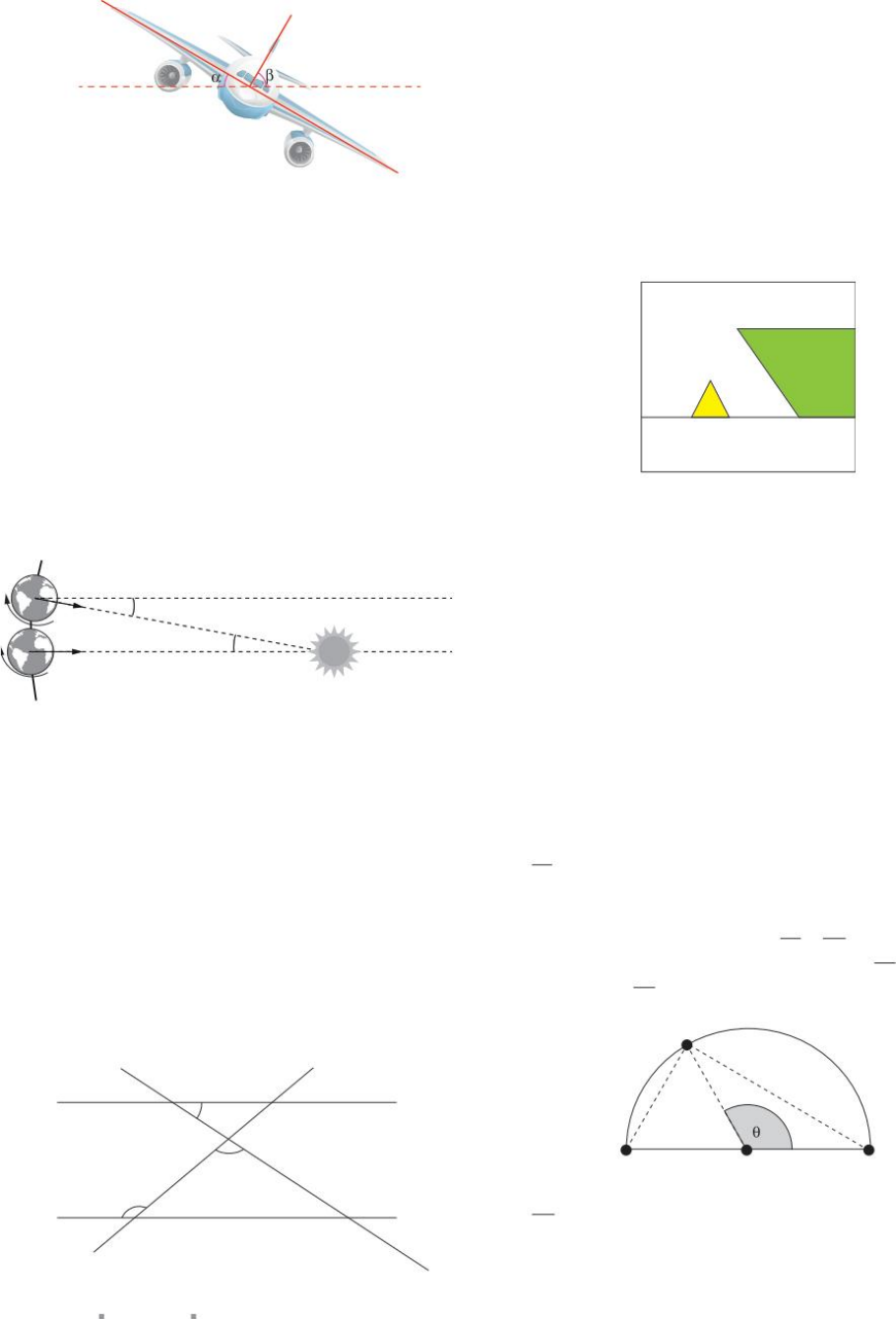 MATEMÁTICA Capítulo 2 Princípios de Geometria Plana274 14 Observando o voo de um avião, pode-se perceber que seu leme fica em uma direção perpendicular às suas asas, mesmo quando estas não estão na hori- zontal, como mostra a figura a seguir. r s t Considere que a reta r, determinada pelas asas do avião, tenha uma inclinação de medida α em relação à linha s; e a semirreta t, determinada pelo leme do avião, tenha inclinação de medida β em relação à reta s, como mostra a gura anterior. Assim, se a inclinação β é 10° superior à inclinação α, pode-se concluir que: A α = 20° b α = 30° C α = 40° D α = 50° E α = 60° 15 Dia solar é o nome dado ao intervalo de tempo decor- rido entre duas passagens sucessivas do Sol por um meridiano local qualquer. Considerando a órbita da Terra como circular, pode-se estimar que ela percorre, em sua órbita, um arco de 0,986° por dia. Observe a situação ilustrada na figura a seguir. (2) Terra após um dia solar. 0,986o 0,986o (1) Terra em um certo dia Retas paralelas Sol A respeito da posição relativa, os dois ângulos de 0,986° indicados na gura são: A alternos externos. b alternos internos. C correspondentes. D colaterais internos. E colaterais externos. 16 IFPE 2012 Júlia começou a estudar Geometria na sua escola Com dúvida em um exercício passado pelo professor de Matemática, ela pediu ajuda ao seu tio O enunciado era: “As retas r e s são paralelas; as retas u e t, duas transversais Encontre o valor do ângulo x na figura a seguir” u x 20o 120o r s t Portanto, o valor de x é: A 120° b 125° C 130° D 135° E 140° 17 UTFPR 2013 Um triângulo isósceles tem dois lados con- gruentes (de medidas iguais) e o outro lado é chamado de base. Se, em um triângulo isósceles, o ângulo ex- terno relativo ao vértice oposto da base mede 130°, então os ângulos internos desse triângulo medem: A 10°, 40° e 130°. b 25°, 25° e 130°. C 50°, 60° e 70°. D 60°, 60° e 60°. E 50°, 65° e 65°. 18 Na figura a seguir, considere um trapézio retângulo e um triângulo isósceles. Se a base menor desse trapézio e a base desse triân- gulo são colineares, então, sabendo que o ângulo agudo do trapézio mede 72° e o ângulo oposto à base do triângulo mede 30°, podemos concluir que as retas que contêm o lado oblíquo do trapézio e o lado do triângulo mais próximo ao trapézio, sem ser a base, formam um ângulo agudo de: A 1° b 2° C 3° D 4° E 5° 19 Enem PPL 2012 Durante seu treinamento, um atleta per corre metade de uma pista circular de raio R, conforme a figura a seguir A sua largada foi dada na posição re- presentada pela letra L, a chegada está representada pela letra C, e a letra A representa o atleta. O segmento LC é um diâmetro da circunferência, e o centro da cir- cunferência está representado pela letra F Sabemos que, em qualquer posição que o atleta esteja na pista, os segmentos LA e AC são perpendi- culares. Seja θ o ângulo que o segmento AF faz com o segmento FC. A L R F R C Quantos graus mede o ângulo θ quando o segmento AC medir R durante a corrida? A 15 graus. b 30 graus. C 60 graus. D 90 graus. E 120 graus. F R E N T E 3 275 20 Mackenzie 2012 Na figura, se a circunferência tem cen- tro O e BC = OA, então a razão entre as medidas dos ângulos AÔD e CÔB é: D A O C B A 5 2 b 3 2 C 2 D 4 3 E 3 21 Um garoto descuidado fechou seu caderno deixando que uma de suas folhas retangulares ficasse dobrada, formando um ângulo de 40° em sua base, como mostra a figura a seguir: Assinale a alternativa que apresenta a medida, em graus, do menor ângulo agudo do triângulo determi- nado pela dobradura. A 10° b 15° C 20° D 25° E 30° 22 IFRJ 2017 Uma fita de papel retangular é dobrada con- forme a figura a seguir 155o O valor do ângulo α marcado na gura é A 155° b 150° C 140° D 130° 23 Uece 2016 No retângulo PQRS a medida dos lados PQ e QR são respectivamente 3 m e 2 m. Se V é um ponto do lado PQ tal que a medida do segmento VQ é igual a 1 m e U é o ponto médio do lado PS, então, a medi da, em graus, do ângulo VÛR é: A 40 b 35 C 50 D 45 24 ESPM 2013 Na figura a seguir, ABCD é um quadrado, BDE é um triângulo equilátero e BDF é um triângulo isósceles, em que AF = AB. A medida do ângulo α é: B F E C A D A 120° b 135° C 127,5° D 122,5° E 110,5° 25 Ifal 2016 Na figura a seguir, calcule o ângulo α. 42o 37o 30o 38o Dica: Use o resultado do ângulo externo de um triân- gulo. A 30° b 33° C 37° D 38° E 42° MATEMÁTICA Capítulo 2 Princípios de Geometria Plana276 26 A figura a seguir apresenta três círculos de raios dife- rentes, limitados por circunferências tangentes duas a duas. Sabendo que os lados do triângulo, cujos vértices são os centros desses círculos, medem 9 cm, 10 cm e 11 cm, pode-se concluir que o comprimento da maior circunferência e a área do menor círculo valem, res- pectivamente: A 6π cm e 16π cm2 b 6π cm e 8π cm2. C 10π cm e 8π cm2. D 12π cm e 16π cm2. E 12π cm e 8π cm2 27 Uerj 2012 A figura a seguir representa um círculo de centro O e uma régua retangular, graduada em milí- metros. Os pontos A, E e O pertencem à régua e os pontos B, C e D pertencem, simultaneamente, à régua e à circunferência 0 A B DE C O 1 2 3 4 5 Considere os seguintes dados: Segmentos Medida (cm) AB 1,6 ED 2,0 EC 4,5 O diâmetro do círculo é, em centímetros, igual a: A 3,1 b 3,3 C 3,5 D 3,6 28 UPE 2016 Num experimento de física realizado em sala, foi solta do topo de uma rampa de 0,30 m de altura uma esfera que percorreu certa distância, fa- zendo um looping no final. Partindo do princípio de que o triângulo representado é retângulo, qual a dis- tância total aproximada que essa bola irá percorrer do topo da rampa até dar uma volta completa no aro da circunferência cujo raio é de 0,10 m? Adote π = 3,14 0,40 m 6 A 1,13 m. b 1,28 m. C 1,57 m. D 2,00 m. E 2,07 m. 29 UTFPR 2012 A London Eye, também conhecida com