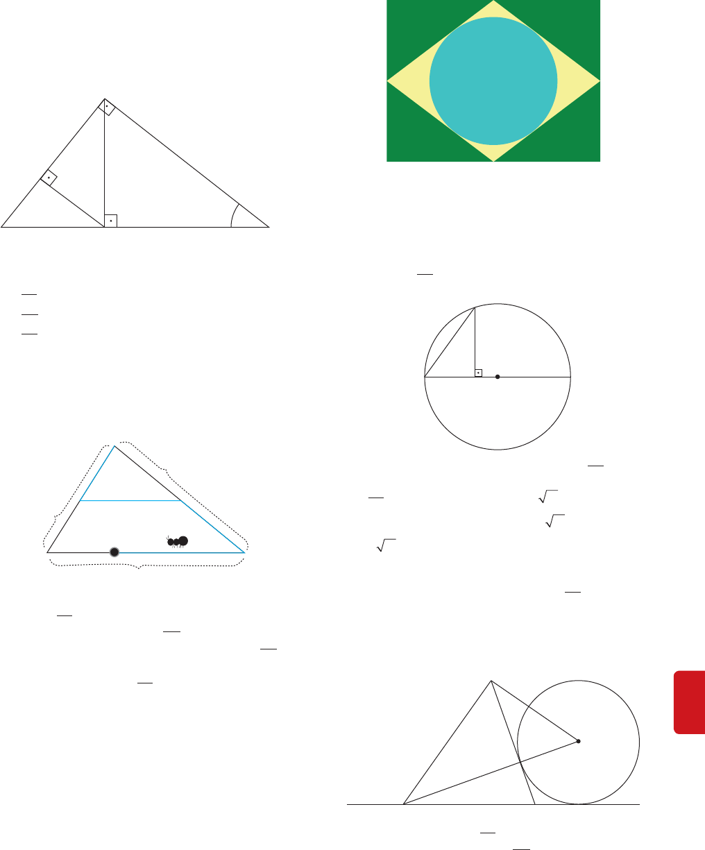 F R E N T E 3 325 31 Fuvest 2011 As circunferências C1 e C2 estão centradas em O1 e O2, têm raios r1 = 3 e r2 = 12, respectivamente, e tangenciam-se externamente. Uma reta t é tangente a C1 no ponto P1, tangente a C2 no ponto P2 e intercepta a reta O1O2 no ponto Q. Sendo assim, determine: a) o comprimento P1P2. ) a área do quadrilátero O1O2 P2P1. c) a área do triângulo QO2P2. 32 Na figura a seguir, os ângulos CAE , ADE e ABD são retos. O ângulo AED mede 30° e AC = x A B C D 30º E Escreva em função de x as medidas dos seguintes segmentos: a) CE ) CD c) BD 33 No muro do quintal de uma casa foi desenhado um triângulo de lados 15 cm, 20 cm e 25 cm, como mostra a figura A B M H N C 15 cm 20 cm 25 cm Uma formiga parte do vértice A do triângulo e segue pelo lado AB até seu ponto médio M. Depois disso, ela atravessa a base média MN do triângulo ABC e, ao chegar ao ponto N, segue sobre o lado AC até chegar ao vértice C. Então, nalmente, ela percorre parte do lado horizontal BC do triângulo até chegar a um pequeno orifício situado no ponto H, bem abaixo do vértice A do triângulo. Se os pontos A e H determinam uma reta vertical, en- tão o comprimento total da trajetória percorrida por essa formiga é de: A 30 cm. b 36 cm. C 40 cm. d 46 cm. E 56 cm. 34 Um tapete retangular comemorativo da Copa do Mundo de 2014 contém um desenho que imita a ban- deira brasileira. Nesse desenho, há um losango com os vértices sobre os pontos médios dos lados do ta- pete e um círculo que é tangente aos quatro lados desse losango. Se as dimensões do tapete retangular são de 3 m por 4 m, determine a medida do raio do círculo inscrito no losango 35 EsPCEx 2017 Na figura, o raio da circunferência de centro O é 25 2 cm e a corda MP mede 10 cm. P Q O NM A medida, em centímetros, do segmento PQ é: A 25 2 b 10 C 5 21 d 21 E 2 21 36 Fuvest 2015 Na figura a seguir, a circunferência de cen- tro em O e raio r tangencia o lado BC do triângulo ABC no ponto D e tangencia a reta AB no ponto E. Os pontos A, D e O são colineares, AD = 2r e o ângulo ACO é reto. Determine, em função de r: C O D BA E a) a medida do lado AB do triângulo ABC. ) a medida do segmento CO MATEMÁTICA Capítulo 3 Teoria das proporções geométricas326 37 ITA 2015 Seja ABCD um trapézio isósceles com a base maior AB medindo 15, o lado AD medindo 9 e o ângulo ADB reto. A distância entre o lado AB e o ponto E em que as diagonais se cortam é: A 21 8 b 27 8 C 35 8 d 37 8 E 45 8 38 ITA 2014 Considere o trapézio ABCD de bases AB e CD Sejam M e N os pontos médios das diagonais AC e BD , respecti vamente Então, se AB tem comprimento x e CD tem comprimento y < x, o comprimento de MN é igual a: A x y b 1 2 x y−( ) C 1 3 x y−( ) d 1 3 x y+( ) E 1 4 x y+( ) 39 FGV 2014 a) Para medir a largura x de um rio sem necessidade de cruzá-lo, foram feitas várias medições, como mostra a figura a seguir. Calcule a largura x do rio. C A x 24 m 2,5 m 2 m E D B ) Demonstre que a distância do vértice B ao bari- centro M de um triângulo é o dobro da distância do ponto E ao baricentro M. A M E C D B 40 Determine o comprimento da diagonal de um pentá gono regular de lado l cm. 4 CAPÍTULO Teorema dos senos e dos cossenos Devido à sua enorme importância para a arquitetura e a construção civil, entre outras áreas da tecnologia, as razões de semelhança existentes entre cada par de triângulos retângulos se mostraram insucientes em estabelecer uma forma prática e padronizada para os cálculos de comprimentos nessas guras. Assim, as razões de semelhança – que resultam do quociente entre medidas de elementos de guras diferentes – foram substituídas pelas razões trigonométricas que provêm do quociente entre os compri- mentos dos lados de uma mesma gura. Acontece que, depois de estabelecido o padrão de cálculo regido pelas tabelas de senos e cossenos, alguns geômetras procuraram estender sua aplicação a todos os triângulos, mesmo os não retângulos. FRENTE 3 F a c to ry T h / iS to c k p h o to .c o m