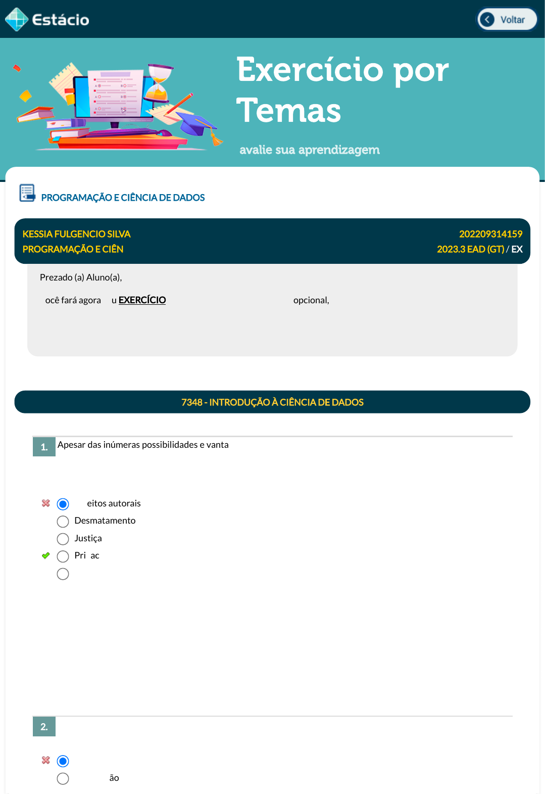 Exercício por Temas avalie sua aprendizagem Apesar das inúmeras possibilidades e vantagens que a ciência de dados produz para resolver problemas complexos e obter novos insights, a maneira adequada de usar e analisar dados, especialmente na atual sociedade tecnologicamente dependente, continua a enfrentar questões e desa�os éticos. Qual das alternativas abaixo retrata um desses desa�os éticos? Empresas orientadas a dados possuem vantagens competitivas em relação a empresas tradicionais. Assinale a alternativa que indica uma dessas vantagens. PROGRAMAÇÃO E CIÊNCIA DE DADOS KESSIA FULGENCIO SILVA 202209314159 PROGRAMAÇÃO E CIÊN 2023.3 EAD (GT) / EX Prezado (a) Aluno(a), Você fará agora seu EXERCÍCIO! Lembre-se que este exercício é opcional, mas não valerá ponto para sua avaliação. O mesmo será composto de questões de múltipla escolha. Após responde cada questão, você terá acesso ao gabarito comentado e/ou à explicação da mesma. Aproveite para se familiarizar com este modelo de questões que será usado na sua AV e AVS. 7348 - INTRODUÇÃO À CIÊNCIA DE DADOS 1. Direitos autorais Desmatamento Justiça Privacidade Pesquisa com seres humano Data Resp.: 10/12/2023 16:51:27 Explicação: A privacidade é a primeira preocupação que vem à mente de tantas pessoas quando falamos de ciência de dados. Como tirar valor dos dados e ao mesmo tempo evitar os danos que podem ocorrer devido à coleta, vinculação, análise e propagação dos nossos dados? Essa é uma questão que a ética pode nos ajudar a responder. 2. Usa modelo de gestão horizontal Utiliza mão de obra mais jovem javascript:voltar(); javascript:voltar(); javascript:voltar(); javascript:voltar(); A ciência de dados resolve problemas reais de negócios através de algoritmos que processam grandes quantidades de informações de maneira rápida e e�ciente.Indique a opção abaixo que descreve uma atividade que para nós seres humanos pode ser difícil de executar, mas que a ciência de dados pode facilmente dar conta. As habilidades de programação são indispensáveis para a ciência de dados. Selecione a alternativa que apresenta as duas linguagens de programação mais populares para ciência de dados. Compartilhar conhecimento com os membros da equipe, ter pensamento crítico e uma atitude voltada à resolução de problemas. Esses são aspectos de uma habilidade indispensável para um cientista de dados. Assinale a alternativa que indica corretamente essa habilidade. Pagam melhores dividendos Usam a ciência de dados para executar tarefas operacionais Investe alto em tecnologia Data Resp.: 10/12/2023 16:51:30 Explicação: Empresas orientadas a dados deixam a cargo da inteligência arti�cial as tarefas operacionais que se fossem conduzidas por serem humanos poderiam consumir muito mais tempo e deixar o processo mais custoso. 3. Recomendação de �lmes e livros Procura de preço de passagem área mais barata Monitoramento do trânsito urbano Armazenamento de grande volume de informações Descubra padrões e tendências em conjuntos de dados para obter insights Data Resp.: 10/12/2023 16:51:32 Explicação: Um dos maiores desa�os que a ciência de dados nos ajuda a superar é obter conclusões úteis a partir de enormes conjuntos de dados. As informações escondidas nos dados podem nos ajudar em uma série de questões que a sociedade enfrenta. 4. Pascal e Scala Fortran e Matlab Clipper e Java Python e R C# e Cobol Data Resp.: 10/12/2023 16:51:34 Explicação: Python é uma das linguagens de codi�cação mais populares usadas em ciência de dados devido à sua versatilidade e ao número de bibliotecas de ciência de dados disponíveis. R também é uma boa linguagem de programação de ciência de dados, pois funciona com várias plataformas e possui muitas bibliotecas para ciência de dados. 5. Trabalho em equipe Um projeto de ciência de dados para ser bem sucedido deve ter um objetivo bem de�nido. A a�rmação anterior diz respeito a qual das alternativas abaixo? Imaginemos que sua empresa desenvolveu uma solução big data para armazenar informações de vários tipos diferentes como documentos comerciais, e-mails, mídias sociais, respostas de pesquisas, imagens, áudio e vídeo. Como podemos classi�car esse tipo de informação? A inteligência arti�cial possui diversos subcampos. Qual é o campo de estudo que utiliza algoritmos e modelos estatísticos para aprender por meio de inferência e padrões sem serem explicitamente programados? Liderança Gerenciamento de tempo Programação Visualização dos dados Data Resp.: 10/12/2023 16:51:37 Explicação: Os cientistas de dados não trabalham dentro de uma bolha, e devem reconhecer a importância do trabalho em equipe e colaborar efetivamente com os outros. Eles precisam ouvir os outros membros da equipe e usar seu conhecimento em benefício da equipe. 6. Comunicação Resiliência Controle Foco Trabalho em equipe Data Resp.: 10/12/2023 16:51:40 Explicação: Foco - A coisa mais importante na ciência de dados é a pergunta. A segundo mais importante são os dados. Frequentemente, os dados limitarão ou permitirão você a responder a pergunta. Mas ter dados não pode salvá- lo se você não tiver uma pergunta bem de�nida, um foco. 7. Dataset Hadoop Dados não estruturados Data warehousing Dados estruturados Data Resp.: 10/12/2023 16:51:43 Explicação: Dados não estruturados são conjuntos de dados que não tem um modelo ou esquema de dados prede�nido. Os dados não estruturados são normalmente textuais como conversas em mídias sociais, mas também podem ser não textuais, como imagens, vídeo e áudio. 8. Data mining (mineração de dados) A ciência de dados e os resultados que ela proporciona podem ser complexos e difíceis de explicar. Apresentar a abordagem que foi utilizada e as descobertas obtidas a um público não técnico, como a equipe de marketing ou para executivos, é uma tarefa crucial para o c