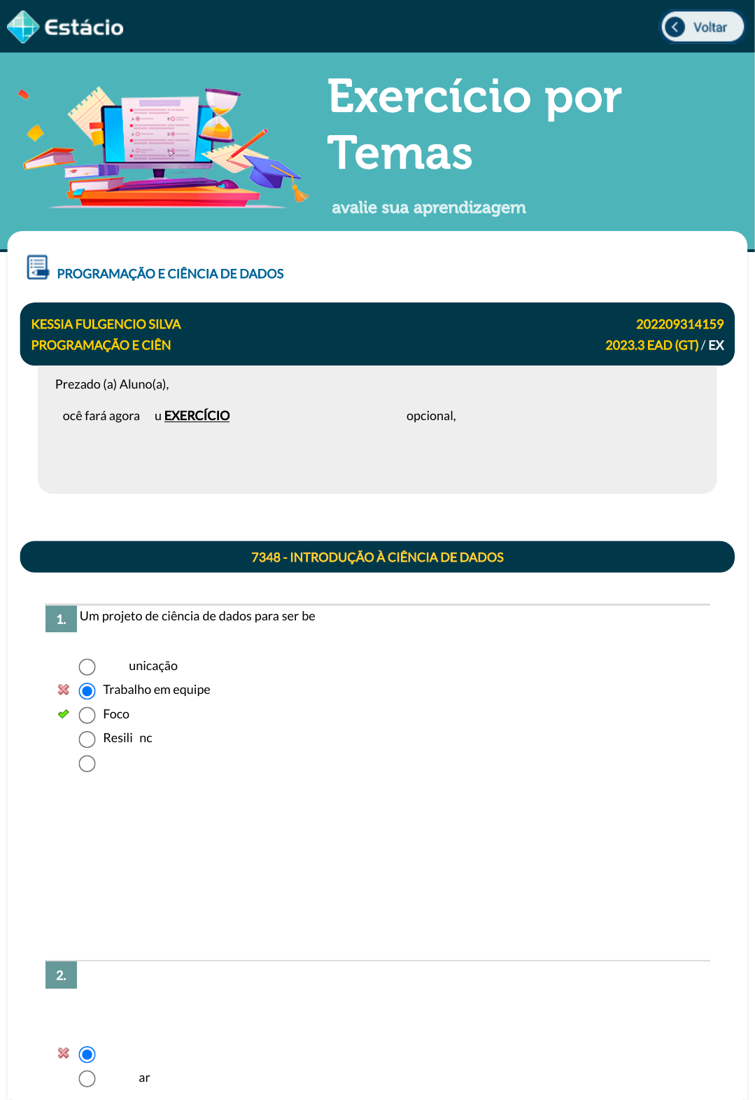 Exercício por Temas avalie sua aprendizagem Um projeto de ciência de dados para ser bem sucedido deve ter um objetivo bem de�nido. A a�rmação anterior diz respeito a qual das alternativas abaixo? A ciência de dados e os resultados que ela proporciona podem ser complexos e difíceis de explicar. Apresentar a abordagem que foi utilizada e as descobertas obtidas a um público não técnico, como a equipe de marketing ou para executivos, é uma tarefa crucial para o cientista de dados. Que ferramenta pode ser utilizada para comunicar os insights de um projeto de ciência de dados de forma e�caz? PROGRAMAÇÃO E CIÊNCIA DE DADOS KESSIA FULGENCIO SILVA 202209314159 PROGRAMAÇÃO E CIÊN 2023.3 EAD (GT) / EX Prezado (a) Aluno(a), Você fará agora seu EXERCÍCIO! Lembre-se que este exercício é opcional, mas não valerá ponto para sua avaliação. O mesmo será composto de questões de múltipla escolha. Após responde cada questão, você terá acesso ao gabarito comentado e/ou à explicação da mesma. Aproveite para se familiarizar com este modelo de questões que será usado na sua AV e AVS. 7348 - INTRODUÇÃO À CIÊNCIA DE DADOS 1. Comunicação Trabalho em equipe Foco Resiliência Controle Data Resp.: 07/12/2023 11:24:34 Explicação: Foco - A coisa mais importante na ciência de dados é a pergunta. A segundo mais importante são os dados. Frequentemente, os dados limitarão ou permitirão você a responder a pergunta. Mas ter dados não pode salvá- lo se você não tiver uma pergunta bem de�nida, um foco. 2. Linguagem de Consulta Estruturada Flip chart javascript:voltar(); javascript:voltar(); javascript:voltar(); javascript:voltar(); Apesar das inúmeras possibilidades e vantagens que a ciência de dados produz para resolver problemas complexos e obter novos insights, a maneira adequada de usar e analisar dados, especialmente na atual sociedade tecnologicamente dependente, continua a enfrentar questões e desa�os éticos. Qual das alternativas abaixo retrata um desses desa�os éticos? Algumas diretrizes são essencial para a condução de projetos de ciência de dados de modo mais transparente e respeitável. Assinale a alternativa que indica quais são essas diretrizes. A ciência de dados resolve problemas reais de negócios através de algoritmos que processam grandes quantidades de informações de maneira rápida e e�ciente.Indique a opção abaixo que descreve uma atividade que para nós seres humanos pode ser difícil de executar, mas que a ciência de dados pode facilmente dar conta. Python Algoritmos Data storytelling Data Resp.: 07/12/2023 11:24:37 Explicação: Data storytelling usa dados para comunicar efetivamente insights. Ela evita que informações críticas sejam perdidas e garante que a mensagem sendo transmitida seja signi�cativa e relevante. 3. Pesquisa com seres humano Privacidade Desmatamento Direitos autorais Justiça Data Resp.: 07/12/2023 11:24:40 Explicação: A privacidade é a primeira preocupação que vem à mente de tantas pessoas quando falamos de ciência de dados. Como tirar valor dos dados e ao mesmo tempo evitar os danos que podem ocorrer devido à coleta, vinculação, análise e propagação dos nossos dados? Essa é uma questão que a ética pode nos ajudar a responder. 4. Consentimento, clareza e controle. Controle, clareza e trabalho em equipe. Consentimento, comunicação e transparência. Gestão de dados. Abordagem centrada no cliente. Data Resp.: 07/12/2023 11:26:20 Explicação: Usuários devem consentir em ter seus dados coletados, ter a clareza de como eles serão posteriormente utilizados e o controle para determinar o que pode ser feito com eles. 5. Armazenamento de grande volume de informações As habilidades de programação são indispensáveis para a ciência de dados. Selecione a alternativa que apresenta as duas linguagens de programação mais populares para ciência de dados. Compartilhar conhecimento com os membros da equipe, ter pensamento crítico e uma atitude voltada à resolução de problemas. Esses são aspectos de uma habilidade indispensável para um cientista de dados. Assinale a alternativa que indica corretamente essa habilidade. Imaginemos que sua empresa desenvolveu uma solução big data para armazenar informações de vários tipos diferentes como documentos comerciais, e-mails, mídias sociais, respostas de pesquisas, imagens, áudio e vídeo. Monitoramento do trânsito urbano Recomendação de �lmes e livros Descubra padrões e tendências em conjuntos de dados para obter insights Procura de preço de passagem área mais barata Data Resp.: 07/12/2023 11:24:58 Explicação: Um dos maiores desa�os que a ciência de dados nos ajuda a superar é obter conclusões úteis a partir de enormes conjuntos de dados. As informações escondidas nos dados podem nos ajudar em uma série de questões que a sociedade enfrenta. 6. Pascal e Scala C# e Cobol Python e R Clipper e Java Fortran e Matlab Data Resp.: 07/12/2023 11:25:02 Explicação: Python é uma das linguagens de codi�cação mais populares usadas em ciência de dados devido à sua versatilidade e ao número de bibliotecas de ciência de dados disponíveis. R também é uma boa linguagem de programação de ciência de dados, pois funciona com várias plataformas e possui muitas bibliotecas para ciência de dados. 7. Visualização dos dados Programação Trabalho em equipe Gerenciamento de tempo Liderança Data Resp.: 07/12/2023 11:25:05 Explicação: Os cientistas de dados não trabalham dentro de uma bolha, e devem reconhecer a importância do trabalho em equipe e colaborar efetivamente com os outros. Eles precisam ouvir os outros membros da equipe e usar seu conhecimento em benefício da equipe. 8. Como podemos classi�car esse tipo de informação? A inteligência arti�cial possui diversos subcampos. Qual é o campo de estudo que utiliza algoritmos e modelos estatísticos para aprender por meio de inferência e padrões sem