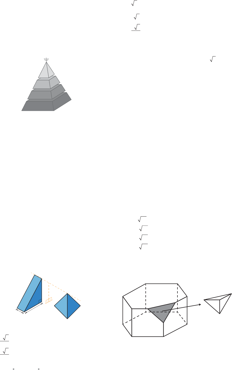 MATEMÁTICA Capítulo 13 Poliedros298 32 Enem Uma fábrica produz velas de parafina em forma de pirâmide quadrangular regular com 19 cm de altura e 6 cm de aresta da base. Essas velas são formadas por 4 blocos de mesma altura — 3 troncos de pirâmide de bases paralelas e 1pirâmide na parte superior —, espaçados de 1 cm entre eles, sendo que a base su- perior de cada bloco é igual à base inferior do bloco sobreposto, com uma haste de ferro passando pelo centro de cada bloco, unindo-os, conforme a figura. 6 cm 6 cm Se o dono da fábrica resolver diversicar o modelo, retirando a pirâmide da parte superior, que tem 1,5 cm de aresta na base, mas mantendo o mesmo molde, quanto ele passará a gastar com parana para fabricar uma vela? A 156 cm3 b 189 cm3 C 192 cm3 216 cm3 E 540 cm3 33 UFRGS 2012 Se duplicarmos a medida da aresta da base de uma pirâmide quadrangular regular e redu zirmos sua altura à metade, o volume desta pirâmide: A será reduzido à quarta parte. b será reduzido à metade. C permanecerá inalterado. será duplicado. E aumentará quatro vezes. 34 Famerp 2018 A figura indica um prisma reto triangular e uma pirâmide regular de base quadrada. A altura des- ses sólidos, em relação ao plano em que ambos estão apoiados, é igual a 4 cm, como indicam as figuras. 6 cm 4 cm 3 cm Se os sólidos possuírem o mesmo volume, a aresta da base da pirâmide, em centímetros, será igual a A 4 3 3 b 3 3 2 C 3 3 3 E 6 3 5 35 Qual é a medida da altura de uma pirâmide triangular regular cuja aresta da base mede 4 e cujo volume é igual ao volume de um cubo de aresta 2 3? 36 Enem 2016 É comum os artistas plásticos se apro- priarem de entes matemáticos para produzirem, por exemplo, formas e imagens por meio de manipu- lações. Um artista plástico, em uma de suas obras, pretende retratar os diversos polígonos obtidos pelas intersecções de um plano com uma pirâmide regular de base quadrada Segundo a classicação dos polígonos, quais deles são possíveis de serem obtidos pelo artista plástico? A Quadrados, apenas. b Triângulos e quadrados, apenas. C Triângulos, quadrados e trapézios, apenas. Triângulos, quadrados, trapézios e quadriláteros irre- gulares, apenas. E Triângulos, quadrados, trapézios, quadriláteros irre- gulares e pentágonos, apenas. 37 Uece 2018 Considere uma pirâmide regular hexagonal reta cuja medida da altura é 30 m e cuja base está inscrita em uma circunferência cuja medida do raio é igual a 10 m. Desejando-se pintar todas as faces triangulares dessa pirâmide, a medida da área a ser pintada, em m2, é A 115 39 . b 150 39 . C 125 39 . 140 39 38 Insper 2012 De cada vértice de um prisma hexagonal regular foi retirado um tetraedro, como exemplificado para um dos vértices do prisma desenhado a seguir. O plano que deniu cada corte feito para retirar os tetraedros passa pelos pontos médios das três ares- tas que concorrem num mesmo vértice do prisma. F R E N T E 3 299 O número de faces do poliedro obtido depois de te rem sido retirados todos os tetraedros é A 24. b 20 C 18 16 E 12 39 Enem 2016 Os sólidos de Platão são poliedros con vexos cujas faces são todas congruentes a um único polígono regular, todos os vértices têm o mes mo número de arestas incidentes e cada aresta é compartilhada por apenas duas faces Eles são impor tantes, por exemplo, na classificação das formas dos cristais minerais e no desenvolvimento de diversos objetos Como todo poliedro convexo, os sólidos de Platão respeitam a relação de Euler V A + F = 2, em que V, A e F são os números de vértices, arestas e faces do poliedro, respectivamente Em um cristal, cuja forma é a de um poliedro de Platão de faces triangulares, qual é a relação entre o número de vértices e o número de faces? A 2V 4F = 4 b 2V 2F = 4 C 2V F = 4 2V + F = 4 E 2V + 5F = 4 40 Uece 2016 Um poliedro convexo com 32 vértices pos sui apenas faces triangulares. O número de arestas desse poliedro é A 100 b 120 C 90 80 41 Enem 2016 Um lapidador recebeu de um joalheiro a encomenda para trabalhar em uma pedra preciosa cujo formato é o de uma pirâmide, conforme ilustra a Figura 1. Para tanto, o lapidador fará quatro cortes de formatos iguais nos cantos da base. Os cantos retirados correspondem a pequenas pirâmides, nos vértices P, Q, R e S, ao longo dos segmentos traceja- dos, ilustrados na Figura 2. Depois de efetuados os cortes, o lapidador obteve, a partir da pedra maior, uma joia poliédrica cujos núme ros de faces, arestas e vértices são, respectivamente, iguais a A 9, 20 e 13 b 3, 24 e 13 C 7, 15 e 12 10, 16 e 5. E 11, 16 e 5 42 Uma forma geométrica obtida na lapidação de pe- dras preciosas consiste em um poliedro convexo com exatamente 97 faces, sendo 32 triângulos, 64 quadri- láteros e 1 octógono F re d e ri k C h ri s to ff e rs e n / iS to c k p h o to .c o m Quantos vértices este poliedro possui? A 80 b 83 C 85 88 E 90 43 Enem 2017 O hábito cristalino é um termo utilizado por mineralogistas para descrever a aparência típica de um cristal em termos de tamanho e forma. A granada é um mineral cujo hábito cristalino é um poliedro com 30 arestas e 20 vértices. Um mineralogista construiu um modelo ilustrativo de um cristal de granada pela junção dos polígonos correspondentes às faces. Supondo que o poliedro ilustrativo de um cristal de granada é convexo, então a quantidade de faces utilizadas na montagem do modelo ilustrativo desse cristal é igual a A 10. b 12. C 25. 42. E 50. 44 UEPG 2018 Dois poliedros regulares são construídos utilizando folhas de cartolina. Um desses poliedros tem faces pentagonais e o outro tem faces triangula- res. Se a soma de todas as faces desses poliedros é 20, assinale o que for correto. 01 A soma dos ângulos de todas as faces do poliedro que tem faces pentagonais é 6480°. 02 O poliedro com faces triangulares tem 8 vértices a menos que o outro. 04 Os dois poliedros têm o mesmo número de arestas. 08 A soma de