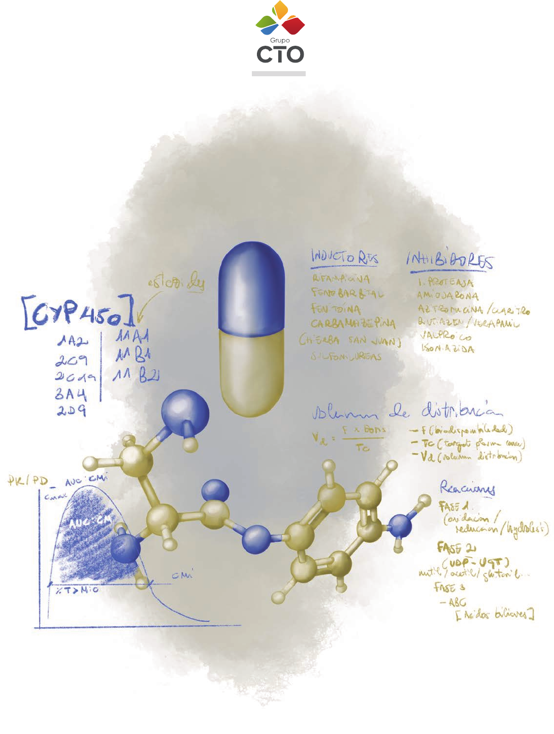 12ª Ed. Manual CTO de Medicina y Cirugía Farmacolog ía Editorial No está permitida la reproducción total o parcial de este libro, su tratamiento informático, la transmisión de ningún otro formato o por cualquier medio, ya sea electrónico, mecánico, por fotocopia, por registro y otros medios, sin el permiso previo de los titulares del copyright. © CTO EDITORIAL, S.L. 2021 Diseño y maquetación: CTO Multimedia Ilustración de portada: José María Martínez Ávila Agradecimientos: Sergio Mata Redondo Composición e impresión: Cañizares Artes Gráficas C/ Albarracín, 34; 28037 Madrid Tfno.: (0034) 91 782 43 30 - Fax: (0034) 91 782 43 43 E-mail: soporte.multimedia@grupocto.com Página Web: www.grupocto.com ISBN obra completa: 978-84-18866-44-9 ISBN Farmacología: 978-84-18866-39-5 Depósito legal: M-20063-2021 NOTA La medicina es una ciencia sometida a un cambio constante. A medida que la investigación y la experiencia clínica amplían nuestros conocimientos, son necesarios cambios en los tratamientos y la farmacoterapia. Los editores de esta obra han contrastado sus resultados con fuentes consideradas de confianza, en un esfuerzo por proporcionar información completa y general, de acuerdo con los criterios aceptados en el momento de la publicación. Sin embargo, debido a la posibilidad de que existan errores humanos o se produzcan cambios en las ciencias médicas, ni los editores ni cualquier otra fuente implicada en la preparación o la publicación de esta obra garantizan que la información contenida en la misma sea exacta y completa en todos los aspectos, ni son responsables de los errores u omisiones ni de los resultados derivados del empleo de dicha información. Por ello, se recomienda a los lectores que contrasten dicha información con otras fuentes. Por ejemplo, y en particular, se aconseja revisar el prospecto informativo que acompaña a cada medicamento que deseen administrar, para asegurarse de que la información contenida en este libro es correcta y de que no se han producido modificaciones en la dosis recomendada o en las contraindicaciones para la administración. Esta recomendación resulta de particular importancia en relación con fármacos nuevos o de uso poco frecuente. Los lectores también deben consultar a su propio laboratorio para conocer los valores normales. Editorial Autor Luis Cabeza Osorio Director de la obra Fernando de Teresa Galván VI Manual CTO de Medicina y Cirugía, 12.ª edición Índice 01. Introducción a la farmacología...........................................1 1.1. Introducción a la farmacología ............................................................1 1.2. Ramas de la farmacología. Farmacodinamia y farmacocinética ................................................2 1.3. Monitorización de fármacos .................................................................5 1.4. Vías de administración de los medicamentos .........................5 1 Introducción a la farmacología Orientación MIR Al igual que el resto de la asignatura tiene un peso pequeño en el examen MIR; no obstante, dente de la asignatura este tema es el más importante, siendo de especial interés conocer las reacciones adversas, los conceptos básicos de farmacocinética y farmacodinamia (rango terapéutico, nivel pico, nivel valle, biodisponibilidad, etc.) junto con las vías de administración más habituales. 1.1. Introducción a la farmacología La farmacología es la ciencia que estudia los fármacos o drogas y las pro- piedades y efectos sobre las funciones de los organismos vivos. • Fármaco: sustancia que se utiliza para prevenir (por ejemplo, vacu- nas), diagnosticar (por ejemplo, contrastes) o tratar o paliar una enfer- medad, o para modificar procesos fisiológicos. • Excipiente: sustancia inactiva usada para incorporar al principio activo, para ayudar al proceso de fabricación de un producto. Algunos de ellos se deben indicar en la composición del medicamento, siendo conocidos como excipientes de declaración obligatoria (EDO). • Medicamento: es el principio activo (o sus combinaciones) elabo- rado por la técnica farmacéutica para su uso terapéutico o médico. El medicamento es la suma del fármaco más los excipientes (medica- mento = fármaco + excipiente). Todo fármaco presenta acciones farmacológicas, que son el conjunto de efectos que aparecen en el organismo al administrar un fármaco, pudiendo ser de dos tipos: • Acciones terapéuticas: quedan definidas por su eficacia, efectividad y eficiencia. • Efectos indeseables: son reacciones adversas o efectos adversos (sinónimos). Según la OMS “es toda reacción nociva y no deseada que se presenta tras la administración de un fármaco, en dosis utilizadas habitualmente en la especie humana para prevenir, diagnosticar o tra- tar una enfermedad, o para modificar cualquier función biológica”. Los efectos adversos se clasifican en dos grupos, que son los que aparecen descritos en la Tabla 1.1. Atendiendo a su origen también se pueden clasificar en: • Causa farmacológica: - Teratogenicidad: capacidad del fármaco de producir alteracio- nes embrionarias o muerte fetal. Su uso se debe evitar en el embarazo. Durante la gestación se puede administrar ácido fólico, antiá- cidos, hierro y paracetamol. Aunque, siempre, a la hora de emplear un fármaco es importante valorar la relación beneficio/ riesgo que conlleva su administración. - Carcinogénesis: tiene lugar una alteración del genoma celular (ADN) que conduce a la transformación neoplásica (por ejemplo, fármacos antineoplásicos como los agentes alquilantes). - Tolerancia: aparece cuando se requiere aumentar la dosis de un fármaco para conseguir los mismos efectos, es decir, si se disminuyen los efectos de un fármaco tras la administración repetida de la misma dosis (por ejemplo, nitratos y opioides). - Farmacodependencia: es la desviación de uso que puede tener un fármaco. Hay dos tipos: › Dependenci
