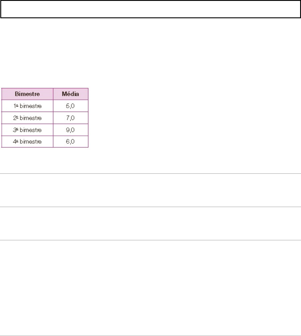 Trabalho media aritmética Questão 1 Observe o boletim escolar de Jerusa com a média de ciências em cada bimestre, e calcule a média aritmética de suas notas bimestrais. Gabarito: (5,0 + 7,0 + 9,0 + 6,0) ÷ 4 = 27 ÷ 4 = 6,75 Resolução: Questão 2 A média da disciplina de Ciências é calculada pela média ponderada de quatro avaliações, sendo que as duas primeiras têm peso dois e as outras duas têm peso três. Calcule a média ponderada das notas de Daniela, de acordo com o quadro a seguir. Gabarito: Resolução: Questão 3 A professora Celina realizou uma pesquisa com a sua turma sobre a mesada recebida pelos alunos, reunindo os dados na tabela a seguir. Calcule a média aritmética ponderada das mesadas dos alunos. Para esse cálculo, considere o peso como sendo a quantidade de alunos. Gabarito: Resolução: Questão 4 Os Jogos Pan-americanos são realizados de quatro em quatro anos. Participam atletas da América do Norte, América do Sul e América Central. De 10 a 26 de julho de 2015 o Canadá recebeu a 17ª edição dos jogos Pan-Americanos. Observe o quadro geral de medalhas dos primeiros cinco lugares. Posição País Medalhasde ouro Medalhas de prata Medalhas de bronze Total de medalhas 1 Estados Unidos 103 82 80 265 2 Canadá 78 69 71 218 3 Brasil 42 39 60 141 4 Cuba 36 27 34 97 5 Colômbia 27 14 31 72 Fonte: Comitê Olímpico Internacional. Disponível em :<www.toronto2015.org>. Acesso em: 28 nov. 2018. a) Qual a média aritmética da quantidade de medalhas de ouro conquistadas pelos cinco países mais bem colocados? b) Quais países da tabela apresentada ficaram com número de medalhas de ouro abaixo da média? c) Qual é a média aritmética do número de medalhas de prata e bronze conquistadas pelos cinco países? d) Qual é a média aritmética do total de medalhas desses cinco países? Gabarito: a) (103 + 78 + 42 + 36 + 27)/5 = 57,2 medalhas de ouro na média. b) Brasil, Cuba e Colômbia. c) Média de medalhas de prata: (82 + 69 + 39 + 27 + 14)/5 = 46,2 medalhas. Média de medalhas de bronze: (80 + 71 + 60 + 34 + 31)/5 = 55,2 medalhas d) (265 + 218 + 141 + 97 + 72)/5 = 158,6 medalhas. Resolução: Questão 5 A agência DVT Turismo fez uma pesquisa com 200 clientes para verificar o local preferido para excursões. O resultado está representado no gráfico a seguir. Gabarito: Resolução: Questão 6 A professora de Educação Física pediu a cada jogadora da equipe de vôlei que escrevesse a própria altura em uma lista. Observe a lista a seguir: Nome Daniela Fernanda Giovanna Lívia Leticia Marcela Júlia Graziela Altura 1,51 m 1,48 m 1,46 m 1,53 m 1,43 m 1,42 m 1,52 m 1,49 m Coloque as alturas das jogadoras em ordem crescente e, em seguida, indique qual a média de altura desta equipe Gabarito: 1,42 < 1,43 < 1,46 < 1,48 < 1,49 < 1,51 < 1,52 < 1,53 Média = (1,42 + 1,43+ 1,46 + 1,48 + 1,49 + 1,51 + 1,52 + 1,53)/8 = 1,48 m Resolução: