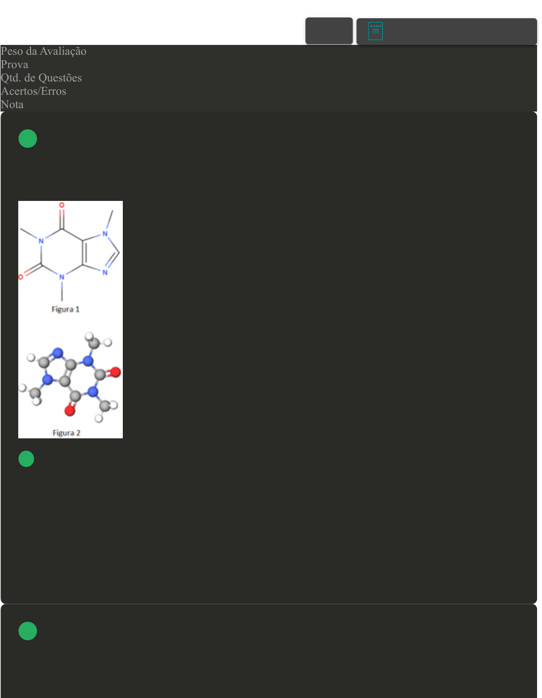 3/4/24, 8:49 PM Avaliação I - Individual about:blank 1/5 Prova Impressa GABARITO | Avaliação I - Individual (Cod.:954267) Peso da Avaliação 2,00 Prova 76079371 Qtd. de Questões 10 Acertos/Erros 9/1 Nota 9,00 A cafeína se apresenta na forma de um pó branco, sem cheiro, apresentando sabor amargo e extremamente solúvel em água quente. É encontrada em certas plantas, como o café, o guaraná e a erva- mate, servindo para o consumo de bebidas, na forma de infusão, como estimulante. A figura a seguir mostra algumas formas de representação da molécula de cafeína: Considerando a cafeína e essas representações, assinale a alternativa CORRETA: A A representação condensada (Figura 1) deixa implícita a presença dos átomos de carbono e de hidrogênio. B A representação por bolas e varetas (Figura 2) é útil para se ter uma ideia da estrutura molecular no plano do papel. C A cafeína é formada por duas cadeias carbônicas fechadas e heterogêneas, possuindo apenas ligações saturadas entre átomos de carbono. D A partir das representações da molécula de cafeína é possível determinar que sua fórmula molecularé C9H12N3O1. Um composto orgânico de cadeia longa pode apresentar diversos átomos de carbono ligados a outros átomos de carbono. Uma forma de identificá-los é através da classificação: primário, secundário, terciário e quaternário. Nesse sentido, analise o composto orgânico a seguir: VOLTAR A+ Alterar modo de visualização 1 2 3/4/24, 8:49 PM Avaliação I - Individual about:blank 2/5 Com base nesse composto orgânico, assinale a alternativa CORRETA que corresponde ao número de carbono(s) quaternário(s): FONTE: https://bit.ly/3Buu8wZ. Acesso em: 15 jul. 2022. A Dois átomos de carbono quaternário. B Quatro átomos de carbono quaternário. C Um átomo de carbono quaternário. D Sete átomos de carbono quaternário. Os alcenos, diferentemente dos alcanos, são obtidos sinteticamente através do craqueamento do petróleo, no qual se obtém o eteno, ou etileno, o composto mais simples da família dos alcenos. Do ponto de vista econômico, o etileno é um dos mais importantes compostos químicos já fabricados pela indústria petroquímica, pois ele dá origem ao polímero mais utilizado no mundo, o polietileno. Sobre os hidrocarbonetos, avalie as asserções a seguir e a relação proposta entre elas: I. O 3-metil-1-buteno é um hidrocarboneto denominado alceno. PORQUE II. Os alcenos são hidrocarbonetos de cadeia aberta, que possuem um átomo de carbono com hibridização Sp2. Assinale a alternativa CORRETA: A A asserção I é uma proposição verdadeira, e a II é uma proposição falsa. B As asserções I e II são proposições verdadeiras, mas a II não é uma justificativa da I. C As asserções I e II são proposições verdadeiras, e a II é uma justificativa da I. D A asserção I é uma proposição falsa, e a II é uma proposição verdadeira. Os hidrocarbonetos estão presentes no nosso dia a dia e exercem grande importância na economia global, pois são os componentes principais do petróleo e de todos os seus subprodutos, como os combustíveis automotivos, o gás de cozinha, as velas, e até mesmo os plásticos. Sobre os hidrocarbonetos, avalie as asserções a seguir e a relação proposta entre elas: I. O octano é um hidrocarboneto denominado alcano. PORQUE II. Os alcanos são hidrocarbonetos de cadeia aberta, formados exclusivamente por átomos de carbono com hibridização Sp3 e, portanto, saturados. Assinale a alternativa CORRETA: 3 4 3/4/24, 8:49 PM Avaliação I - Individual about:blank 3/5 A A asserção I é uma proposição verdadeira, e a II é uma proposição falsa. B A asserção I é uma proposição falsa, e a II é uma proposição verdadeira. C As asserções I e II são proposições verdadeiras, mas a II não é uma justificativa da I. D As asserções I e II são proposições verdadeiras, e a II é uma justificativa da I. Na área da química, bem como na química orgânica, se procura compreender como as moléculas são formadas e como é a estrutura desses compostos. Sendo assim, uma das formas de se estudar a estrutura dos compostos orgânicos é por meio da classificação da cadeia de carbônica do composto em análise. Observe a figura a seguir que mostra a estrutura do 3,3-dimetil-penteno: Com base na figura exposta, classifique V para as sentenças verdadeiras e F para as falsas: ( ) Os átomos de carbono 2 e 4 são terciários, pois estão ligados a quatro átomos. ( ) Os átomos de carbonos 1 e 5 são primários, pois estão ligados a apenas um outro átomo de carbono. ( ) O carbono 3 é quaternário, pois está ligado a quatro outros átomos de carbono. ( ) Apenas o átomo de carbono 2 é secundário, pois só ele está ligado a outros dois átomos de carbono. Assinale a alternativa que apresenta a sequência CORRETA: A V - F - F - V. B V - F - V - F. C F - V - V - F. D F - V - F - V. Os hidrocarbonetos aromáticos constituem uma família extremamente numerosa de compostos orgânicos. Eles apresentam em sua molécula uma estrutura cíclica, formada por seis átomos de carbono unidos entre si, através de ligações duplas alternadas com ligações simples, popularmente conhecido como anel aromático. Nesse contexto, observe o hidrocarboneto aromático apresentado: Sobre esse hidrocarboneto, classifique V para as sentenças verdadeiras e F para as falsas: 5 6 3/4/24, 8:49 PM Avaliação I - Individual about:blank 4/5 ( ) A cadeia principal é o anel aromático contendo seis carbonos. ( ) O nome sistemático dessa molécula é: metilbenzeno. ( ) É classificado como mononuclear com ramificação saturada. ( ) O grupo CH3 é uma ramificação.Assinale a alternativa que apresenta a sequência CORRETA: A F - V - F - F. B V - V - V - V. C F - F - F - V. D V - V - F - V. [Laboratório Virtual – Saponificação de Lipídeos] Durante a realização da prática, você realiza vários procedimentos, como: se