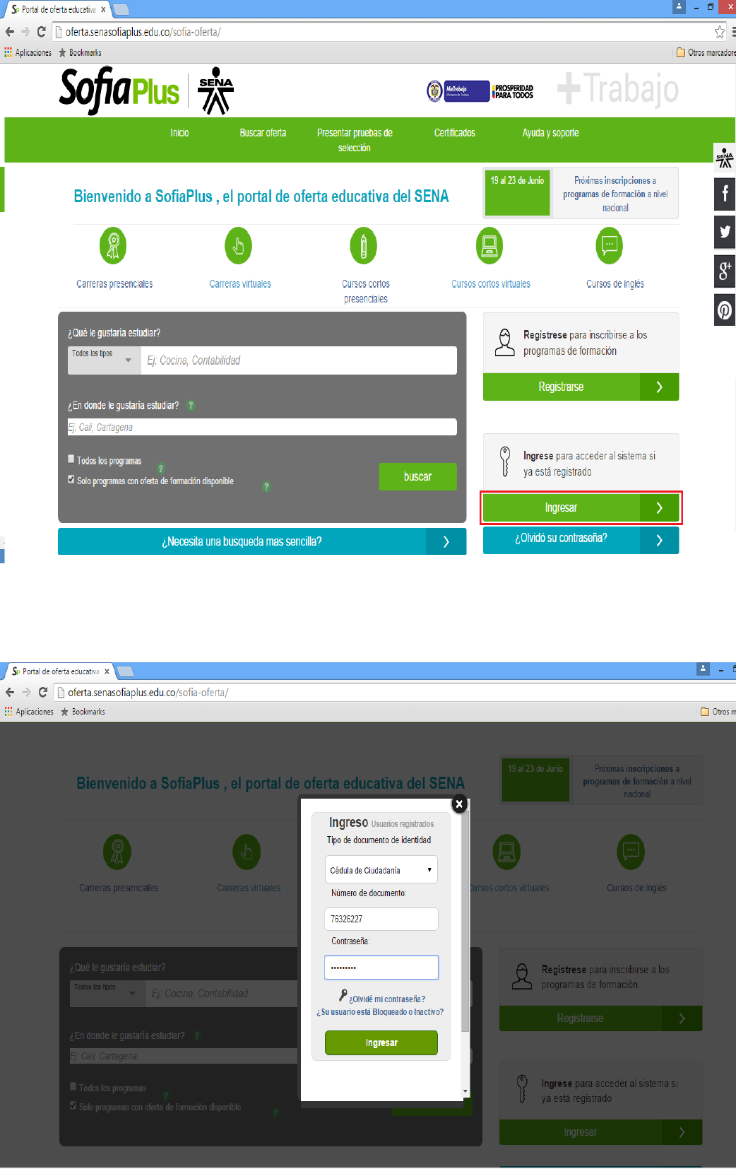 COMO CARGAR LOS ARCHIVOS DE REQUISITO DE MATRICULA 1. Ingrese a la página: http:// senasofiaplus.edu.co 2. De clic en el botón Ingresar. 3. Seleccione el tipo de documento de identidad; digite el número correspondiente; digite la contraseña de acceso y por último de clic en el botón Ingresar. 1 2 3 1. Con el Rol Aspirante 2. Clic en el paquete “MATRÍCULA” 3. Clic en la opción “TITULADA VIRTUAL”. 4. Clic en la opción “Cargar Archivos de Requisitos de Matrícula”. Muy importante: Antes de seleccionar los archivos que debe cargar, verifique que TODOS se encuentren en formato .PDF y su tamaño sea máximo de 100KB En caso de que requiera convertir los archivos de otro formato a .PDF, puede utilizar alguna de las siguientes opciones en línea (de forma gratuita) o elegir otra de su preferencia: NOMBRE DEL PROGRAMA CARACTERÍSTICAS SmallPDF http://smallpdf.com/es/word-a-pdf Gratuito y en español Completamente en línea (no requiere descargar nada) Se elige el archivo a convertir y luego se descarga convertido a formato .PDF Fácil e intuitivo ONLINE – CONVERT http://documento.online- convert.com/es/convertir-a-pdf Gratuito y en español Completamente en línea (no requiere descargar nada) Se elige el archivo a convertir y luego se descarga convertido a formato .PDF Fácil e intuitivo NITRO https://www.wordtopdf.com/es/ Gratuito y en español Se puede descargar una versión de prueba por 14 días. Una vez convertidos todos los archivos a formato .PDF y verificado que su tamaño sea máximo de 100 KB, proceda a cargar cada uno, siguiendo los pasos que se describen a continuación. 5. En la opción: Documento de identidad de clic en el botón “Seleccionar archivo”. 1 2 3 4 6. Seleccione el archivo a adjuntar y de clic en el botón Abrir. 7. Se realiza el mismo proceso para adjuntar cada uno de los documentos que se solicitan. 8. Descargue el Acta de compromiso del Aprendiz SENA dando clic en el icono que se indica: 5 6 7 9. Abra el archivo y léalo. 10. Después de leer el Compromiso de Aprendiz SENA marque el recuadro “He leído y acepto el Compromiso del Aprendiz SENA”. 11. Y por último dé clic en el botón “Cargar Archivos”, con lo cual serán cargados al sistema. Una vez finalizada la carga de archivos se mostrará el aviso: “Se han almacenado los archivos adjuntos exitosamente” Para verificar los documentos que acaba de cargar, podrá observar una lista de ellos. De clic en el ícono ubicado al frente de cada nombre de archivo para abrirlo. 8 10