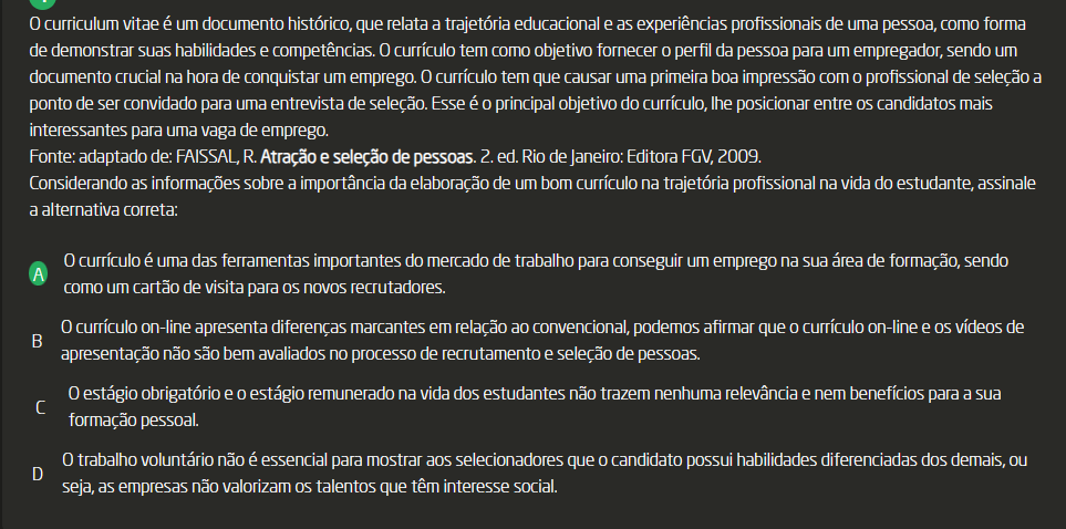 curriculum vitae é um documento histórico, que relata a trajetória educacional e as experiências profissionais de uma pessoa, como forma de demonstrar suas habilidades e competências. currículo tem como objetivo fornecer perfil da pessoa para um empregador, sendo um documento crucial na hora de conquistar um emprego. currículo tem que causar uma primeira boa impressão com profissional de seleção a ponto de ser convidado para uma entrevista de seleção. Esse é principal objetivo do currículo, lhe posicionar entre os candidatos mais interessantes para uma vaga de emprego. Fonte: adaptado FAISSAL, R. Atração e seleção de pessoas. 2. ed. Rio de Janeiro: Editora FGV, 2009. Considerando as informações sobre a importância da elaboração de um bom currículo na trajetória profissional na vida do estudante, assinale a alternativa correta: A - currículo é uma das ferramentas importantes do mercado de trabalho para conseguir um emprego na sua área de formação, sendo como um cartão de visita para os novos recrutadores. B - currículo on-line apresenta diferenças marcantes em relação ao convencional, podemos afirmar que currículo on-line e os vídeos de B apresentação não são bem avaliados no processo de recrutamento e seleção de pessoas. C - o estágio obrigatório e estágio remunerado na vida dos estudantes não trazem nenhuma relevância e nem benefícios para a sua formação pessoal. D - trabalho voluntário não é essencial para mostrar aos selecionadores que candidato possui habilidades diferenciadas dos demais, ou seja, as empresas não valorizam os talentos que têm interesse social.
