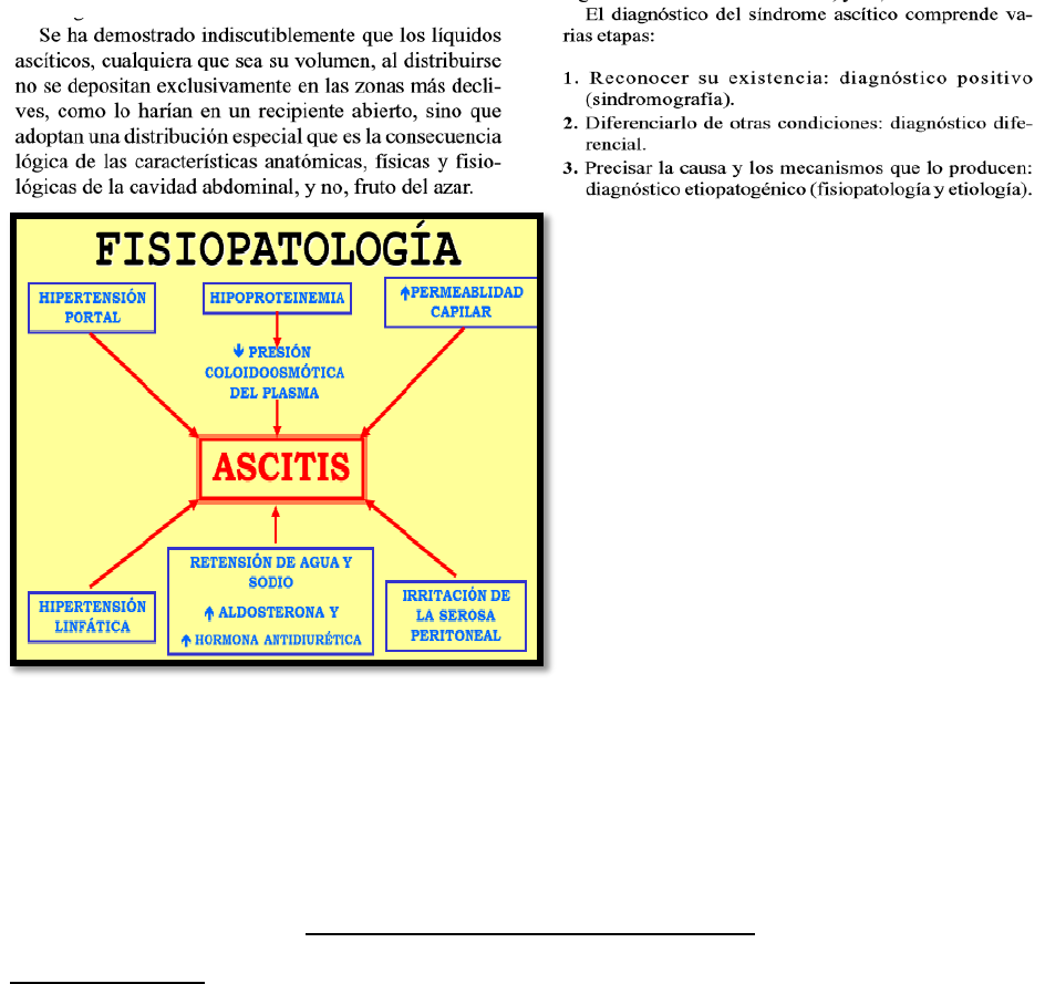 22- SÍNDROME ASCÍTICO RANDY MEJÍAS GONZÁLEZ Página 1 de 6 CONCEPTO Colección líquida exagerada situada dentro de la cavidad peritoneal y en íntimo contacto con sus dos hojas: Parietal y Visceral. La naturaleza del líquido varía con los factores etiopatogénicos que hayan intervenido en su producción. Normal: 100-200 ml de líquido en el peritoneo. Algunos autores plantean como ascitis cualquier líquido que se acumule en el abdomen, ya sea sangre (hemoperitoneo), orina, etc, mientras otros solo consideran como tal los derrames líquidos (exudados y trasudados) 1. Hipertensión portal. Normalmente la presión venosa portal es de 12-13 cm de agua, cuando ella, sobrepasa la cifra de 40 cm, la estasis venosa en el territorio abdominal se opone a la reabsorción normal del líquido intersticial. Este evento por sí solo no es suficiente para producir la ascitis, pero como generalmente coexiste con otros, desempeña su papel en la determinación del síndrome. 2. Hipoproteinemia. Cuando va acompañada de disminución marcada de la serina, produce el descenso de la presión coloidosmótica del plasma. 3. Aumento de la permeabilidad capilar. La hipertensión portal, la hipoproteinemia y el aumento de la permeabilidad capilar actúan sinérgicamente y ejercen su influencia exactamente a nivel de la barrera capilar que separa los dos compartimentos del sector extracelular. 4. Hipertensión linfática. Se debe al flujo linfático aumentado por las alteraciones de la circulación portal y las lesiones hepáticas; también contribuye la obstrucción linfática por fibrina. 5. Retención de agua y sodio (aldosterona y hormona antidiurética). Constituye uno de los mecanismos más significativos en la producción de ascitis. 6. Irritación de la serosa peritoneal. Este es el mecanismo más importante en los casos de infecciones agudas o crónicas (tuberculosis) del peritoneo, es decir, en la peritonitis. Las siembras metastásicas en la serosa peritoneal (carcinosis peritoneal) también ocasionan irritación de estas estructuras y dan lugar a ascitis que con frecuencia son sanguinolentas. SEMIOGRAFÍA o DIAGNÓSTICO POSITIVO CUADRO CLÍNICO Par sospecha la presencia de ascitis el paciente nos debe relatar que ha notado distensión o aumento de volumen en los días o semanas previas a la consulta 1.- Comienzo insidioso generalmente. • Dolores Difusos en el Vientre. • Pesantez Abdominal. • Sensación de Distensión. • Trastornos Funcionales del tubo digestivo. Pero cuando es de instalación brusca 2.- Comienzo Brusco. • Rápido Aumento del Abdomen. • Grandes Trastornos Funcionales cardiorrespiratorios. En el periodo de estado de las ascitis, tenemos en cuenta los: ҉ Síntomas funcionales ҉ Signos físicos 22- SÍNDROME ASCÍTICO RANDY MEJÍAS GONZÁLEZ Página 2 de 6 ҉ Otros síntomas Síntomas Funcionales: Estos pueden ser manifiestos o larvados • Sensación de Peso del vientre o Dolores verdaderos. • Trastornos Cardiorrespiratorios: Disnea de esfuerzo y de decúbito, Taquicardia. • Síntomas Digestivos: Digestiones Difíciles, Vómitos, Naúseas, Meteorismos, … • Síntomas vesicales: disuria, micciones frecuentes, … Otros síntomas (varían en dependencia del síndrome ascítico) Anemia, Trastornos Circulatorios, Trastornos Renales, Ictericia Fiebre Lesiones pulmonares Opsiuria (eliminación de la orina varias horas después de las comidas) Edema del Escroto o de los Grandes Labios, Hidrocele, Pérdida de Peso. Signos físicos De acuerdo a este aspecto las ascitis se dividen en dos grupos: las ascitis libres (que ocupan universalmente y sin obstáculo el peritoneo entre sus dos hojas) y las ascitis enquistadas o tabicadas (formación de adherencias hace que el líquido se acumule exclusivamente en determinados sectores del abdomen) Las ascitis libres, de acuerdo con la cantidad de líquido, se dividen en: − Ascitis grado 1 (o de pequeño derrame). Cuando el volumen es escaso, menos de 3 L. En ocasiones el diagnóstico clínico es evidente, aunque no es infrecuente tener que realizar una ecografía para su comprobación. − Ascitis grado 2 (o de mediano derrame). Resulta cuando el volumen de líquido oscila entre 3-6 L, lo cual hace que el diagnóstico sea evidente a través del examen físico del abdomen. − Ascitis grado 3 (o de gran derrame). Cuando el volumen de líquido se encuentra entre los 6 y más de 15 L. Se necesitan por lo menos 1 500 mL de líquido para que aparezcan los signos físicos. Abombamiento del Abdomen. Signo del Témpano. Signo de la Moneda de Pitres. Maniobra de Tarral Positiva. Matidez de Declive o en Parches o Tablero de Ajedrez o Damas. Signo de Cruveilhier-Baunngarten: Soplo en Región Umbilical con Thrill. Hernias inguinales o crurales, Inspección. Abdomen aumentado en forma de obús o huevo de avestruz o por el contrario el clásico vientre de batracio. En las ascitis abundantes hay posibilidad de herniación umbilical, exageración de la lordosis lumbar ensanchamiento de la base del tórax la piel del abdomen es lisa, brillante y tensa, a veces con circulación colateral bien manifiesta: – tipo portal, – supraumbilical o periumbilical (cabeza de medusa). Palpación. ֎ La tensión parietal varía con la cantidad de líquido y con el tono muscular, ֎ de esto también depende la palpación o no de las vísceras abdominales. ֎ el vientre generalmente es renitente. ֎ Casi nunca hay dolor, salvo si existe un proceso inflamatorio. ֎ Puede haber hidrocele si persiste el conducto peritoneovaginal, o hinchazón del labio mayor, si persiste el canal de Nück. Se detecta edema del escroto o de los grandes labios, solo después de la paracentesis (infiltración subcutánea del líquido). 22- SÍNDROME ASCÍTICO RANDY MEJÍAS GONZÁLEZ Página 3 de 6 Percusión. En el caso de derrame libre. Matidez en los puntos declives del abdomen que varía con los cambios de posición. En decúbito dorsal, matidez en flancos y por encima del pubis