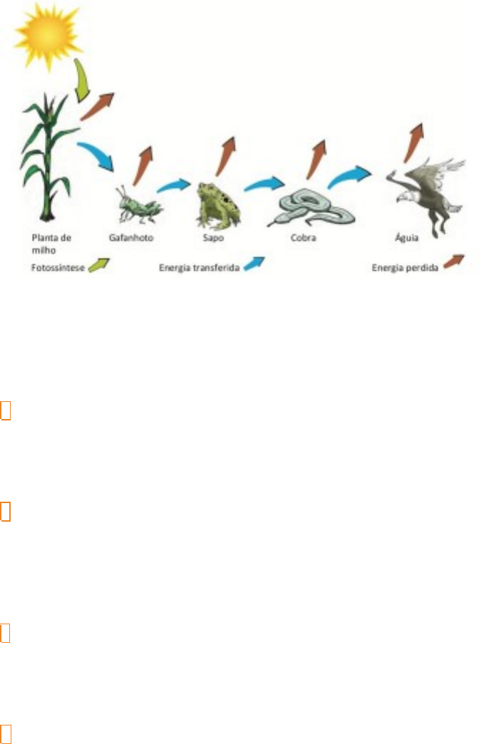 figura abaixo caracteriza uma cadeia alimentar e o fluxo de energia que atravessa seus níveis tróficos. Considerando o que mostra a figura e fundamentado nos princípios ecológicos pertinentes às cadeias alimentares, assinale a alternativa correta. Alternativas A Uma cadeia alimentar pode ser formada por muitos elos de consumidores, dependendo da variedade de espécies que habitam o mesmo ecossistema. Por isso, é comum haver cadeias alimentares com mais de cinco níveis tróficos numa mesma cadeia, principalmente em áreas de grande biodiversidade. B Numa cadeia alimentar, quando um organismo se alimenta do outro há a transferência exclusiva de energia. Essa transferência de energia começa a partir do sol. A energia solar, captada e transformada pelos produtores, é devolvida ao meio na forma de energia térmica pelos próprios produtores, consumidores e decompositores. C Nas cadeias alimentares, depois da ingestão dos alimentos, o corpo dos seres vivos armazena, definitivamente, parte do que foi ingerido, sob a forma de amido, gorduras e proteínas, e libera no ecossistema tudo o que não foi aproveitado, para que possa ser reutilizado por outros seres vivos. D Numa cadeia alimentar o fluxo de energia é unidirecional. Além disso, a cada transferência de energia através de um nível trófico para outro, há sempre perda de energia na forma de calor. Por isso, a quantidade de energia diminui no decorrer das relações tróficas. Assim, quanto mais próximo do produtor, maior a quantidade de energia disponível