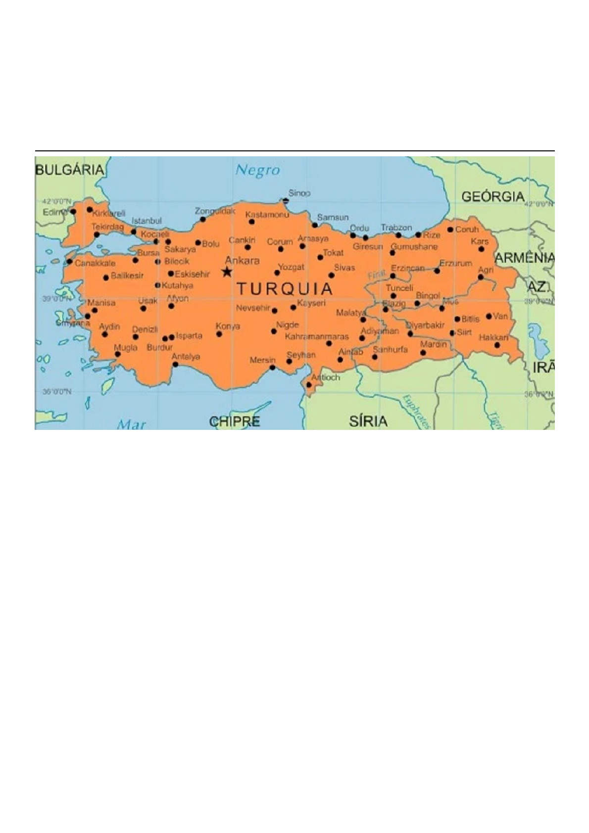 1/4 Turquia 1. A Turquia, nome oficial República da Turquia, é um país transcontinental. Isso porque se localiza em dois continentes: a maior parte na Ásia, e a menor na Europa. É o terceiro país mais populoso da Europa, ficando atrás da Rússia e da Alemanha. Localização O país é banhado pelos seguintes mares: Mar Negro, Mar Mediterrâneo, Mar Egeu e Mar de Mármara. Faz fronteira com oito países: Armênia, Azerbaidjão, Bulgária, Geórgia, Grécia, Irã, Iraque e Síria. A região é conhecida como Anatólia (ou Península Anatólica) e sempre foi uma área de intensas manifestações culturais, haja que a região serve de "ponte" da Europa para a Ásia. Essa área também é conhecida pelas atividades sísmicas devido ao choque de placas tectônicas. 2/4 Mapa da Turquia Dados Gerais Capital: Ancara Extensão territorial: 783.560 km² Habitantes: 84,780 milhões de habitantes (dados de 2020) Clima: Mediterrânico Idioma: Turco Religião: Islamismo Moeda: Lira turca Sistema de Governo: República parlamentarista Capital: Ancara ou Istambul? Ancara é a capital da Turquia. Muitas pessoas pensam que Istambul seja a capital da Turquia. Isso acontece pelo fato de Istambul já ter sido a capital do Império Romano do Oriente e do Império Otomano. Mas, desde 1923, após a queda do Império Otomano, a capital da Turquia é Ancara. Istambul é a principal cidade do país e a única cidade bi continental no mundo. Parte dela fica na Ásia e a outra parte, na Europa. É uma megacidade, tendo em conta que abriga mais de 10 milhões de habitantes. Bandeira 3/4 A bandeira da Turquia é vermelha. Além do vermelho, a cor branca está presente nos símbolos que a compõem: a lua crescente com a estrela, o principal símbolo do Islamismo. A lua crescente simboliza a renovação, enquanto a estrela representa os 5 pilares do islamismo: fé, oração, jejum, caridade e peregrinação. Não se conhece a sua verdadeira origem. Possivelmente, ela tenha surgido no período do Império Otomano, dada a semelhança entre as bandeiras. Economia O PIB per capita corresponde a 9.661 US$. Os principais setores da economia turca são a agricultura, a indústria e o turismo. A Turquia produz muitos frutos secos e grãos, com maior evidência no cultivo do trigo. Na indústria tem destaque o setor automobilístico, visto que o país é um dos maiores produtores de automóveis do mundo. A indústria têxtil também é bastante forte. Cerca de 39 milhões de turistas visitam anualmente o país. Cultura Os turcos têm por hábito tomar chá. Em média, bebem cerca de dez xícaras diariamente. Outro costume é deixar os sapatos nas entradas das casas. Ao visitar alguém, os anfitriões disponibilizam chinelos à entrada. Supersticiosos, é comum a utilização do olho turco, um amuleto. Esse objeto pode ser pendurado nas casas ou colocado nas roupas dos bebês. Na Turquia, o beijo entre homens é um cumprimento comum. Da mesma forma, é normal ver amigos andando de mãos dadas. Noventa e nove por cento dos turcos seguem o Islamismo. Essa religião, entretanto, não é a religião oficial do país, porque a Turquia segue o princípio do Secularismo. No Secularismo, há a liberdade religiosa e o sistema político não é influenciado pela religião. 4/4 Por questões religiosas, as vestes das mulheres cobrem todo o seu corpo. As roupas são escuras. Os homens religiosos, por sua vez, usam um turbante. Para as cerimônias de casamento, os noivos vestem-se tal como no Ocidente: a noiva, de vestido branco, o noivo, de terno. A grande diferença são os presentes que são oferecidos. Na Turquia, os noivos ganham joias e dinheiro. As joias são colocadas na noiva, que permanece com elas durante a festa.