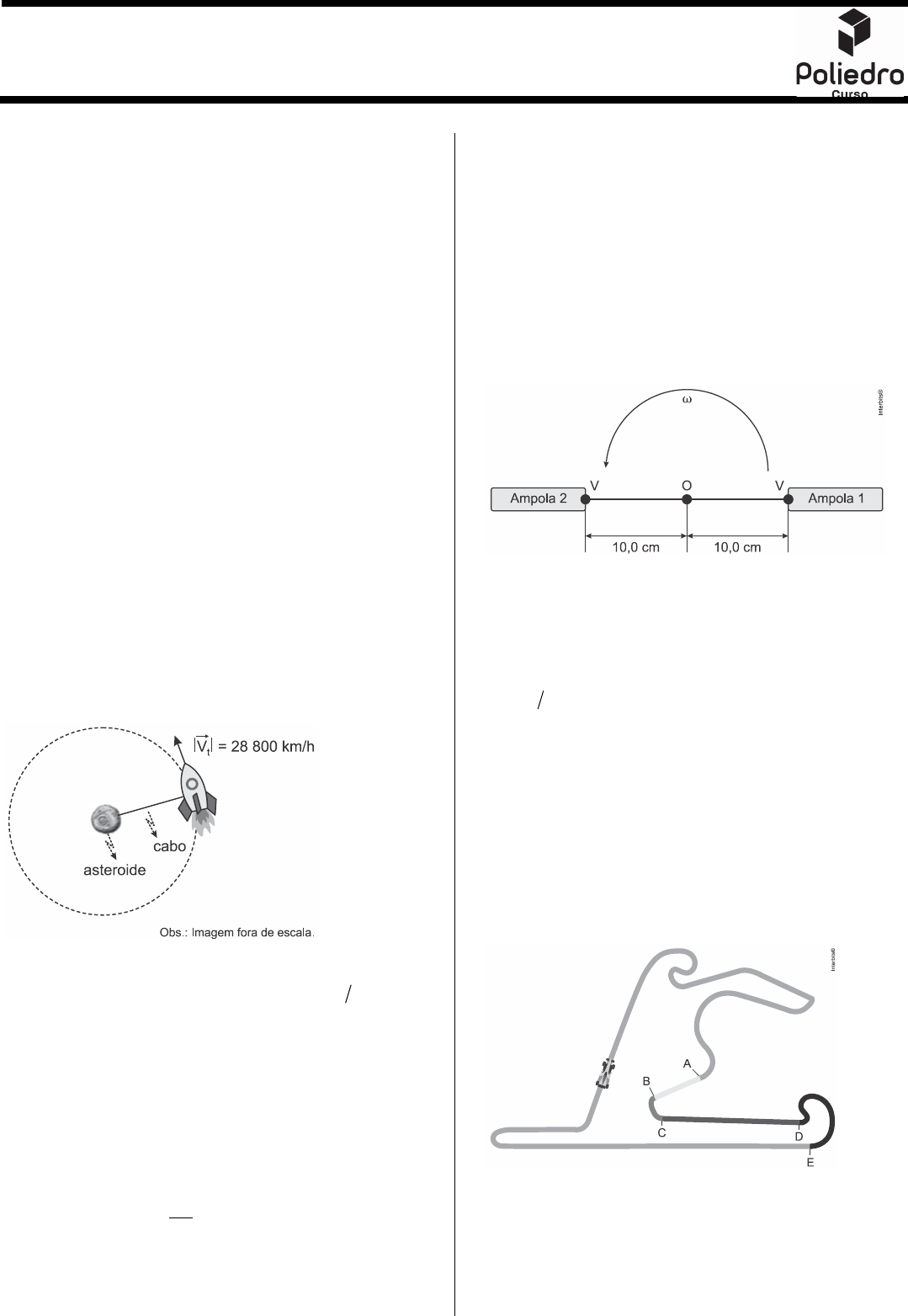 Extensivo ENEM 2021 – Lista 13 de Física 1 Edu Leite 1 1. (Uepg 2021) A respeito dos conceitos relacionados à Mecânica, assinale o que for correto. 01) Quando em um problema de cinemática for obtido para a aceleração um valor negativo, isto será uma indicação de que o movimento é retardado. 02) Um balde que contém água, do qual despreza-se a massa, é colocado a girar num plano vertical. A velocidade mínima que impede que a água caia do balde não depende da massa de água contida nele. 04) Movimento e repouso são conceitos relativos, pois dependem do referencial adotado. Porém, a trajetória de um móvel é um conceito absoluto, visto que será sempre a mesma, qualquer que seja o referencial adotado. 08) A distância percorrida por um móvel e o deslocamento efetuado por ele são grandezas distintas, sendo a primeira uma grandeza escalar e a segunda, vetorial. 2. (Fatec 2020) O tether consiste em dois objetos fixos nas duas extremidades de um cabo. A pesquisadora brasileira Alessandra F. S. Ferreira, da Unesp de Guaratinguetá (SP), foi agraciada com o prêmio Mario Grossi no evento internacional Tether in Space 2019 (em Madrid). Em seu estudo, ela propôs a aplicação de um cabo fino e rígido de de comprimento com uma ponta ancorada na superfície de um corpo celeste, como um asteroide por exemplo. A outra ponta estará ancorada em um veículo espacial, conforme apresentado na figura. Assim, a técnica poderá ser utilizada para economizar energia e aumentar o impulso em viagens espaciais mais longas. Uma espaçonave de toneladas, navegando a uma velocidade tangencial aproximada de acopla- se ao cabo citado de de extensão ancorado em um asteroide (considerado aqui como um ponto material em repouso). Assumindo que a massa do cabo seja desprezível em relação ao sistema, podemos afirmar, corretamente, que a força centrípeta aplicada na extremidade do cabo ligada ao veículo espacial, em newtons, é Lembre-se de que a) b) c) d) e) 3. (Fmp 2020) A centrifugação é o principal método para separação do plasma do sangue. O esquema simplificado de uma centrífuga de laboratório é mostrado na Figura abaixo, onde duas ampolas de massas iguais giram com velocidade angular constante em torno de um ponto presas pelos vínculos Na fábrica desse equipamento, é feito um teste de funcionamento, no qual os vínculos são submetidos a uma força radial de Se a massa das ampolas é de a velocidade angular, em da centrífuga neste teste é, aproximadamente, a) b) c) d) e) 4. (Uerj 2019) Um carro de automobilismo se desloca com velocidade de módulo constante por uma pista de corrida plana. A figura abaixo representa a pista vista de cima, destacando quatro trechos: e A força resultante que atua sobre o carro é maior que zero nos seguintes trechos: a) e b) e c) e d) e 100 km 100 28,8mil km h, 100 km 2 c Va R = 76,4 10´ 56,4 10´ 36,4 10´ 48,3 10´ 68,3 10´ ω O, V. V 300N. 12,0 g, rad s, 200 360 500 250 400 AB, BC, CD DE. AB BC BC DE DE CD CD AB 2 5. (Mackenzie 2019) Força centrípeta é a força resultante que puxa um corpo na direção e sentido do centro da trajetória de um movimento curvilíneo. Um exemplo de força centrípeta é a força gravitacional no movimento do planeta Terra ao redor do Sol. Nesse caso, é a força gravitacional entre o planeta e a estrela que faz com que a TERRA não escape da trajetória elíptica ao redor do Sol e deixe de orbitá-lo. Analisando o movimento curvilíneo de um carro em uma pista horizontal, a força que tem o papel de força centrípeta é a a) força peso do carro. b) força de atrito entre os pneus e a pista. c) força normal dos pneus na pista. d) força de tração do motor. e) força de gravitacional entre o carro e a pista. 6. (Ufjf-pism 1 2019) Um viaduto em forma de arco (raio é construído sobre uma ferrovia. Muitas pessoas sentadas dentro de automóveis e ônibus, e também sobre assentos de motos, comentam que parecem ficar mais leves no ponto mais alto do viaduto, principalmente quando passam nesse ponto em grandes velocidades. Um motociclista, ao atingir o ponto mais alto do viaduto, como mostra a Figura, percebeu que estava a ponto de perder contato entre o seu corpo e o assento da moto. Nesse momento, qual a melhor atitude a ser tomada por ele? a) Ele deve manter a velocidade da moto constante para que seu peso tenha intensidade igual à força de contato (força normal) entre ele e o assento. b) Ele deve aumentar a velocidade da moto para que seu peso tenha intensidade igual à força de contato (força normal) entre ele e o assento. c) Ele deve aumentar a velocidade da moto para ficar mais preso ao assento. d) Ele deve diminuir a velocidade da moto para que seu peso tenha intensidade igual à força de contato (força normal) entre ele e o assento. e) Ele deve diminuir a velocidade da moto de modo a aumentar a intensidade da força de contato (força normal) entre ele e o assento. 7. (Eear 2019) Uma criança gira no plano horizontal, uma pedra com massa igual a presa em uma corda, produzindo um Movimento Circular Uniforme. A pedra descreve uma trajetória circular, de raio igual a sob a ação de uma força resultante centrípeta de módulo igual a Se a corda se romper, qual será a velocidade, em com que a pedra se afastará da criança? Obs.: desprezar a resistência do ar e admitir que a pedra se afastará da criança com uma velocidade constante. a) b) c) d) 8. (Ufpr 2019) Um motociclista descreve uma trajetória circular de raio com uma velocidade de módulo medida por um observador inercial. Considerando que a massa combinada do motociclista e da motocicleta vale assinale a alternativa que expressa corretamente o módulo da força centrípeta necessária para a realização da trajetória circular. a) b) c) d) e) 9. (Famerp 2018) Em um autódromo, cuja pista tem de comprimento, há uma curva de raio em superfície plana inclinada, na qual a borda externa é mais elevada que a interna, como mostra 