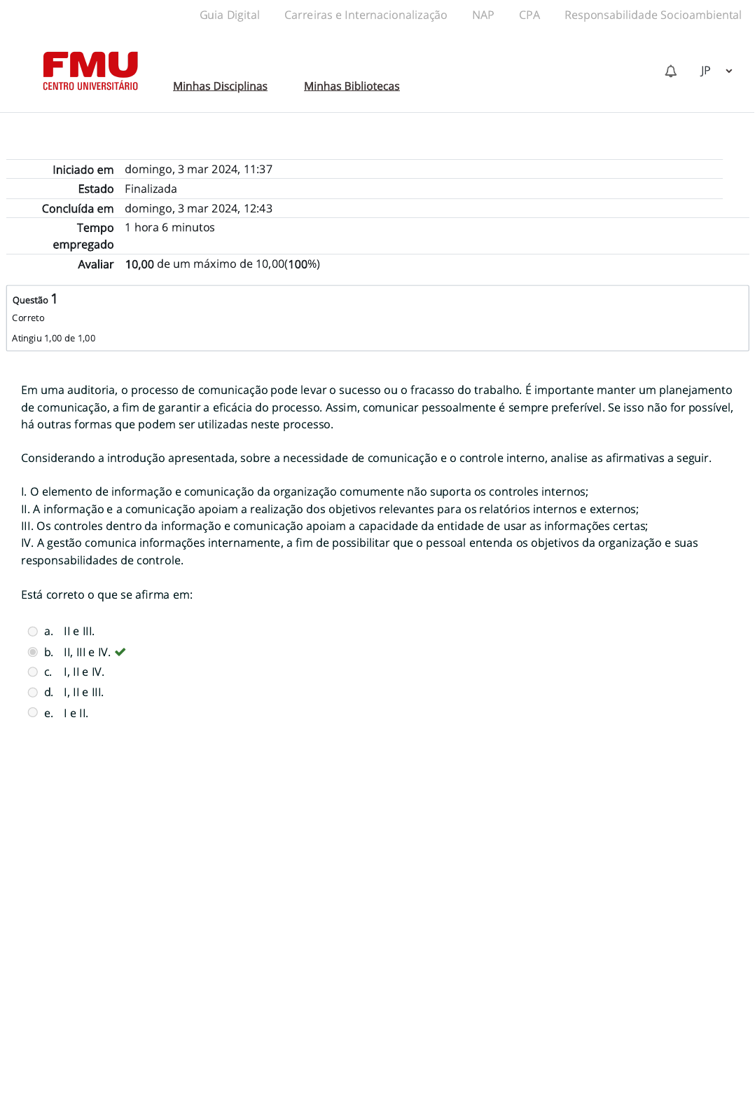Iniciado em domingo, 3 mar 2024, 11:37 Estado Finalizada Concluída em domingo, 3 mar 2024, 12:43 Tempo empregado 1 hora 6 minutos Avaliar 10,00 de um máximo de 10,00(100%) Questão 1 Correto Atingiu 1,00 de 1,00 Em uma auditoria, o processo de comunicação pode levar o sucesso ou o fracasso do trabalho. É importante manter um planejamento de comunicação, a �m de garantir a e�cácia do processo. Assim, comunicar pessoalmente é sempre preferível. Se isso não for possível, há outras formas que podem ser utilizadas neste processo. Considerando a introdução apresentada, sobre a necessidade de comunicação e o controle interno, analise as a�rmativas a seguir. I. O elemento de informação e comunicação da organização comumente não suporta os controles internos; II. A informação e a comunicação apoiam a realização dos objetivos relevantes para os relatórios internos e externos; III. Os controles dentro da informação e comunicação apoiam a capacidade da entidade de usar as informações certas; IV. A gestão comunica informações internamente, a �m de possibilitar que o pessoal entenda os objetivos da organização e suas responsabilidades de controle. Está correto o que se a�rma em: a. II e III. b. II, III e IV. c. I, II e IV. d. I, II e III. e. I e II. Guia Digital Carreiras e Internacionalização NAP CPA Responsabilidade Socioambiental Minhas Disciplinas Minhas Bibliotecas JP https://codely-fmu-content.s3.amazonaws.com/Moodle/GuiaDigital/Guia+digital/index.html https://carreiras.fmu.br/ https://codely-fmu-content.s3.amazonaws.com/Moodle/NAP/inicial/nap/fmu/index.html https://codely-fmu-content.s3.amazonaws.com/Moodle/CPA/landing_CPA/index.html https://portal.fmu.br/sustentabilidade https://ambienteacademico.com.br/ https://ambienteacademico.com.br/ https://ambienteacademico.com.br/course/view.php?id=236 Questão 2 Correto Atingiu 1,00 de 1,00 Questão 3 Correto Atingiu 1,00 de 1,00 Leia o excerto a seguir. "O objetivo do auditor é comunicar apropriadamente, aos responsáveis pela governança e à administração, as de�ciências de controle interno que o auditor identi�cou durante a auditoria e que, no seu julgamento pro�ssional, são de importância su�ciente para merecer a atenção deles" (BRASIL, 2009, on-line). BRASIL. Resolução CFC nº 1.210/09. Aprova a NBC TA 265 - Comunicação de De�ciências de Controle Interno. Conselho Federal de Contabilidade, Brasília, DF, 2009. Disponível em: https://www1.cfc.org.br/sisweb/SRE/docs/RES_1210.pdf. Acesso em: 22 jul. 2022. A respeito da NBC TA 265, analise as a�rmativas a seguir e assinale V para a(s) verdadeira(s) e F para a(s) falsa(s). I. ( ) A de�ciência signi�cativa de controle interno deve ser julgada pelo pro�ssional do auditor; II. ( ) A de�ciência ou a combinação de de�ciências de controle interno não deve receber atenção por parte da governança; III. ( ) As de�ciências de controle interno relevantes identi�cadas pela auditoria devem ser comunicadas de forma tempestiva; IV. ( ) As de�ciências de controle dependem da probabilidade de ocorrência e a possível magnitude da distorção. Assinale a alternativa que apresenta a sequência correta. a. V, F, V, V. b. F, V, F, F. c. F, V, V, V. d. V, V, F, V. e. V, V, F, F. Leia o excerto a seguir. O auditor quali�cado prepara a auditoria e reúne toda a documentação necessária para a execução desta. A execução é realizada seguindo o que está estabelecido na agenda acordada com o auditado. Ao �nal da auditoria é realizada uma reunião de encerramento, em que qualquer observação encontrada e possíveis soluções são discutidas. A respeito da execução da auditoria, analise as a�rmativas a seguir e assinale V para a(s) verdadeira(s) e F para a(s) falsa(s). I. ( ) A auditoria possui, como �nalidade, o exame das demonstrações contábeis, mediante fatores internos e externos; II. ( ) Na auditoria, as veri�cações inicializam buscando conhecimento dos procedimentos internos e de sistemas de controles internos empregados pelas organizações; III. ( ) O sistema de coleta das informações e dos controles internos transforma todos os dados que resultam em manutenção da situação patrimonial e �nanceira da entidade; IV. ( ) Após estabelecido o nível de con�ança dos controles internos, a realização da auditoria se dá mediante obtenção de provas e evidências necessárias para a formação da opinião do auditor. Assinale a alternativa que apresenta a sequência correta. a. F, V, F, V. b. V, V, F, F. c. F, F, F, F. d. V, V, V, V. e. V, V, F, V. Guia Digital Carreiras e Internacionalização NAP CPA Responsabilidade Socioambiental Minhas Disciplinas Minhas Bibliotecas JP https://codely-fmu-content.s3.amazonaws.com/Moodle/GuiaDigital/Guia+digital/index.html https://carreiras.fmu.br/ https://codely-fmu-content.s3.amazonaws.com/Moodle/NAP/inicial/nap/fmu/index.html https://codely-fmu-content.s3.amazonaws.com/Moodle/CPA/landing_CPA/index.html https://portal.fmu.br/sustentabilidade https://ambienteacademico.com.br/ https://ambienteacademico.com.br/ https://ambienteacademico.com.br/course/view.php?id=236 Questão 4 Correto Atingiu 1,00 de 1,00 Questão 5 Correto Atingiu 1,00 de 1,00 A opinião do auditor que acompanha as demonstrações contábeis é fundamentada em uma auditoria dos procedimentos e registros empregados para produzi-los. As auditorias internas avaliam os controles internos de uma organização, incluindo seus processos de governança corporativa e contabilidade. Como parte de uma auditoria externa, os auditores testarão os processos contábeis e os controles internos de uma empresa e darão uma opinião quanto à sua e�cácia. A partir do nosso material de estudos sobre controles internos, analise as a�rmativas a seguir. I. As fraudes não encobertas são aquelas decorrentes de controle interno fraco; II. O sistema de controle interno deve possibilitar a detecção