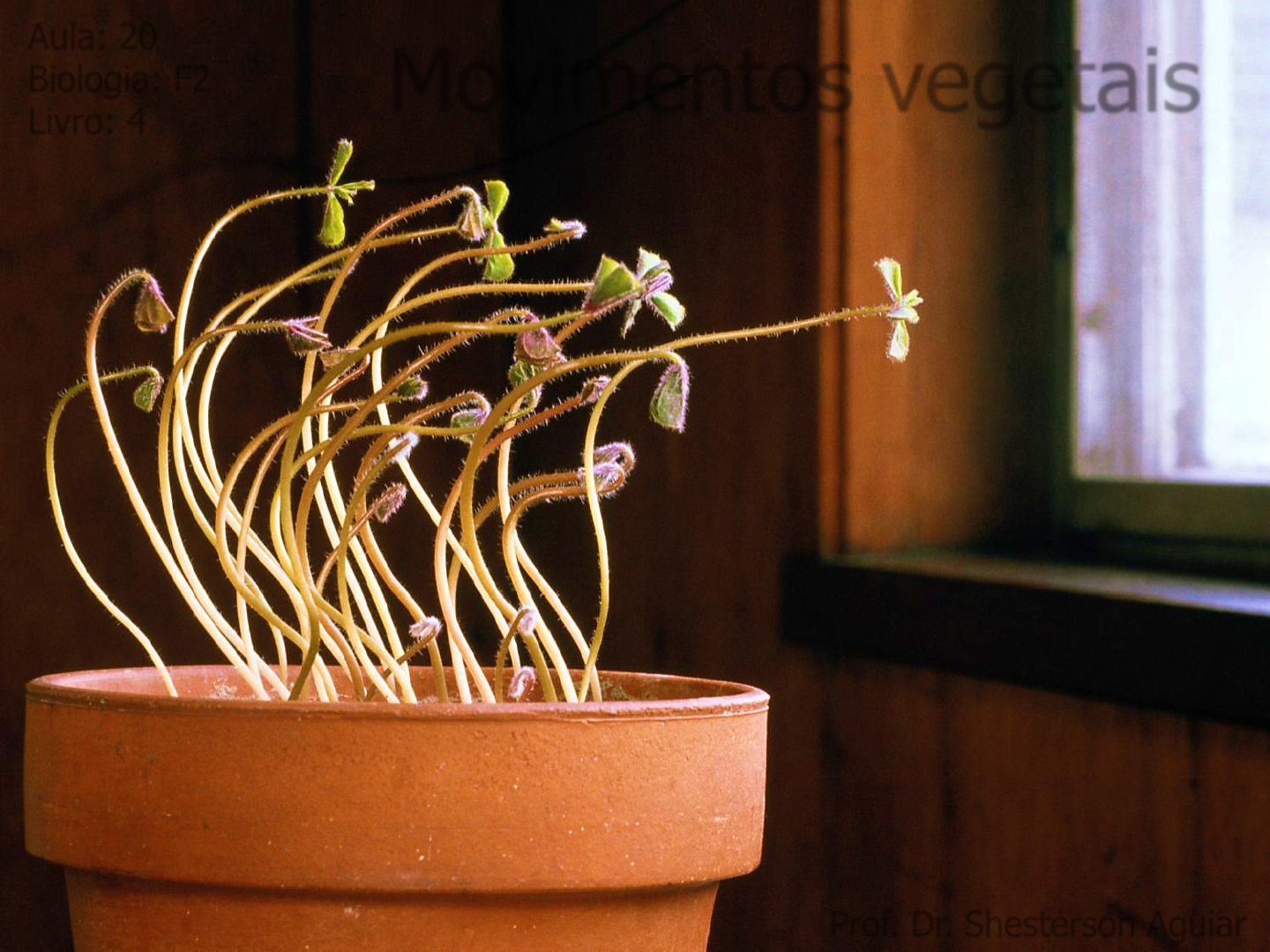 Prof. Dr. Shesterson Aguiar Movimentos vegetais Aula: 20 Biologia: F2 Livro: 4 Lado iluminado Lado não iluminado Fototropismo positivo Fototropismo negativo Auxina Ocorre crescimentoSem crescimento Sem crescimentoOcorre crescimento Planta intacta (grupo controle) Ápice recoberto com cobertura transparente Ápice recoberto com cobertura opaca Base recoberta com cobertura opaca Ápice removido luz Fototropismo positivo Fototropismo positivo Fototropismo positivo Sem crescimento Crescimento vertical Gravitropismo Maior taxa de crescimento Inibição do crescimento Gravitropismo positivoMaior concentração de AIA Menor concentração de AIA Lado superior Lado inferior Lado superior Lado inferior Gravitropismo negativo Auxina Gravitropismo anulado Óvulo Estilete Ovário Estigma Tubo polínico Tubo polínico Quimiotropismo Anterozoides Oosfera Anterídio Arquegônio Quimotactismo (ENEM 2020) Na piscicultura, costumam-se usar larvas de Artemia (crustáceo) para alimentar larvas de peixes. Ovos de Artemia são colocados em garrafas com água salgada e, sob condições ótimas de temperatura, luz e oxigênio, eles eclodem, liberando suas larvas, também conhecidas como náuplios. Para recolher os náuplios, coloca-se uma lâmpada branca fluorescente na boca da garrafa e estes começam a subir em direção ao gargalo. a) geotropismo positivo. b) fototropismo positivo. c) hidrotropismo negativo. d) termotropismo negativo. e) quimiotropismo negativo. Esse comportamento das artêmias é chamado de Foco no Vestibular Leitura: Aula 20 ou Resumo de aula (Frente 2 – Livro 4) Orientações de estudo Para praticar: 1, 5, 6, 7 e 10 Lista de exercícios disponível no HD De olho na BNCC: 1 É assim no ENEM: 1 e 2