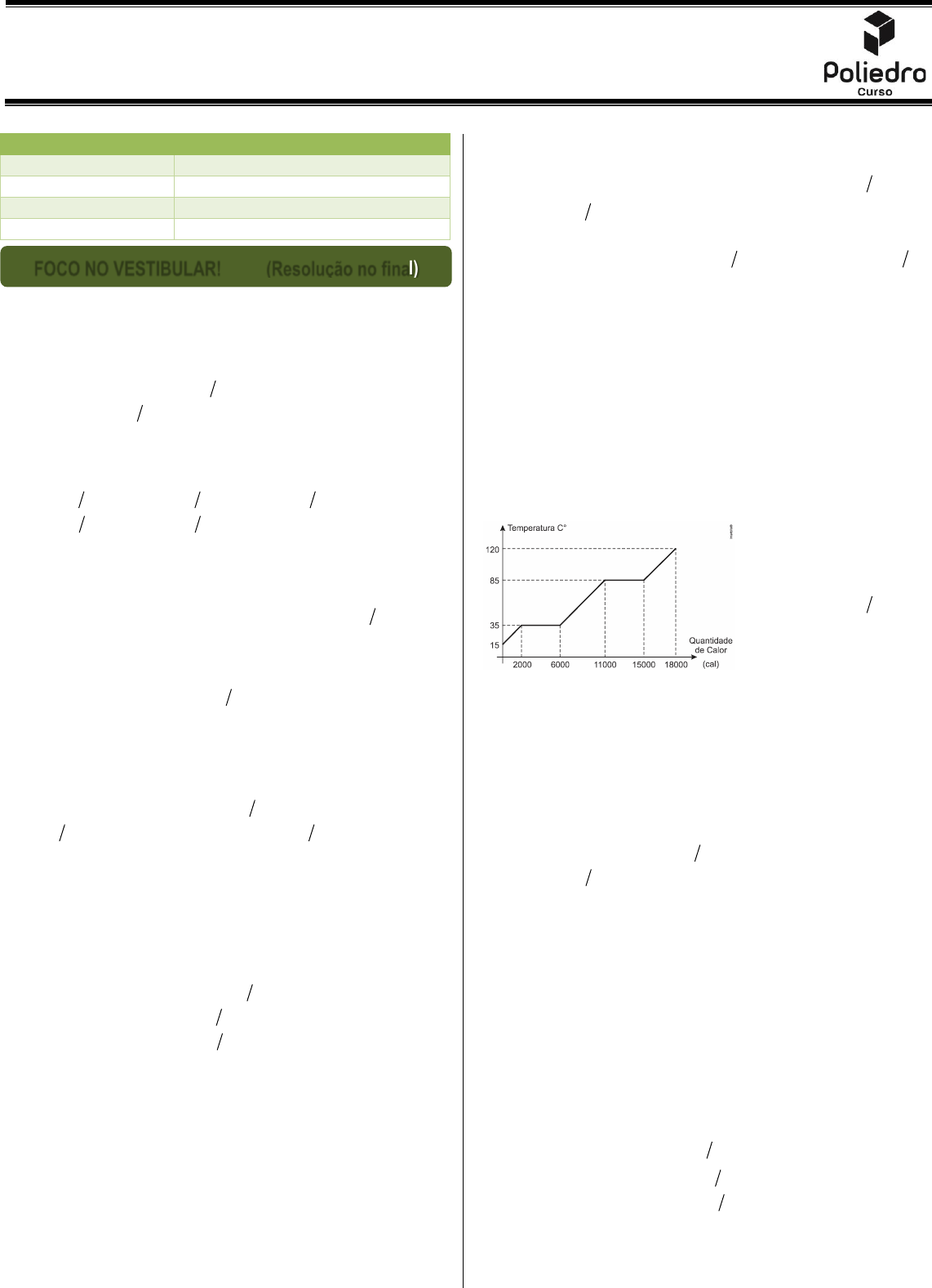 MATERIAL EXTRA – (Mudança de Estado – Aula 5) Turma Extensivo Online – (FÍSICA / F.3) Professor Fabio Teixeira Página 1 de 5 1. (Ufrgs 2020) No início do mês de julho de 2019, foram registradas temperaturas muito baixas em várias cidades do país. Em Esmeralda, no Rio Grande do Sul, a temperatura atingiu 2 C− e pingentes de água congelada formaram-se em alguns lugares na cidade. O calor específico do gelo é 2,1kJ (kg C), e o calor latente de fusão da água é igual a 330 kJ kg. Sabendo que o calor específico da água é o dobro do calor específico do gelo, calcule a quantidade de calor por unidade de massa necessária para que o gelo a 2 C− se transforme em água a 10 C. a) 355,2 kJ kg b) 367,8 kJ kg c) 376,2 kJ kg d) 380,4 kJ kg e) 384,6 kJ kg 2. (Uerj 2020) Em um laboratório, um corpo com massa de 30 g, inicialmente em sua temperatura de fusão, é aquecido durante 140 s por uma fonte térmica de potência constante igual a 15 cal s. Com o aquecimento, o corpo passa completamente do estado sólido para o estado líquido, mantendo sua temperatura constante. Admitindo que toda a energia liberada pela fonte térmica seja integralmente absorvida pelo corpo, calcule, em cal g, o seu calor latente de fusão. 3. (Efomm 2020) Em um recipiente termicamente isolado, 100 g de gelo, a 20 C,− e 300 g de água, a 65 C, são misturados. Após se alcançar o equilíbrio térmico, a temperatura da mistura é de aproximadamente Dados: calor específico da água: 1,0 cal g K; calor específico do gelo: 0,53 cal g K; calor de fusão da água: 79,5 cal g a) 0 C b) 13 C c) 20 C d) 26 C e) 32 C 4. (Fuvest 2019) Em uma garrafa térmica, são colocados 200 g de água à temperatura de 30 C e uma pedra de gelo de 50 g, à temperatura de 10 C.− Após o equilíbrio térmico, Note e adote: - calor latente de fusão do gelo 80 cal g;= - calor específico do gelo 0,5 cal g C;= - calor específico da água 1,0 cal g C.= a) todo o gelo derreteu e a temperatura de equilíbrio é 7 C. b) todo o gelo derreteu e a temperatura de equilíbrio é 0,4 C. c) todo o gelo derreteu e a temperatura de equilíbrio é 20 C. d) nem todo o gelo derreteu e a temperatura de equilíbrio é 0 C. e) o gelo não derreteu e a temperatura de equilíbrio é 2 C.− 5. (Ufpr 2019) Um aquecedor elétrico de potência constante P 2100 W= foi utilizado para transferir energia para uma massa de água na forma de gelo de valor m 200 g,= cuja temperatura inicial era 0T 0 C.= Essa massa de gelo está colocada num recipiente de capacidade térmica desprezível e, por hipótese, toda a energia fornecida pelo aquecedor foi transferida sem perdas para o gelo. Os calores específicos de gelo e água líquida são geloc 0,5 cal g C= e águac 1,0 cal g C,= e podem ser supostos constantes na faixa de temperatura considerada. Além disso, os calores de fusão do gelo e ebulição da água são fusãoL 80 cal g= e ebuliçãoL 540 cal g.= Sabe-se que o aquecedor forneceu uma energia total de valor Q 84 kJ.= Se necessário, use a conversão 1cal 4,2 J.= O sistema está ao nível do mar, sujeito à pressão atmosférica usual de 1atm, e onde a água evapora a 100 C e solidifica a 0 C. a) Determine a temperatura final fT da massa de água após a transferência de energia. b) Determine o intervalo de tempo tΔ em que o aquecedor ficou ligado. 6. (Eear 2019) A figura a seguir mostra a curva de aquecimento de uma amostra de 200 g de uma substância hipotética, inicialmente a 15 C, no estado sólido, em função da quantidade de calor que esta recebe. Determine o valor aproximado do calor latente de vaporização da substância, em cal g. a) 10 b) 20 c) 30 d) 40 7. (Uel 2018) Messias está preparando um almoço e deseja gelar 10 latas da sua bebida preferida. Ele então as coloca dentro de uma caixa com isolamento térmico perfeito e sobre elas despeja gelo que está a uma temperatura de 0 C. Considerando que as trocas de calor se dão, única e exclusivamente, entre o gelo e as latas, pode-se afirmar que o módulo do calor perdido pelas latas é igual ao módulo do calor recebido pelo gelo. Sabendo que a temperatura inicial das latas é de 20 C, que a capacidade térmica de cada lata é de 400 cal C e que o calor latente de fusão do gelo é de 80 cal g, responda aos itens a seguir. a) Determine a quantidade de calor extraído das latas até elas atingirem a temperatura de 0 C. Justifique sua resposta, apresentando os cálculos envolvidos na resolução deste item. b) Calcule a massa de gelo necessária para baixar a temperatura das latas para 0 C. Justifique sua resposta, apresentando os cálculos envolvidos na resolução deste item. 8. (Ufrgs 2018) Uma quantidade de calor Q 56.100,00 J= é fornecida a 100 g de gelo que se encontra inicialmente a 10 C.− Sendo o calor específico do gelo gc 2,1J (g C),= o calor específico da água ac 4,2 J (g C)= e o calor latente de fusão LC 330,0 J g,= a temperatura final da água em C é, aproximadamente, a) 83,8. b) 60,0. c) 54,8. d) 50,0. e) 37,7. ROTEIRO DE ESTUDOS FOCO NO VESTIBULAR! OBRIGATÓRIOS 2, 4, 5, 6, 7, 8, 12, 13 e 14 APROFUNDAMENTO 1, 3 e 9 DESAFIO 10 e 11 FOCO NO VESTIBULAR! (Resolução no final) Página 2 de 5 9. (Fuvest 2018) Furacões são sistemas físicos que liberam uma enorme quantidade de energia por meio de diferentes tipos de processos, sendo um deles a condensação do vapor em água. De acordo com o Laboratório Oceanográfico e Meteorológico do Atlântico, um furacão produz, em média, 1,5 cm de chuva por dia em uma região plana de 660 km de raio. Nesse caso, a quantidade de energia por unidade de tempo envolvida no processo de condensação do vapor em água da chuva é, aproximadamente, Note e adote: - 3.π = - Calor latente de vaporização da água: 62 10 J kg. - Densidade da água: 3 310 kg m . - 1 dia 48,6 10 s.= a) 153,8 10 W. b) 144,6 10 W. c) 132,1 10 W. d) 121,2 10 W. e) 111,1 10 W. 10. (Unicamp 2017) O controle da temperatura da água e de ambientes tem of