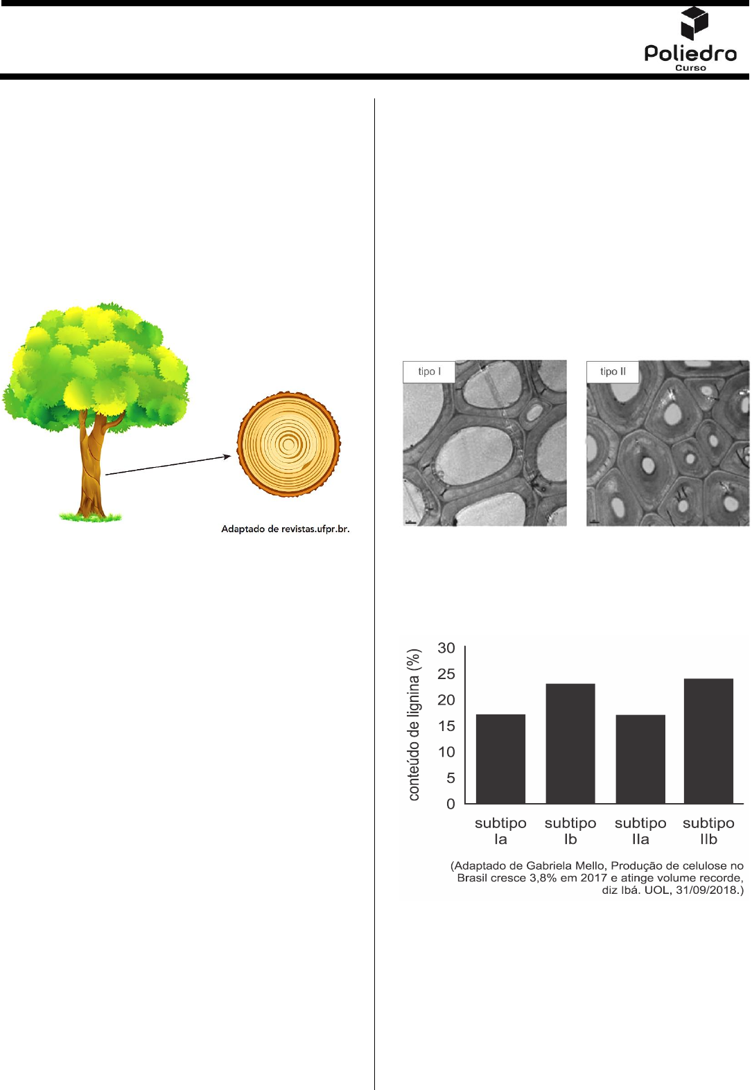 Lista de Exercícios – Aula 16 (Biologia F2) Prof. Dr. Shesterson Aguiar 1 1. (UERJ 2019) A contagem e a análise dos anéis de crescimento presentes nos troncos de árvores e arbustos possibilitam estimar a idade da planta e investigar as condições climáticas de épocas pré-existentes. Sabe-se que a grande disponibilidade de água, durante os períodos úmidos, favorece o crescimento de células com grande calibre, formando anéis claros. Já em períodos mais secos, as células ficam mais compactadas, formando anéis escuros. Observe a ilustração de um corte transversal do tronco de uma árvore, com anéis de crescimento claros e escuros: Indique o tipo de tecido condutor responsável pela formação dos anéis de crescimento. Indique, também, dentre as substâncias químicas presentes nesse tecido, aquela que confere mais rigidez às paredes das células. Aponte, ainda, as duas principais funções desse tecido para os vegetais. 2. (UFRGS 2020) No bloco superior abaixo, estão listadas características de tecidos vegetais; no inferior, estão listados tecidos vegetais. Associe adequadamente o bloco inferior ao superior. 1. Tecido com função de assimilação, formado por células clorofiladas. 2. Responsável por transportar a seiva bruta. 3. Tecido de sustentação das plantas, formado por células mortas. 4. Responsável por transportar a seiva elaborada. ( ) esclerênquima ( ) clorênquima ( ) xilema A sequência correta de preenchimento dos parênteses, de cima para baixo, é a) 1 – 3 – 2. b) 3 – 1 – 4. c) 3 – 2 – 4. d) 1 – 3 – 4. e) 3 – 1 – 2. 3. (UNICAMP 2019) A produção de celulose a partir da madeira vem crescendo no Brasil, tendo atingido um volume recorde em 2017, com exportações de 19,5 milhões de toneladas. As paredes das células da madeira contêm celulose e lignina, sendo que a primeira é o principal composto de interesse industrial, enquanto a segunda é um composto indesejável, que precisa ser removido. Geralmente, a remoção da lignina envolve digestão química com 2H S, um reagente altamente poluente. As imagens apresentadas a seguir são fotos de microscopia eletrônica, em mesma escala, do tecido vegetal de dois tipos de madeira, que diferem com relação à parede celular. Cada tipo (I ou II) tem ainda dois subtipos, a ou b. O gráfico a seguir mostra dados sobre esses subtipos de madeira coletados de plantas cultivadas na mesma área geográfica (solo e clima similares). Considerando que as quatro amostras no gráfico provêm de plantas com o mesmo tempo de desenvolvimento, qual delas seria mais desejável em termos industriais e ambientais (tendo em vista a poluição e a extensão de área plantada)? a) Subtipo Ia. b) Subtipo Ib. c) Subtipo IIa. d) Subtipo IIb. 2 4. (UNICAMP 2017) Ao observar uma célula, um pesquisador visualizou uma estrutura delimitada por uma dupla camada de membrana fosfolipídica, contendo um sistema complexo de endomembranas repleto de proteínas integrais e periféricas. Verificou também que, além de conter seu próprio material genético, essa estrutura ocorria em abundância em todas as regiões meristemáticas de plantas. Qual seria essa estrutura celular? a) Cloroplasto. b) Mitocôndria. c) Núcleo. d) Retículo endoplasmático. 5. (UNB 2019) Todo o crescimento nas plantas se origina de meristemas, que são regiões capazes de adicionar célula ao corpo da planta. Os meristemas apicais e laterais das plantas estão envolvidos, respectivamente, no crescimento dos tecidos a) secundário e apical. b) secundário e de espessamento. c) primário e secundário. d) primário de comprimento. 6. (Santa Casa 2021) A figura ilustra uma árvore cujo tronco foi seccionado. O detalhe mostra os anéis de crescimento produzidos durante 30 anos de vida dessa árvore. (www.nicepng.com. Adaptado.) a) Cite o número que representa o anel de crescimento mais antigo. Qual tipo de clima é mais favorável à formação de um tipo de árvore com anéis de crescimento bem definidos? b) Suponha que alguém tenha feito o desenho de um coração no tronco dessa árvore, a 1 metro do solo, quando ela tinha 10 anos de vida, e que o nível do solo não tenha sido alterado. Aos 30 anos de vida da árvore, a que altura estará o desenho? Justifique sua resposta citando os tecidos vegetais que estão em atividade no tronco da árvore. 7. (PUC Campinas 2021) Nas plantas terrestres, o sistema que proporciona sustentação e também atua na condução é o a) floema. b) xilema. c) meristema. d) parênquima. e) súber. 8. (UFJS-PISM 1 2020) Quando o roteirista e o desenhista se lembram das aulas de botânica... A figura abaixo apresenta personagens fictícios criados por desenhistas da Marvel Comics e que fazem parte dos filmes Guardiões da Galáxia e Guardiões da Galáxia Vol. 2. No primeiro filme, o personagem à esquerda (Groot) morre para salvar os seus amigos. O personagem da direita (também denominado Groot, mas aqui vamos chamá-lo de Baby Groot) estrela o segundo filme e é uma versão baby (bebê) do primeiro. A figura central remete à possível origem de Baby Groot, ou seja, a reprodução vegetativa de Groot (um broto de Groot). a) Observando a figura central, representando o surgimento de uma nova planta, espera-se que o Baby Groot possa se desenvolver num Groot adulto. Nas plantas, como denominam-se os tecidos que dão origem a novos tecidos e onde encontramos esses tecidos nas raízes e caules em crescimento primário? b) Os personagens representam árvores com crescimento secundário e, portanto, desenvolvimento de lenho (madeira) e, além disso, têm um revestimento que os tornam resistentes ao fogo e podem aumentar de tamanhos. Considerando que os criadores e roteiristas dos personagens tenham lembrado das aulas de desenvolvimento das plantas e dos tecidos vegetais, RESPONDA: I) quais tecidos meristemáticos são responsáveis pelo crescimento secundário das árvores? II) qual tecido originado a partir dess