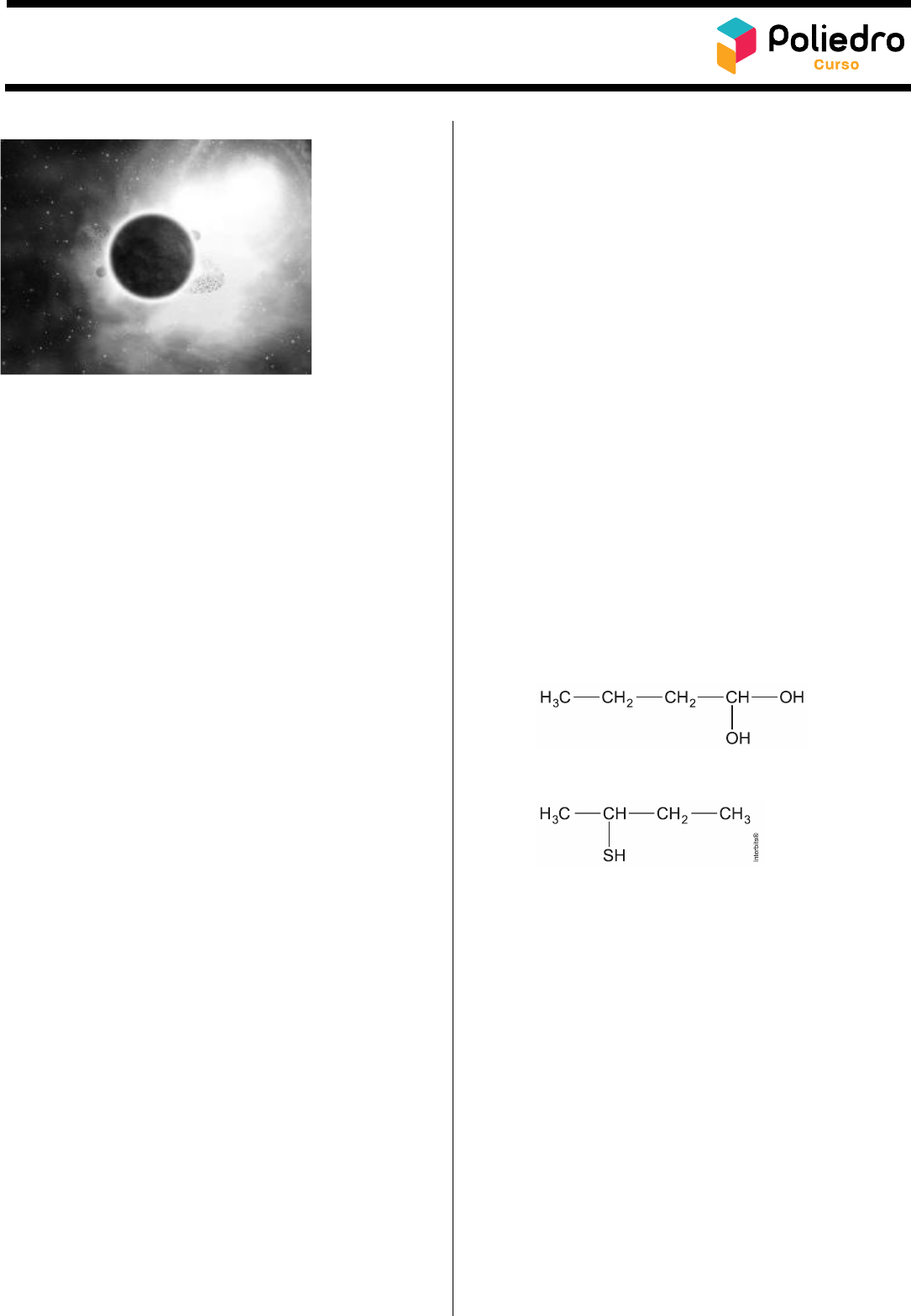 Lista de Revisão #04 | EXT Online Química 1 | Prof. Dr. Eduardo Walneide 1 1. (Ucs 2021) Uma equipe da Organização Europeia de Pesquisa Astronômica no Hemisfério Sul descobriu um exoplaneta um tanto peculiar na constelação de Peixes, a 390 anos-luz da Terra: por lá, “chove” ferro todas as noites! A descoberta do WASP-76b (vide imagem meramente ilustrativa), ocorreu graças ao Very Large Telescope (VLT), situado no deserto do Atacama, no Chile. De acordo com os especialistas, esse fenômeno ocorre porque apenas uma face do planeta fica apontada para sua estrela-mãe. Isso faz com que em um lado do WASP-76b seja sempre dia e no outro sempre noite, já que ele leva muito tempo para girar em torno do próprio eixo. Como a face iluminada recebe milhares de vezes mais radiação de sua estrela-mãe do que a Terra recebe do Sol, as temperaturas no WASP-76b ultrapassam os 2400 C. Consequentemente, o ferro presente na superfície do planeta acaba “literalmente” sublimando. Entretanto, o metal não permanece nessa condição por muito tempo: devido à diferença de temperatura entre as faces do planeta, ventos fortes são gerados e as nuvens carregadas com o metal são levadas para o lado escuro do WASP-76b. Como as temperaturas nesta região estão por volta dos 1500 C, a nuvem ultraquente acaba resfriando um pouco, o que já é suficiente para provocar a “precipitação” do ferro no estado sólido. De acordo com os astrônomos, a descoberta só foi possível graças ao ESPRESSO, um instrumento do VLT que ajuda os especialistas a monitorar a atmosfera de exoplanetas. “O que temos agora é uma maneira totalmente nova de rastrear o clima desses planetas”, declarou David Ehrenreich, líder do estudo. Disponível em: https://revistagalileu.globo.com/Ciencia/Espaco/noticia/2020/03/chove- ferro-todas-noites-neste-planeta-da-constelacao-de-peixes.html. Acesso em: 17 mar. 2020. (Parcial e adaptado.) Em relação aos átomos que constituem o elemento químico mencionado no texto acima, é correto afirmar que Dados: Fe (Z 26).= a) possuem, no estado fundamental, vinte e seis elétrons distribuídos em cinco níveis de energia. b) apresentam, no estado fundamental, apenas elétrons em subníveis s e p. c) apresentam, no estado fundamental, elétrons de maior energia em subníveis p. d) originam cátions de configuração eletrônica 5[Ar] 3d , ao perderem três elétrons. e) têm, no estado fundamental, doze elétrons nas suas respectivas camadas de valência. 2. (Ueg 2021) Um dos grandes desafios enfrentados pela Química, como ciência, foi desvendar a estrutura da matéria. O assunto foi discutido desde a Grécia antiga, por filósofos como Leucipo e Demócrito, que apresentaram hipóteses sobre a constituição da matéria. No entanto, foi somente no ano de 1803 que o inglês John Dalton (1766-1844) retomou as ideias originais dos filósofos atomistas, no desenvolvimento do seu modelo atômico, baseado em resultados experimentais, que auxiliaram na comprovação de suas hipóteses. Porém, no método científico, cada modelo atômico proposto manteve a sua validade, até que alguma evidência experimental o contradissesse. Dessa forma, com relação ao modelo atômico de Dalton, o principal fato científico que o levou a ser abandonado foi: a) a comprovação da natureza elétrica da matéria, com a descoberta do elétron. b) o espalhamento das partículas alfa, realizado por Ernest Rutherford. c) a explicação dos espectros de emissão atômica. d) a divisăo do átomo em núcleo e eletrosfera. e) a descoberta da dualidade onda-partícula. 3. (Uece 2020) Um exemplo de tiol importante é o butan-1-tiol que é adicionado ao gás de cozinha. O gás de cozinha é fundamentalmente formado pelos gases butano e propano, que não possuem cheiro. A presença do butan-1-tiol faz com que se sinta o cheiro quando há algum vazamento de gás, o que evita a ocorrência de acidentes. Assinale a opção que corresponde à fórmula estrutural desse composto. a) b) 3 2 2 2H C CH CH CH SH− − − − c) 3 2 2 2H C CH SH CH OH− − − − d) 4. (Uece 2020) Os compostos orgânicos são formados por átomos de carbono cujas estruturas agrupam as substâncias com características semelhantes e, portanto, pertencem a grupos identificados pelas funções orgânicas. No que diz respeito a funções orgânicas, assinale a afirmação verdadeira. a) O grupo funcional dos ácidos carboxílicos é denominada carbonila. b) Ésteres orgânicos são compostos em que o oxigênio está diretamente ligado a duas cadeias carbônicas. c) Amidas são compostos derivados teoricamente do 3NH pela substituição de um hidrogênio por um grupo acila. d) Álcoois são compostos orgânicos que contêm um ou mais grupos oxidrila ligados diretamente a átomos de carbono insaturados. 5. (Uel 2020) Uma criança, que participava de uma oficina de pintura em um museu, atingiu, acidentalmente, com tinta à base de óleo uma tela pintada com tinta à base de água. Como praticamente toda a tela foi manchada com pequenas gotículas de tinta, a restauração da obra exige cautela. Neste caso, pode-se utilizar microvolumes de solventes extratores capazes de dissolver a tinta à base de óleo, mas não a tinta à base de água. Para a obtenção desses solventes, empregam-se misturas ternárias constituídas de solvente extrator (responsável pela dissolução da tinta à base de óleo), solvente dispersor e água. O 2 solvente dispersor deve ser miscível no solvente extrator e na água, mas a água não deve ser miscível no solvente extrator. Esse tipo de mistura, quando borrifada sobre a superfície da tela, forma nanogotas do solvente extrator e, por consequência, melhora a eficiência do processo de dissolução da tinta à base de óleo. Com base nos conceitos de forças intermoleculares e miscibilidade e considerando que a quantidade de água na mistura ternária é incapaz de dissolver a tinta à base de água, assin