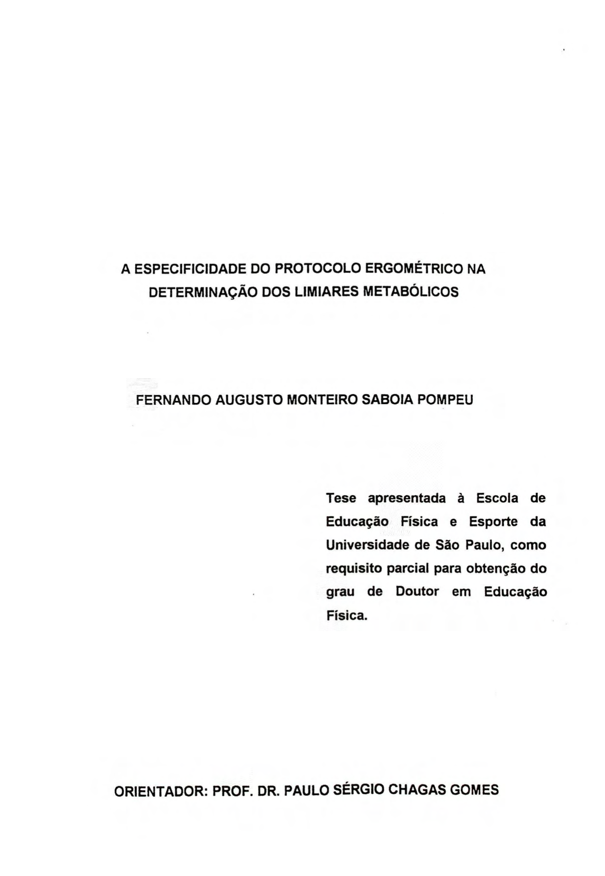 A ESPECIFICIDADE DO PROTOCOLO ERGOMÉTRICO NA DETERMINAÇÃO DOS LIMIARES METABÓLICOS FERNANDO AUGUSTO MONTEIRO SABOIA POMPEU Tese apresentada à Escola de Educação Física e Esporte da Universidade de São Paulo, como requisito parcial para obtenção do grau de Doutor em Educação Física. ORIENTADOR: PROF. DR. PAULO SÉRGIO CHAGAS GOMES Pompeu. Fernando Augusto Monteiro Saboia A especificidade do protocolo ergométrico na aeterminação dos limiares metabóiicos / Fernando Augusto Monteiro Saboia Pompeu. - São Paulo : [s.n.], 2000. xxiii. 274p. Tese (Doutorado) - Escola de Educação Física e Esporte da Universidade de São Paulo. Orientador: Prof.Dr. Paulo Sérgio Chagas Gomes. 1. Fisiologia do exercício 2. Metabolismo I. Título. ii AGRADECIMENTOS Tese dedicada ao mentor e amigo Dr. Aluysio Soreano Aderaldo Júnior por dispor de uma pequena parte de sua vasta cultura e treinamento profissional para aperfeiçoar este trabalho. Como também, pelo seu empenho na montagem do laboratório de ergoespirometria, sem o qual este estudo não poderia ser concluído. • Agradeço ao meu orientador Prof. Dr. Paulo Sérgio Chagas Gomes pela valiosa contribuição acadêmica • À minha esposa Claudia A. da Silva Pompeu pela dedicação, colaboração e preocupação com a conclusão deste projeto • Ao prof. Marcelo Neves dos Santos pela colaboração na coleta dos dados • Aos alunos da Escola de Educação Física e Desportos da Universidade Federal do Rio de Janeiro que participaram deste estudo • À Fundação Universitária José Bonifácio (FUJB/UFRJ) pelo auxílio recebido para viabilizar este projeto. • À Associação dos Amigos do Centro de Estudos e Aperfeiçoamento do Hospital dos Servidores do Estado na pessoa do Dr. Francisco Sales pelo importante apoio • À Clínica da Dor do Hospital dos Servidores do Estado - R.J. na pessoa do Dr. Marcos Henrique Manzoni pela valiosa colaboração • Ao Instituto de Patologia Clínica e ao Dr. Aloysio Leal Rebello pela dosagem das catecolaminas • À Preciso Ltda pela doação dos reagentes para gasometria e suporte técnico • Aos meus filhos Gilberto, Sunny e Carolina e a minha mãe Anamaria pelo valioso incentivo iii SUMÁRIO Página LISTA DE TABELAS................................................. LISTA DE FIGURAS................................................. LISTA DE QUADROS............................................... LISTA DE SIGLAS, ABREVIATURAS E SÍMBOLOS LISTA DE ANEXOS................................................... LISTA DE APÊNDICES............................................. DEFINIÇÕES DE TERMOS ADOTADOS................. RESUMO................................................................... ABSTRACT................................................................ INTRODUÇÃO........................................................... OBJETIVO.................................................................. JUSTIFICATIVA......................................................... QUESTÕES A INVESTIGAR................................... DELIMITAÇÕES......................................................... LIMITAÇÕES.............................................................. HIPÓTESES............................................................... Hipótese substantiva................................................. 7.2 Hipóteses estatísticas................................................ REVISÃO DA LITERATURA..................................... 8.1 Introdução.................................................................. 8.2 Degradação e síntese da adenosina trifosfato........ 8.2.1 Etapa extramitocondrial............................................ 8.2.1.1 Glicólise e glicogenólise.......................................... 8.2.2 Etapa intramitocondrial............................................ 8.3 Metabolismo hepático............................................... 8.4 Regulação do metabolismo de carboidratos........... vi x XIII XIV XVII XVIII XIX XXI XXIII 11 42 63 74 85 96 97 97.1 9 118 11 12 12 15 16 28 31 IV 408.5 Tipo de fibra muscular e metabolismo.......................................... 8.6 Tampões fisiológicos e equilíbrio ácido-base............................... 8.7 Transporte do lactato pela membrana plasmática....................... 8.8 Fatores que influenciam a lactacidemia no pós-esforço............. 8.9 Modelos teóricos de limiar anaeróbio........................................... 8.9.1 Limiar anaeróbio de WASSERMAN et aiii (1964)........................ 8.9.2 Limiar anaeróbio de MADER et alii (1976)................................... 8.9.3 Limiar anaeróbio de STEGMANN & KINDERMANN (1982)........ 8.10 Adaptações ao treinamento de endurance.................................. 8.11 Métodos indiretos de inferência dos limiares metabólicos......... 8.12 As principais variáveis metodológicas envolvidas..................... 8.13 Implicações no treinamento aeróbio............................................. MATERIAL E MÉTODOS.............................................................. 9.1 Critério de inclusão e exclusão dos sujeitos............................... 9.2 Testes de esforço......................................................................... 9.2.1 Procedimentos gerais................................................................... 9.2.2 Teste de potência aeróbia máxima............................................. 9.2.3 Protocolo de WASSERMAN et alii (1973).................................... 9.2.4 Protocolo de MADER et alii (1976)............................................... 9.2.5 Protocolo de STEGMANN & KINDERMANN (1982).................... 9.2.6 Cálculo da eficiência mecânica.................................................... 9.2.7 Consumo extra de oxigênio no segundo minuto de pós-esforço 9.2.8 Máximo steady state do lactato.................................................... 9.3 Coleta e análise dos