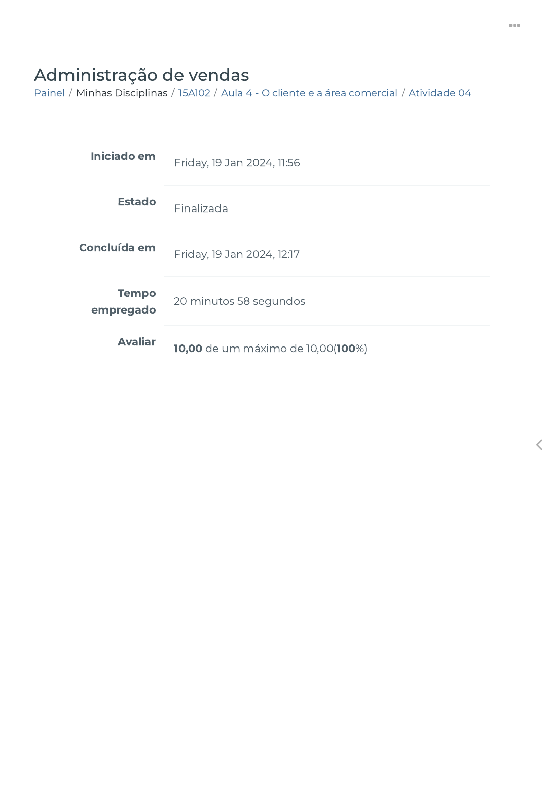 19/01/24, 12:17 Atividade 04 https://ava.politecnicabr.com.br/mod/quiz/review.php?attempt=6192975 1/7 Painel / Minhas Disciplinas / 15A102 / Aula 4 - O cliente e a área comercial / Atividade 04 Administração de vendas Iniciado em Friday, 19 Jan 2024, 11:56 Estado Finalizada Concluída em Friday, 19 Jan 2024, 12:17 Tempo empregado 20 minutos 58 segundos Avaliar 10,00 de um máximo de 10,00(100%) https://ava.politecnicabr.com.br/my/ https://ava.politecnicabr.com.br/my/ https://ava.politecnicabr.com.br/course/view.php?id=861 https://ava.politecnicabr.com.br/course/view.php?id=861#section-5 https://ava.politecnicabr.com.br/mod/quiz/view.php?id=22904 https://ava.politecnicabr.com.br/ 19/01/24, 12:17 Atividade 04 https://ava.politecnicabr.com.br/mod/quiz/review.php?attempt=6192975 2/7 Questão 1 Correto Atingiu 1,00 de 1,00 Segundo Engel, Blackwell e Miniard (2000), o consumidor �nal que pode ser pessoa física ou jurídica, pode passar por cinco etapas na compra de um produto ou serviço. Quais das alternativas abaixo não faz parte destas etapas? Escolha uma opção: Questão 2 Correto Atingiu 1,00 de 1,00 É correto a�rmar que uma das etapas de compra é o “reconhecimento do problema”, que consiste na percepção da necessidade em relação a determinado produto ou serviço. Escolha uma opção: a. Comportamento pós-compra. b. Busca de informações. c. Veri�cação do produto/serviço. d. Avaliação de alternativas. e. Decisão de compras. Verdadeiro Falso https://ava.politecnicabr.com.br/ 19/01/24, 12:17 Atividade 04 https://ava.politecnicabr.com.br/mod/quiz/review.php?attempt=6192975 3/7 Questão 3 Correto Atingiu 1,00 de 1,00 Compra pro�ssional ocorre em organizações é desempenhado principalmente por pro�ssionais treinados para trabalhar nas atividades de compra e de consumo, é mais racional do que o processo de decisão individual e familiar. Escolha uma opção: Questão 4 Correto Atingiu 1,00 de 1,00 Moreira (2000) apresentam algumas situações de compra organizacional que são: Escolha uma opção: Verdadeiro Falso a. recompra velha, recompra modi�cada, e compra nova b. recompra direta, recompra nova, e compra velha c. recompra direta, recompra modi�cada, e compra nova d. recompra indireta, recompra modi�cada, e compra velha https://ava.politecnicabr.com.br/ 19/01/24, 12:17 Atividade 04 https://ava.politecnicabr.com.br/mod/quiz/review.php?attempt=6192975 4/7 Questão 5 Correto Atingiu 1,00 de 1,00 A recompra direta necessita de uma busca intensa de informações e um processo de decisão mais cuidadoso e demorado (não rotineiro). Escolha uma opção: Questão 6 Correto Atingiu 1,00 de 1,00 O marketing de relacionamento de�nido como um processo de engajamento que estabelece, desenvolve e mantém relacionamentos cooperativos a longo prazo mutuamente bené�cos entre a empresa e seus públicos, principalmente clientes. Escolha uma opção: Verdadeiro Falso Verdadeiro Falso https://ava.politecnicabr.com.br/ 19/01/24, 12:17 Atividade 04 https://ava.politecnicabr.com.br/mod/quiz/review.php?attempt=6192975 5/7 Questão 7 Correto Atingiu 1,50 de 1,50 Para se obter durabilidade dos relacionamentos através de compromissos mútuos, de demonstrações de con�ança mútua e de compreensão recíproca, Hunt, Arnett eMadhavaram (2006) estabelecem algumas estratégias baseadas em relacionamentos. Das opções abaixo marque o fator que não faz parte destas estratégias. Escolha uma opção: a. Fatores relacionais b. Fatores relacionados às ofertas do mercado c. Fatores relacionados ao uso de recursos das partes d. Fatores relativos às políticas públicas e legislação e. Fatores geográ�cos https://ava.politecnicabr.com.br/ 19/01/24, 12:17 Atividade 04 https://ava.politecnicabr.com.br/mod/quiz/review.php?attempt=6192975 6/7 Questão 8 Correto Atingiu 1,00 de 1,00 Em relação aos fatores relacionados às ofertas do mercado, podemos a�rmar que consistem em qualidade, inovação, customização das ofertas, valor da marca, valor do cliente e valor para o cliente. Escolha uma opção: Questão 9 Correto Atingiu 1,50 de 1,50 Qual das alternativas não faz parte dos direitos básicos do consumidor? Escolha uma opção: Verdadeiro Falso a. Informação b. Proteção da vida e da saúde c. Liberdade de escolha de produtos e serviços d. Educação para o consumo e. Proteção contra insatisfação https://ava.politecnicabr.com.br/ 19/01/24, 12:17 Atividade 04 https://ava.politecnicabr.com.br/mod/quiz/review.php?attempt=6192975 7/7 © 2022 - Escola Politécnica Brasileira Entre em Contato https://www.politecnicabr.com.br 0800 084 2627 0800 084 2627 Links Úteis Dicas da nossa Diretora Acadêmica Planner de Estudos Declaração de Matrícula Orientações do AVA Abertura de Ticket Fale com o Tutor Cronograma de Estudos Manual de Estágio Manual de Competência Siga-nos nas redes sociais https://ava.politecnicabr.com.br/mod/quiz/0 https://ava.politecnicabr.com.br/mod/quiz/0 https://www.politecnicabr.com.br/ https://soundcloud.com/user-501638417/sets/escola-politecnica-brasileira https://soundcloud.com/user-501638417/sets/escola-politecnica-brasileira https://storage.googleapis.com/sirius-pubstore/semestre_plannerdeestudo%20poli.pdf https://storage.googleapis.com/sirius-pubstore/semestre_plannerdeestudo%20poli.pdf https://storage.googleapis.com/sirius-pubstore/declaracao_matricula.pdf https://storage.googleapis.com/sirius-pubstore/declaracao_matricula.pdf https://storage.googleapis.com/sirius-pubstore/orientacoes_ava.pdf https://storage.googleapis.com/sirius-pubstore/orientacoes_ava.pdf https://storage.googleapis.com/sirius-pubstore/abertura_ticket.pdf https://storage.googleapis.com/sirius-pubstore/abertura_ticket.pdf https://storage.googleapis.com/sirius-pubstore/fale_com_tutor.pdf https://storage.googleapis.com/sirius-pubstore/fale_com_tutor.pdf https://storage.googleapis.com/sirius-pubstore/cronograma_estudos.pdf https://storage.googleapis.com/sirius-pubstore/cr