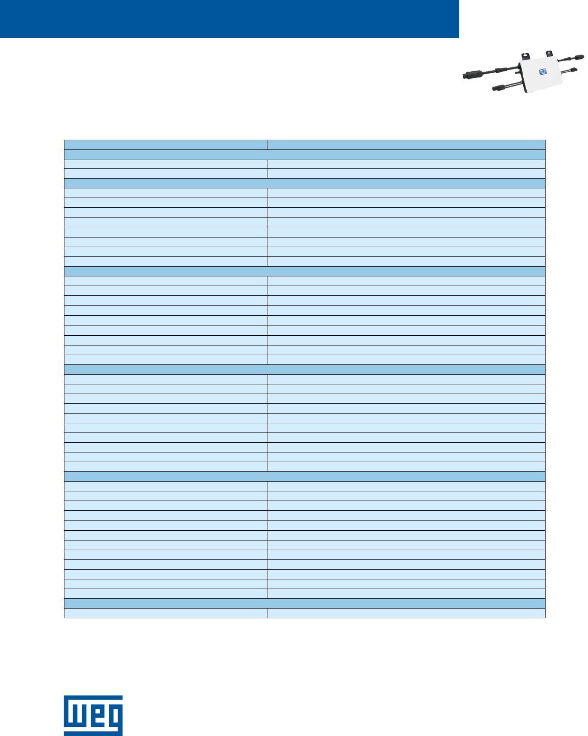 SIW100G M010 W00 EFICIÊNCIA Eficiência máxima 95,60% Eficiência ponderada européia 95,10% ENTRADA Potência de entrada mínima / máxima 1 x 320 Wp / 2 x 670 Wp Tensão de entrada máxima 60 V Tensão de partida 24 V Faixa de tensão MPPT em máxima potência 31 V ~ 45 V Corrente de entrada máxima por MPPT 20 A Corrente máxima de curto-circuito por MPPT 24 A Número de MPPTs 2 Número de entradas por MPPT 1 SAÍDA Conexão à rede Monofásica Potência nominal de saída 1.000 W Potência aparente máxima 1.000 VA Faixa de tensão de rede 180 ~ 275 V Tensão de saída nominal 230 V (F-F ou F-N) Frequência de rede nominal 50 Hz / 60 Hz Corrente de saída máxima 4.54 A Fator de potência 1 Distorção harmônica total máxima ≤ 3 % PROTEÇÕES Proteção anti-ilhamento Sim Proteção contra polaridade CC invertida Sim Monitoramento da isolação Sim Monitoramento de correntes residuais Sim Supressor de surto CC / CA Tipo II / Tipo II Proteção contra sobrecorrente CA Sim Proteção contra curto-circuito CA Sim Proteção contra sobretensão CA Sim Proteção de sobrecorrente CC Topologia Fuseless Proteção contra sobretemperatura Sim GERAL Faixa de temperatura de operação -25 ~ 60ºC Umidade relativa de operação 0% ~ 100% (sem condensação) Resfriamento Convecção natural Display WIFI + APP Comunicação WIFI (Mesh) Peso (incluindo suporte de montagem) 4 kg Consumo Stand-by < 50 mW Dimensão (incluindo suporte de montagem) 270 x 182 x 34.5 mm Grau de proteção IP67 Modo de operação On-Grid Topologia Isolamento Duplo Conexão CC / CA MC4 Compatível / Conector REGULAMENTAÇÃO Rede, EMC e Segurança PORTARIAS INMETRO 140/2022 e 515/2023 Nova solução MLPE da WEG. Máxima performance e geração para cada módulo, mesmo em situações de altas temperaturas, diferentes orientações de telhado, ou até sombreamentos parciais dos arranjos de módulos. A segurança e confiabilidade WEG de sempre, agora neste novo formato. Com 1000 W de saída, possuem duas entradas para módulos de até 20 A e 670 Wp. DPS CC e CA do tipo II, proteção RAPID SHUTDOWN e topologia FUSELESS. SIW100G M010 W00 MICROINVERSOR ON-GRID MONOFÁSICO Nota: As especificações e os recursos principais contidos nesta folha de dados podem divergir ligeiramente de nossos produtos reais devido a inovação e aprimoramento contínuo dos produtos. A WEG S.A. reserva-se o direito de fazer os ajustes necessários à informações aqui descritas a qualquer momento sem aviso prévio. Grupo WEG - Automation Business Unit Jaraguá do Sul - SC - Brazil Phone: +55 47 3276 4000 automacao@weg.net www.weg.net