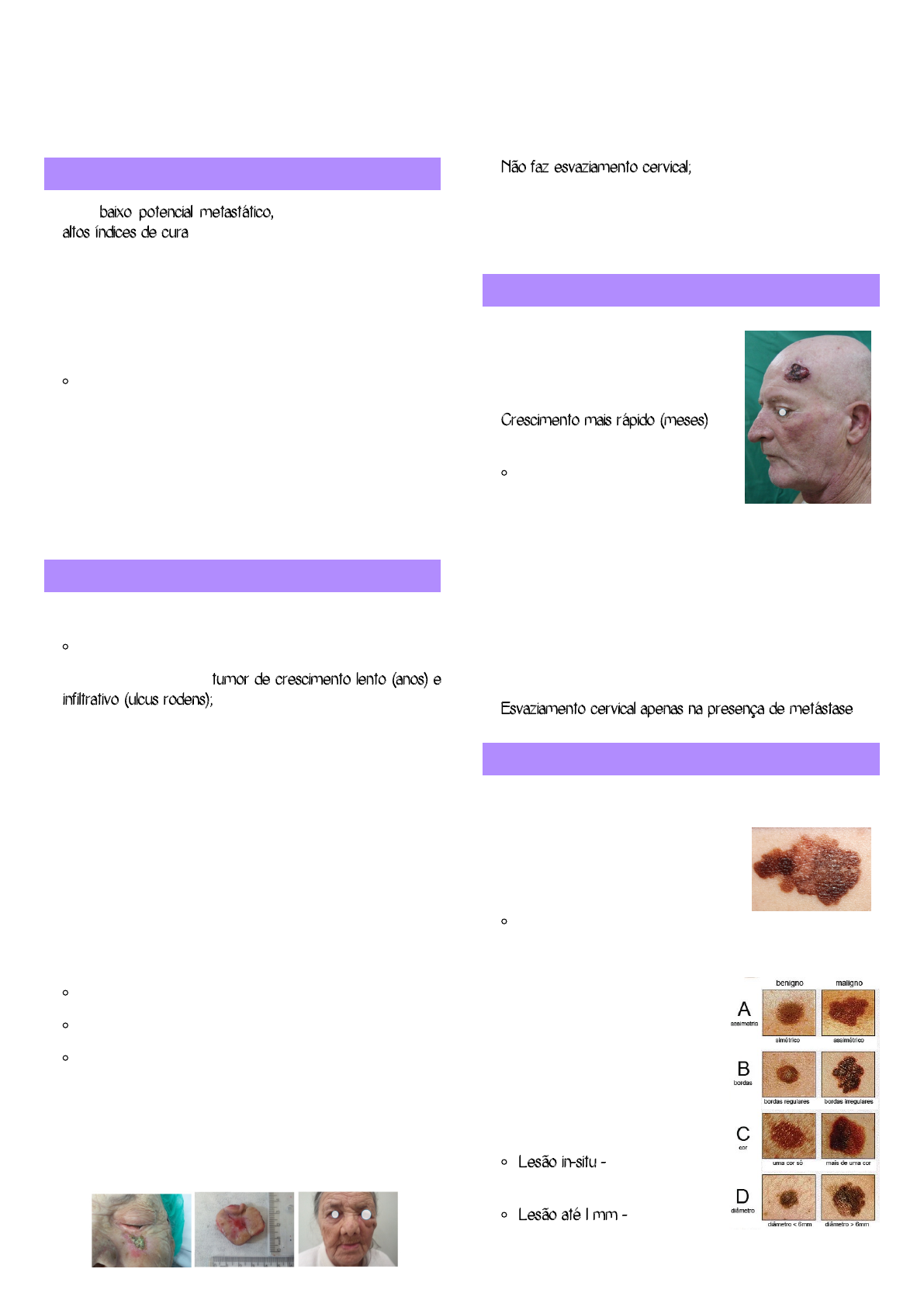 Universidade Nove de Julho Maria Lívia Introdução: • Com baixo potencial metastático, os tumores de pele têm altos índices de cura; • Mais de 80% na região de cabeça e pescoço. Etiologias: • Hereditário - tipos de pele + história familiar; Pessoas brancas tem maior propensão a desenvolver. • Expição Solar - infância e adolescência; • Outros fatores são - imunossupressão, síndromes genéticas (xeroderma pigmentoso, epidermodisplasia verruciforme, exposição a radiação, arsênico); • Conduta - realizar biópsia incisional e exames pré-operatórios Carcinoma basocelular: • Câncer mais frequente dos humanas - 95% cura; Quase nunca metastiza. • A partir da 6ª década - tumor de crescimento lento (anos) e infiltrativo (ulcus rodens); Quadro Clínico: • Subtip - nodular, superficial, micronodular, metatípico e esclerodermiforme; • Aparência - nódulo róseo-perolado, brilhante com presença de teleangiectasias nas bordas; • Localização - nariz, malar, pálpebra, couro cabeludo, sulco nasogêniano; • CBC Agrsivo - idade menos avançada; Subtipo esclerodermiforma e metatípico; Sulco de fusão embrionária; Zona H. Tratamento: • Padrão-Ouro - exérese com margem, congelação intra- operatória e reconstrução; • Não faz esvaziamento cervical; • Várias propostas de tratamento - curetagem, QT tópica, terapia fotodinâmica, excisão, eletrocoagulação, cirurgia micrográfica de Mohs. Carcinoma espinocelular: • 20-30% dos tumores de pele; • Lão Precursora - queratose actínica; • Crescimento mais rápido (meses) se comparado com CBC; Metástase linfática - em torno de 10% dos casos. • Aparência - placa ou nódulo, com ulceração, infiltrativos, bordas pouco nítidas, com halo de hiperemia em torno. Tratamento: • Padrão-Ouro - exérese com margem, congelação intra- operatória e reconstrução; • Esvaziamento cervical apenas na presença de metástase. Melanoma: • Pode acontecer em qualquer faixa etária; • Melanócit - crista neural -> produz melanina; • 4% - tumor de pele que mais mata; Alta capacidade metastática. Quadro Clínico: • Aparência - assimétrico, com bordas irregulares, cores múltiplas e diâmetro > 6mm; • Conduta de Acordo com Brlow (profundidade) - biópsia excisional; Lesão in-situ - 0,5 cm de margem de segurança; Lesão até 1 mm - 1 cm de margem de segurança; Tumores de Pele Tumores de Pele Universidade Nove de Julho Maria Lívia Lesão de 1 a 2 mm - 1 a 2 cm de margem de segurança; Lesão de 2 a 4 mm - 2 cm de margem de segurança; Lesão > 4 mm - 2 ou + cm de margem. Tratamento: • Esvaziamento Cervical - só com metástases (macro ou micro); • Linfonodo Sentinela - primeiro linfonodo que drena uma determinada região, indicação: Indicado em melanomas com mais de 1mm de Breslow (profundidade); Sem macro-metástases - palpável; Melanomas menor que 1mm (profundidade), se ulceração; Índice mitótico > 0 - faz parte do relatório anatomo- patológico e tem importância no estadiamento. Eadiamento: • T1 - até 1 mm; A - sem ulceração; B - ulcerado, ou com índice mitótico > 0. • T2 - 1 a 2 mm; A - sem ulceração; B - ulcerado. • T3 - 2 a 4 mm; A - sem ulceração; B - ulcerado. • T4 - > 4 mm; A - sem ulceração; B - ulcerado.