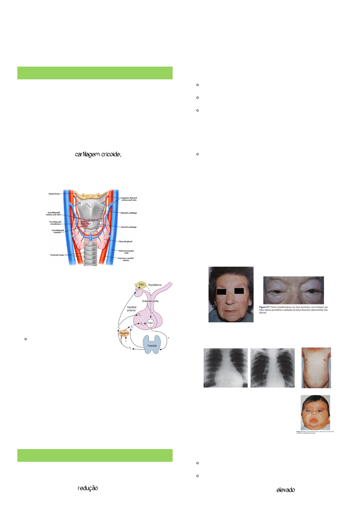 Universidade Nove de Julho Maria Lívia Introdução: • Tireoide é um glândula; • Distúrbios de tireoide são doenças muito prevalentes - hipotireoidismo e hipertireoidismo; • Bócio - aumento do volume tireoidiano. Anatomia: • Localizada abaixo da cartilagem cricoide; • 3 saliências - proeminência laríngea -> cartilagem cricoide -> istmo da tireoide. Fisiologia: • Hipotálamo -> TRH -> adeno- hipófise -> TSH -> tireoide -> T3 e T4 (exercem feedback negativo na hipófise e no hipotálamo); A principal fonte de T3 é a conversão periférica de T4 em T3 sob demanda. • Autoegulação - toda vez que ocorre uma alteração na quantidade de iodo (excesso) a tireoide reduz sua capacidade funcional, diminuindo a secreção de hormônios tireoidianos; • Captação; • Oxidação; • Organificação; • Acoplamento. Hipotireoidismo: Definiçõ: • Clínica decorrente da redução dos hormônios tireoidianos; • Claificação: Primário - problema na tireoide; Secundário - problema na hipófise; Terciário - problema no hipotálamo. • Etiologias - tireoidite de Hashimoto, tireoidectomias, tratamento do hipertireoidismo, medicamentos, deficiência de iodo, irradiação; Amiodarona - pode interferir na função treoidiana por ter excesso de iodo. Quadro Clínico: • Sonolência, fadiga, constipação; • Unhas quebradiças e queda de cabelos, pele seca; • Ganho de peso DISCRETO - não é causa de obesidade; • Alteração de memória - demência e mimetiza depressão; • Fáci Mixedemata - inchação, palidez, edema periorbital e rarefação do terço distal das sobrancelhas (madarose); • Deam Cavitári - ascite, derrame pericárdico; • Hipotiridismo Congênito - alteração cognitiva importante se não tratado no início. Diagnóico: • Laboratorial - TSH, T4 livre e T3 total, anti TPO; TSH dosado para rastreio - mais sensível; Anti TPO - não costuma pedir. • Hipotiridismo Primário - TSH elevado e T3/T4 reduzido; Doenças da tireoide Doencas da Tireoide Universidade Nove de Julho Maria Lívia • Hipotiridismo Central - TSH baixo, normal ou mesmo discretamente elevado, T3/T4 reduzidos; Tratamento: • Medicamento - Levotiroxina; O uso de T3 não está indicado. • Seguimento: Hipotireoidismo Primário - dosagem de TSH e ajuste de dose conforme TSH; Hipotireoidismo Central - dosagem de T4L e ajuste de dose conforme o T4L. Hipotiridismo Subclínico: • Definição - TSH aumentado, T3/T4 normais; • Quando Tratar: TSH > 10 mUI/L em < 85 anos; Mulher em idade fértil querendo engravidar*. • Considerar Tratar: TSH ≥ 7.0 mUI/L; Sintomáticos; Alto risco de progressão ao hipo franco; Alto risco cardiovascular. Hipertireoidismo: Definiçõ: • Clínica decorrente do aumento dos hormônios tireoidianos; • Claificação: Primário - problema na tireoide; Secundário - problema na hipófise Terciário - problema no hipotálamo. • Etiologias Hipertiridismo Primário - doença de Graves, bócio multinodular tóxico ou nodular tóxico. Quadro Clínico: • Tremores, palpitações, perda de peso e de massa magra; • Osteoporose, fraqueza proximal; • Sudorese, hiper-hidrose, pele pegajosa; • Intolerância ao calor; • Dermopatia infiltrativa, hipermenorragia; • Dnça de Grav - bócio difuso, proptose e retração palpebral bilaterais; • Unhas de Plummer (onicólise) - separação da unha do leito ungueal. • PA Divergente - PAS aumenta e PAD diminuída; Aumento de receptores ß-1 no coração - aumento FC e força de contração (PAS aumenta); Aumento de receptores beta-2 no pulmão e nos vasos sanguíneos - vasodilatação -> resistência vascular periférica diminui -> PAD diminui. Diagnóico: • Laboratorial - TSH, T4 livre e T3 total, anti TPO/TRAb; TSH dosado para rastreio - mais sensível; Anti TPO - não costuma pedir. • Imagem - USG tireoide, cintilografia com iodo. Dnça de Grav: • Doença autoimune - anticorpos estimuladores do receptor do TSH; • Mais comum em mulheres jovens; • Principal causa de hipertireoidismo; • Clínica - hipertireoidismo, bócio, oftalmopatia, dermopatia; Dermopatia - aspecto “casca de laranja”. • Diagnóico: TSH supresso, T3T/T4L elevados, TRAb positivo (95% dos casos); Quadro Adrenérgico - apesar da tireoide não secretar adrenalina, o hormônio tireoidiano aumenta a expressão de receptores beta, provocando esse quadro clínico. Universidade Nove de Julho Maria Lívia USG tireoide - aumento difuso, com fluxo sanguíneo aumentado; Cintilografia - aumento difuso da captação de iodo. • Tratamento - ß-bloqueadores, tionamidas (metimazol ou propiltiouracil), radioiodo, cirurgia; Metimazol - tratamento de escolha; Propiltiouracil - grávidas (menos teratogênico) e em casos de crise tireotóxica; Ambos bloqueiam a síntese hormonal tireoidiana e com efeito imunomodulador - reduz quantidade de TRAb. Bócio Nodular Tóxico: • Produção autônoma do hormônio tireoidiano; • Mutação somática ativadora; • Clínica - hipertireoidismo, nódulo tireoidiano; • Diagnóico: TSH supresso, T4L/T3T elevados, anticorpos negativos; USG tireoide - nódulo em tireoide; Cintilografia - captação nodula única com inibição do restante do parênquima. • Tratamento - ß-bloqueadores, tionamidas (metimazol ou propiltiouracil), radioiodo, cirurgia. Bócio Multinodular Tóxico: • Normalmente, em áreas carentes em iodo; • Surgimento e crescimento de nódulos; • Adquirem certa autonomia; • Principal causa de hipertireoidismo em idosos; • Clínica - hipertireoidismo, múltiplos nódulos*; • Diagnóico: TSH supresso, T4L/T3T elevados, anticorpos negativos; USG tireoide - múltiplos nódulos em tireoide; Cintilografia - captação nodular difusa. • Tratamento - ß-bloqueadores, tionamidas (metimazol ou propiltiouracil), radioiodo, cirurgia. Tireotoxicose: • Tireoidites, tireotoxicose factícia (medicamentos), Struma ovarii - causas sem hipertireoidismo; Tiridite Aguda: • Sinônim - su